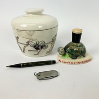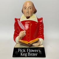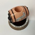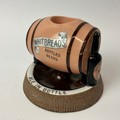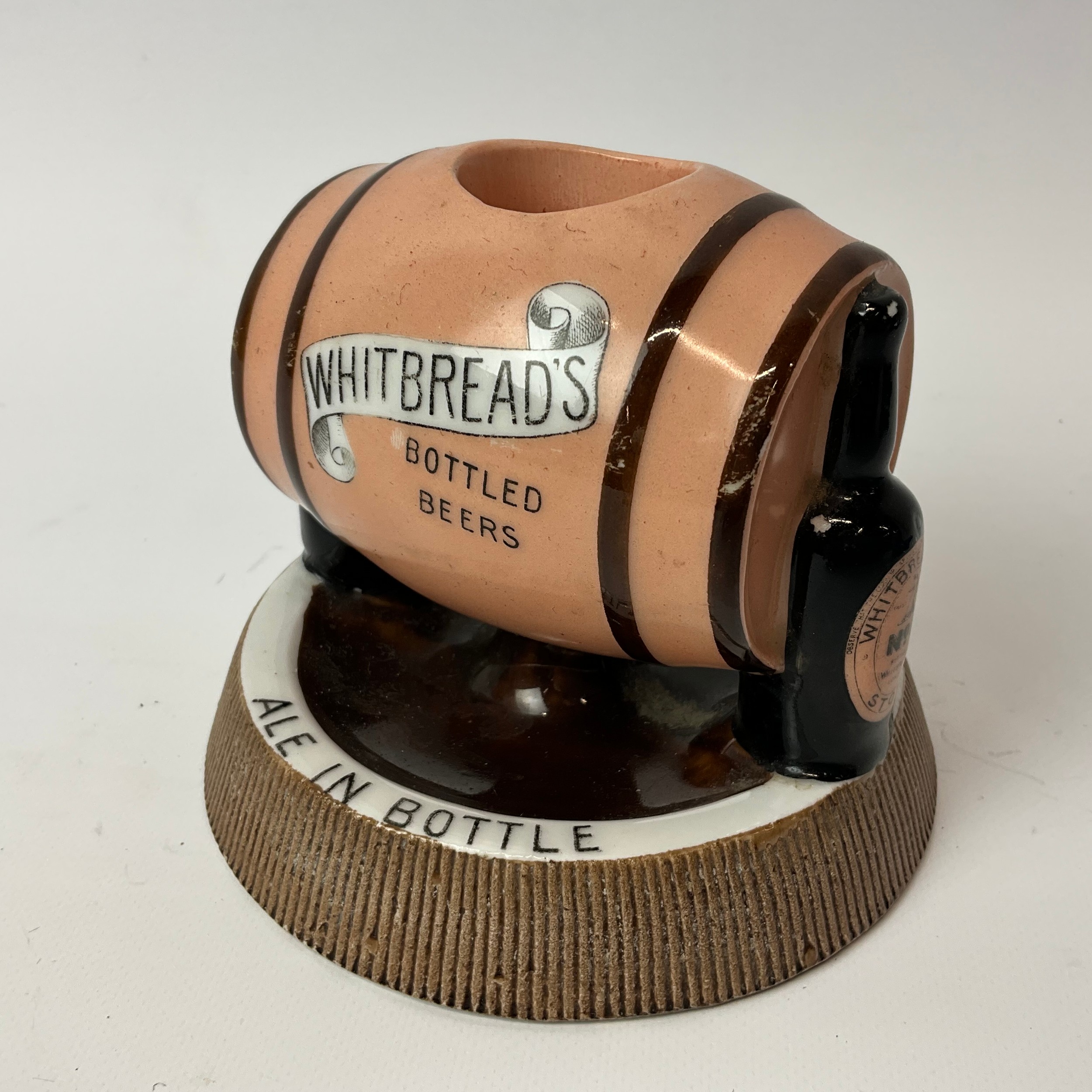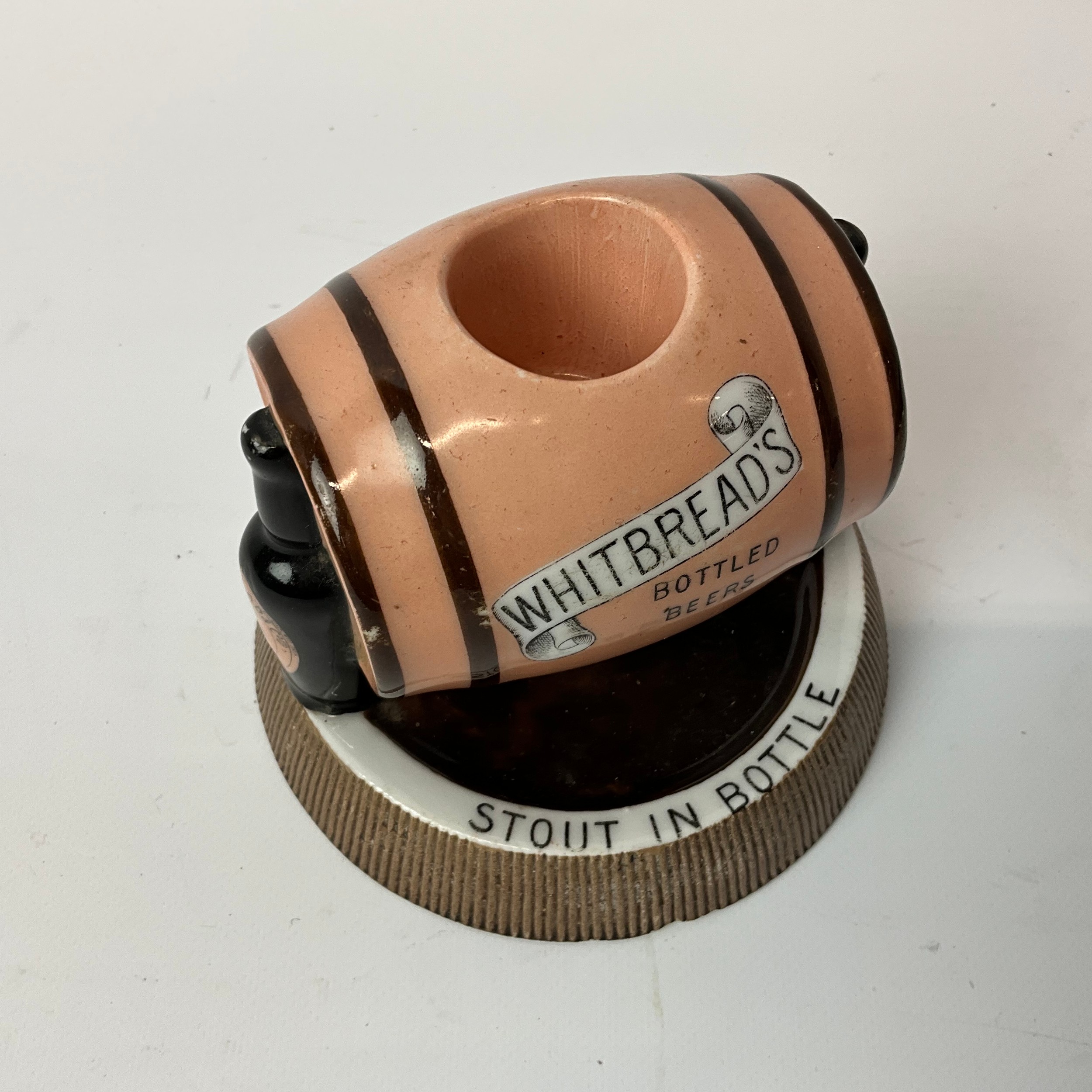 Whitbread's Bottled Beers ceramic match holder and striker in the form of a barrel, flanked by a pair of bottled stouts, barrel marked 'Whitbread's Bottled Beers' with 'Stout in Bottle' and 'Ale in Bottle' to the top of the base. H10cm W12.5cm.
