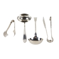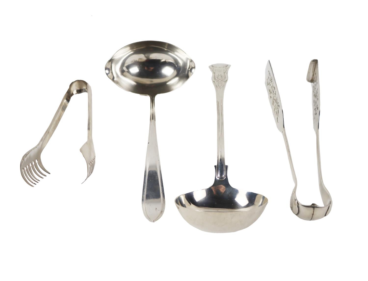 Silverware: A Dutch silver boat shaped Ladle, c. 1930, approx. 7 ounces; a fine quality Victorian Kings pattern silver Ladle, London, Chawner & Co., 1861, approx. 10 ounces; a French floral pierced design Asparagus Tongs, with monogram Odiot (Paris), a Peruvian silver comb design Pastry Tongs, approx. 2 ounces, as a lot. (4)