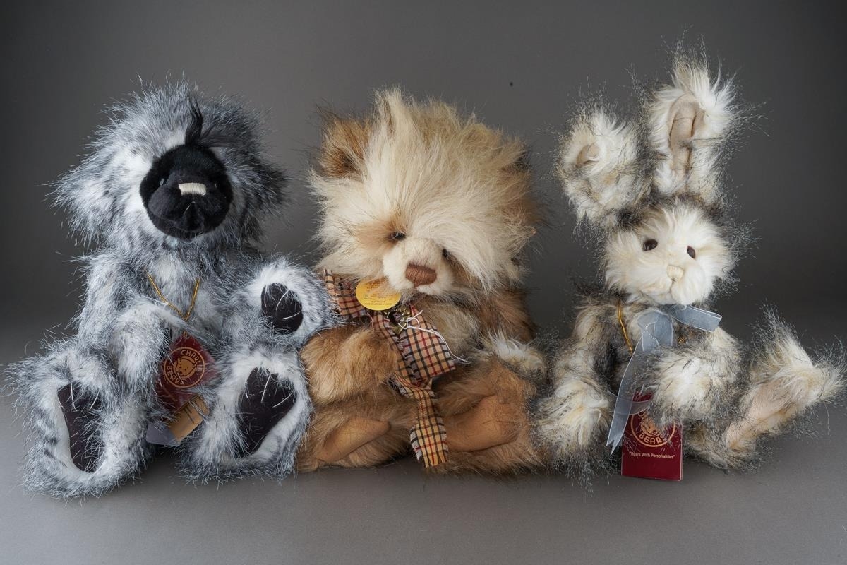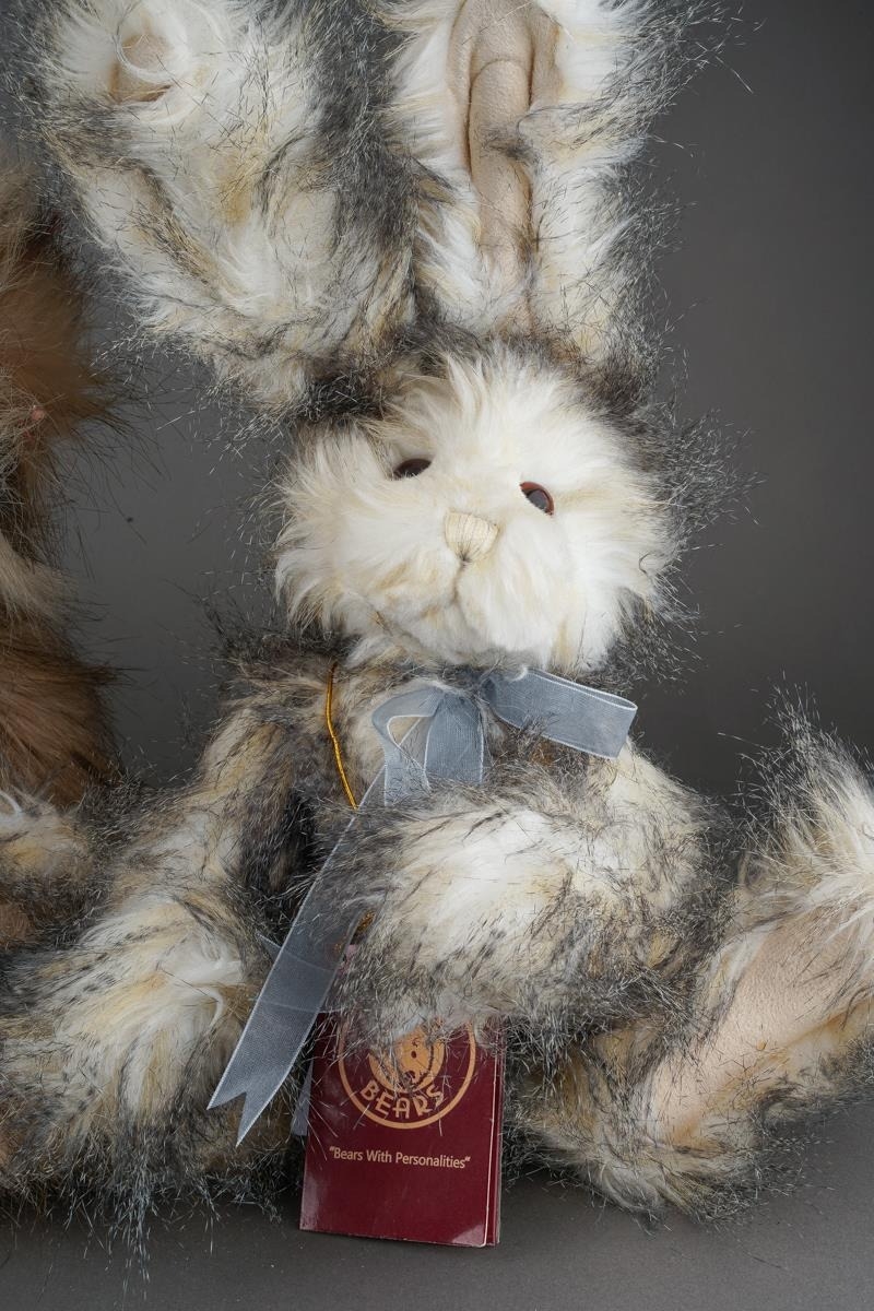 Three Charlie Bears, all with tags attached, comprising "Whoopsie Daisy" CB124901, exclusively designed by Isabelle Lee, height approx. 38cm, "Magnolia" rabbit CB647012O and "Hinckley" bear CB161514O, both exclusively designed by Heather Lyell, heights approx. 38cm (3)