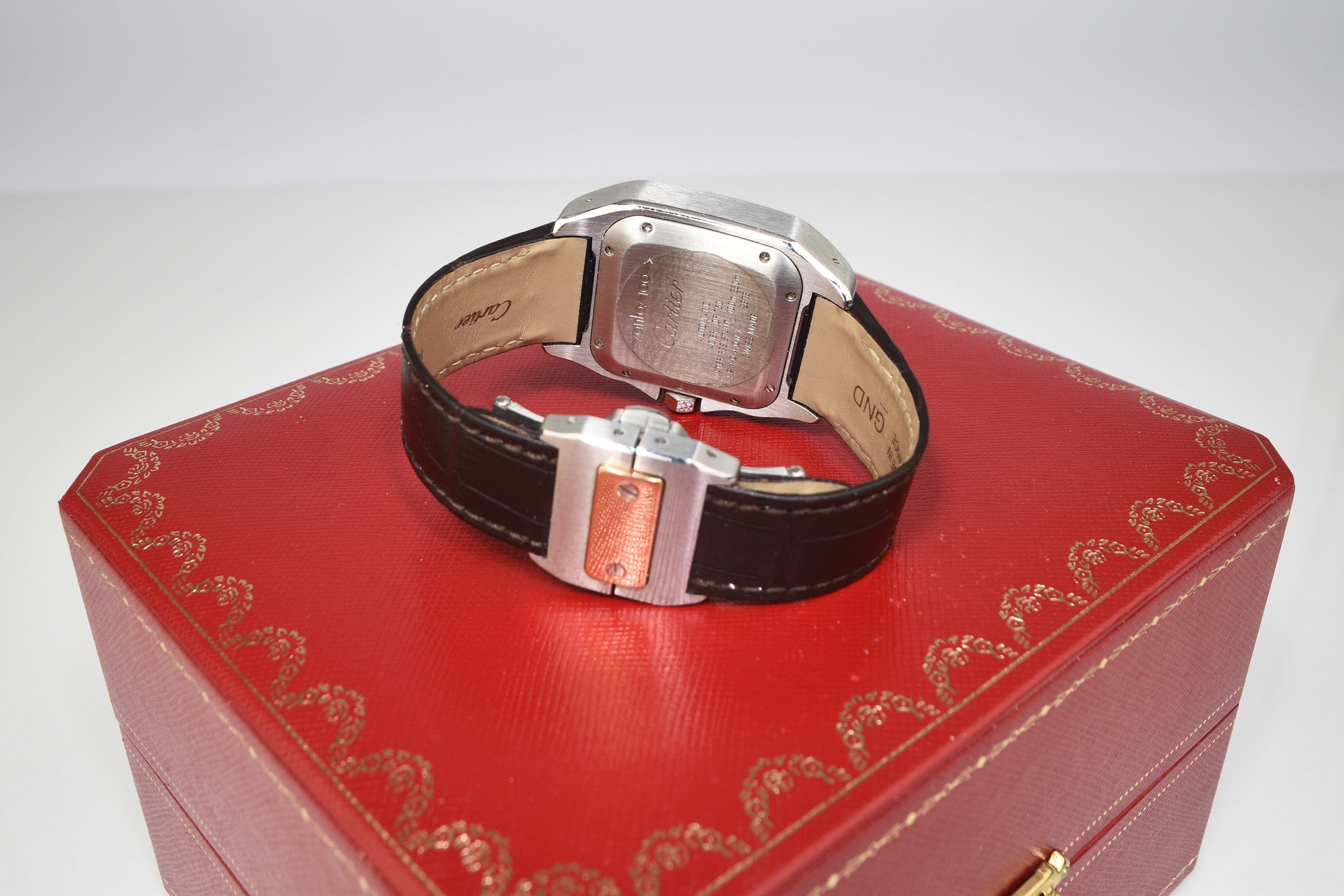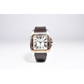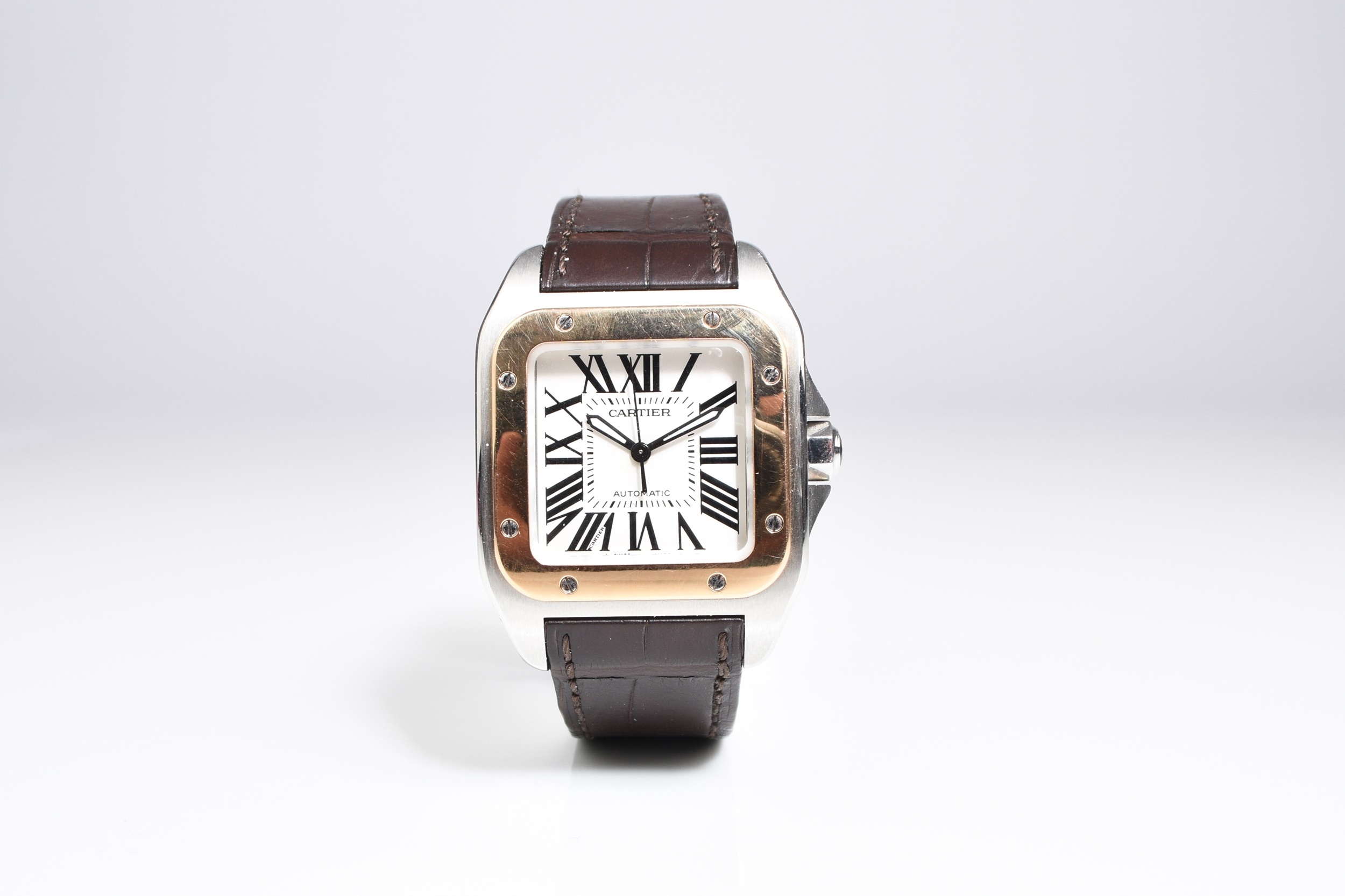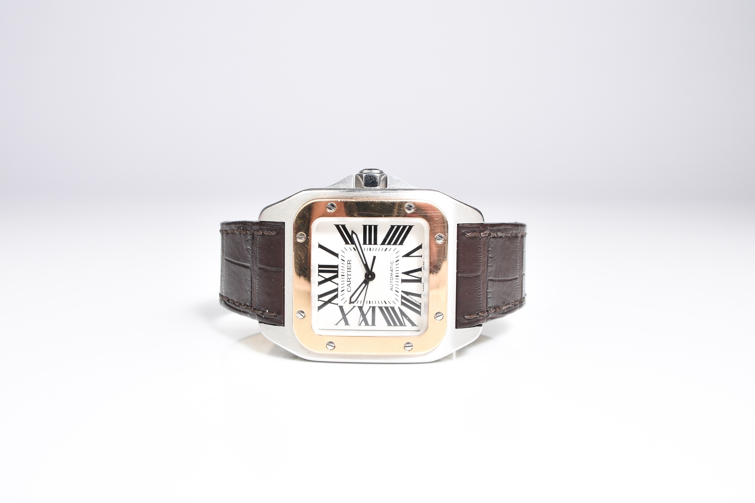 Cartier: A gentleman's stainless steel and 18ct gold wristwatch Model: Santos 100 Reference: 2878 Date: Circa 2005 Movement: Cal.076, 25 jewel automatic Dial: Matt silver, black Roman hour markers, black hands with luminous inserts Case: Brushed steel rectangular form, 18ct gold bezel, pull-out crown with faceted sapphire, screw-down back Strap/Bracelet: Cartier dark brown leather alligator Buckle/Clasp: Brushed steel and 18ct gold butterfly clasp Size: 33mm Accompaniments: Cartier box, outer card, instruction booklets, Cartier brochure Condition:• Case and back: A few minor abrasions to case, some fine scratches to bezel, minuscule dints to upper right lug, original plastic cover to back. • Crystal: Good. • Dial: Good. • Hands: Good. • Strap: Minor/negligible signs of wear. Minor abrasions to clasp. • Movement: Winds, sets and runs. Unless otherwise stated, all watches are likely to have been serviced and/or repaired in their lifetime and may have had parts replaced. While a watch may be described as 'working' at the time of the report, they are not guaranteed for timekeeping - it is advised that all watches are inspected and serviced by a qualified jeweller or horologist before full use.
