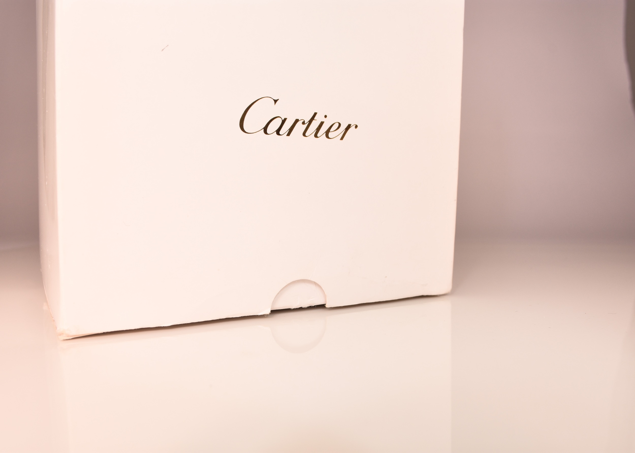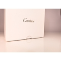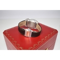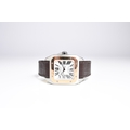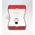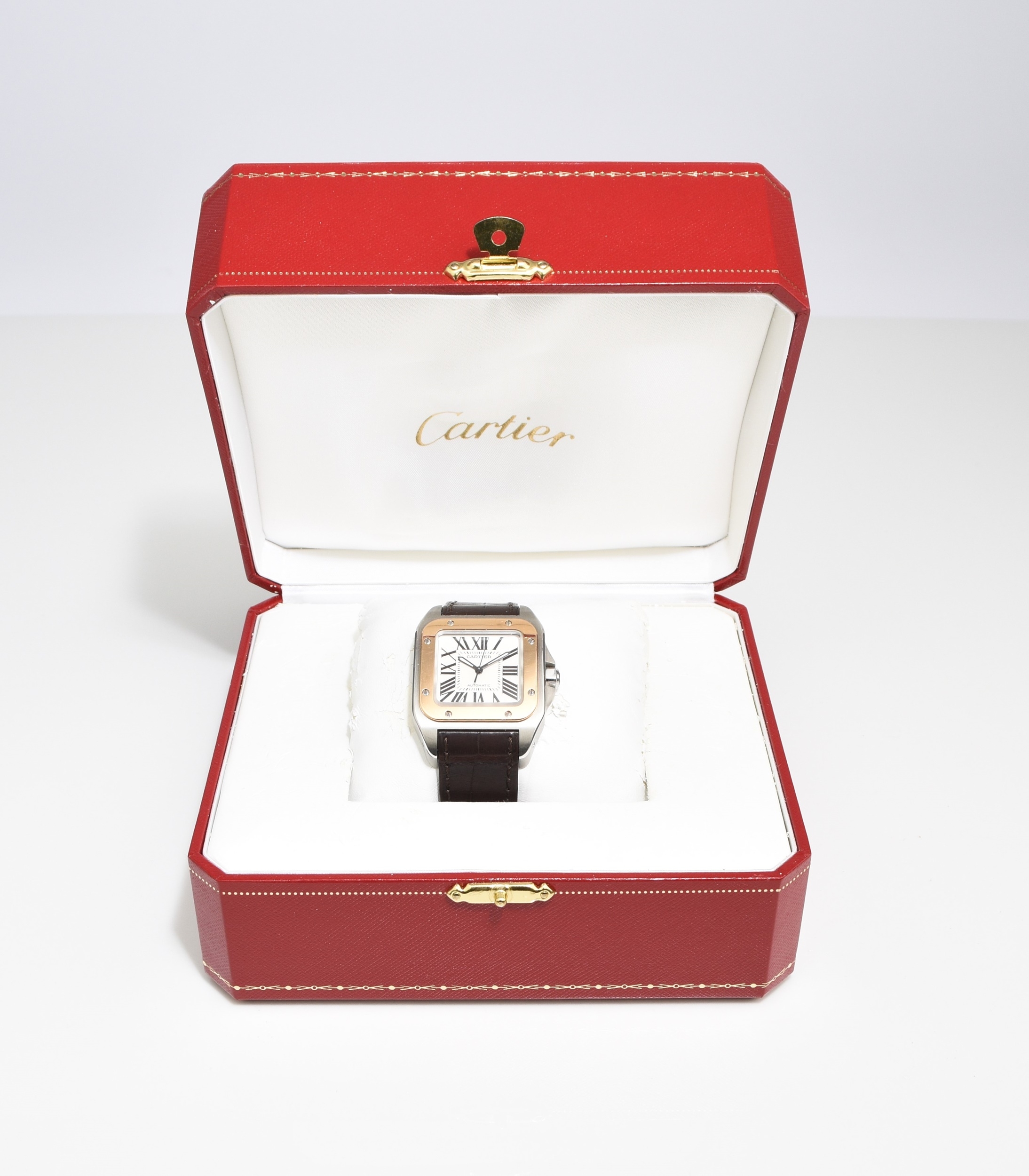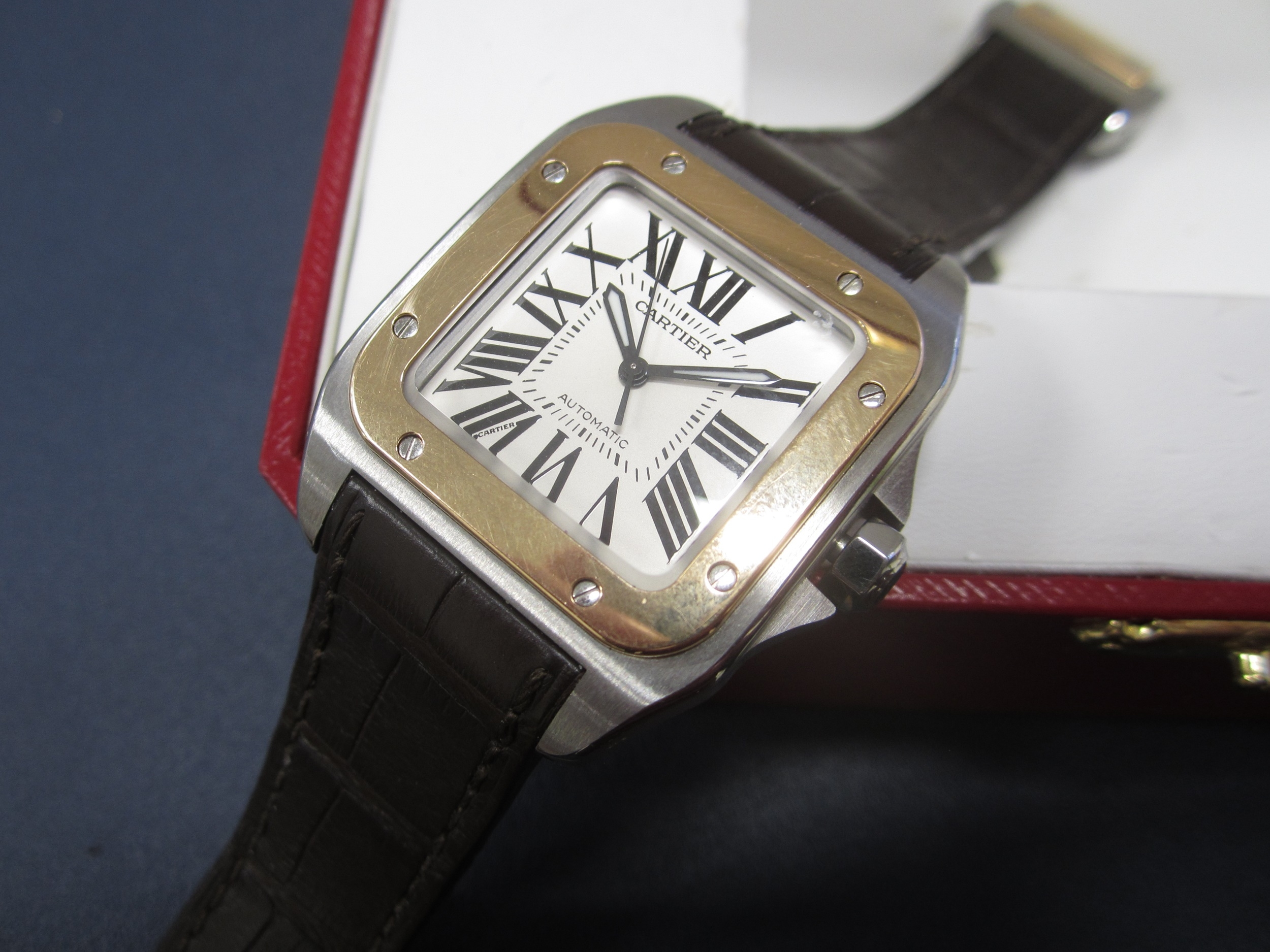 Cartier: A gentleman's stainless steel and 18ct gold wristwatch Model: Santos 100 Reference: 2878 Date: Circa 2005 Movement: Cal.076, 25 jewel automatic Dial: Matt silver, black Roman hour markers, black hands with luminous inserts Case: Brushed steel rectangular form, 18ct gold bezel, pull-out crown with faceted sapphire, screw-down back Strap/Bracelet: Cartier dark brown leather alligator Buckle/Clasp: Brushed steel and 18ct gold butterfly clasp Size: 33mm Accompaniments: Cartier box, outer card, instruction booklets, Cartier brochure Condition:• Case and back: A few minor abrasions to case, some fine scratches to bezel, minuscule dints to upper right lug, original plastic cover to back. • Crystal: Good. • Dial: Good. • Hands: Good. • Strap: Minor/negligible signs of wear. Minor abrasions to clasp. • Movement: Winds, sets and runs. Unless otherwise stated, all watches are likely to have been serviced and/or repaired in their lifetime and may have had parts replaced. While a watch may be described as 'working' at the time of the report, they are not guaranteed for timekeeping - it is advised that all watches are inspected and serviced by a qualified jeweller or horologist before full use.