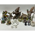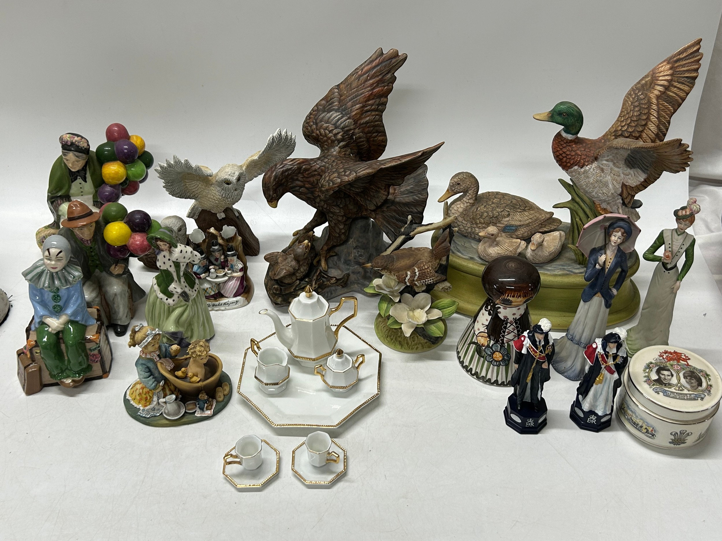 A selection of decorative china including Royal Doulton style figures, mallard and drake, eagle, commemorative trinket box and cover, Coalport style figures, Jersey pottery money box etc..