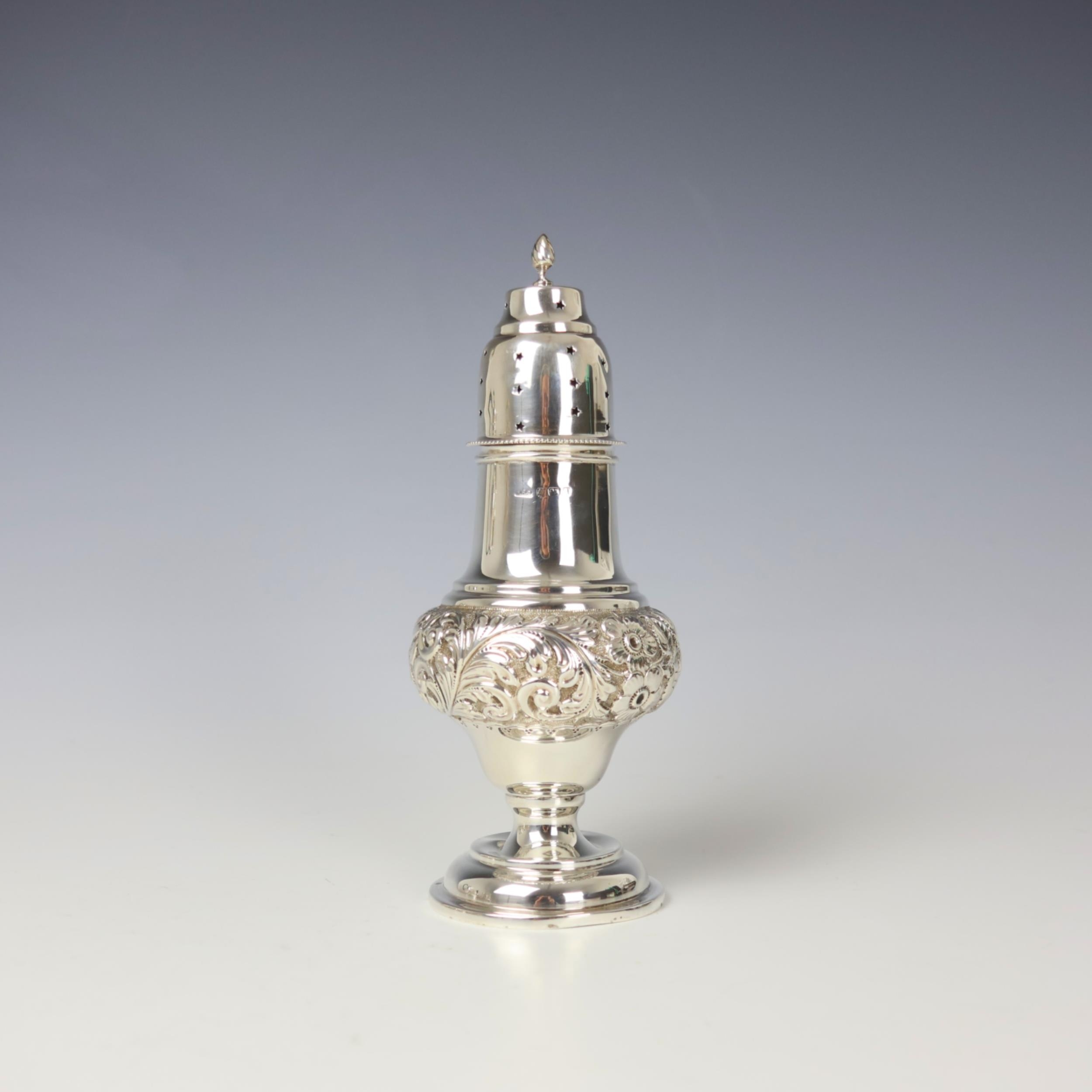 An Edwardian silver sugar caster, William Henry Sparrow, Birmingham 1903, the associated (1902) pierced cover above a bulbous embossed body, upon pedestal base and circular foot, 20cm high, 4ozt (at fault)