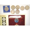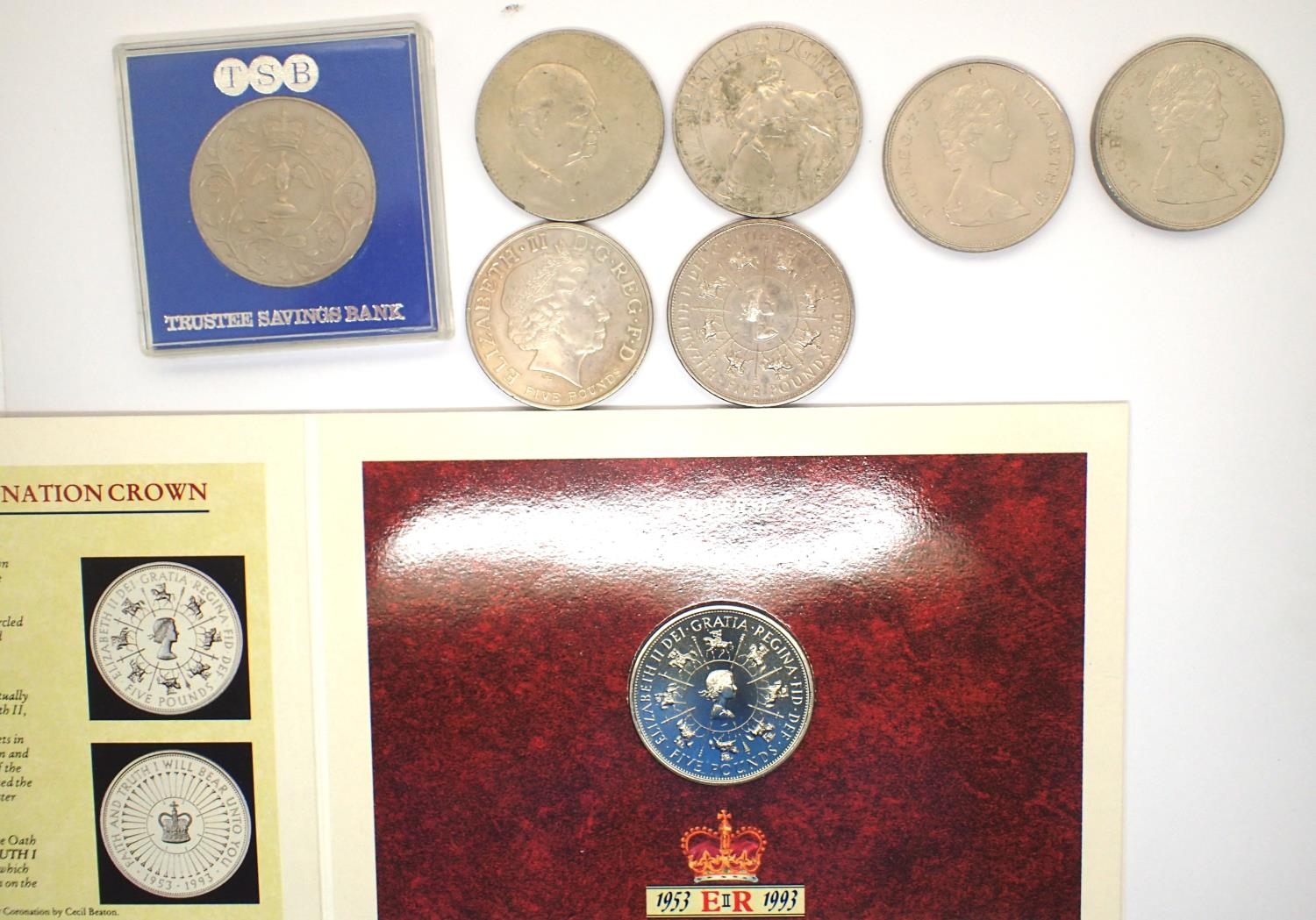 Boxed Queen Elizabeth II 40th Anniversary Coronation crown, two £5 crowns and others. P&P Group 1 (£14+VAT for the first lot and £1+VAT for subsequent lots)