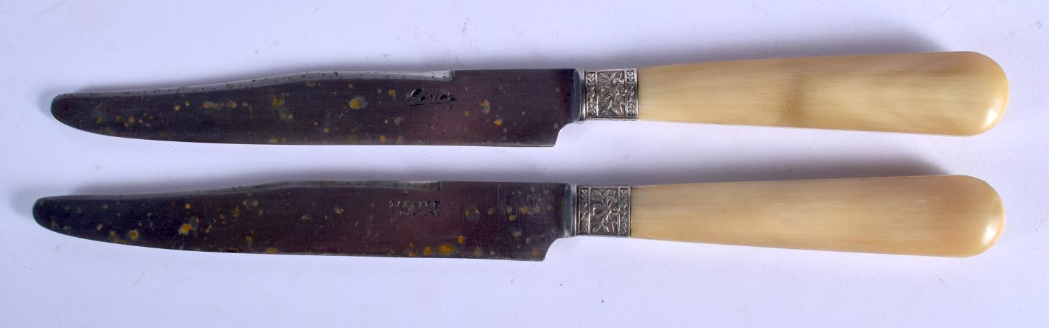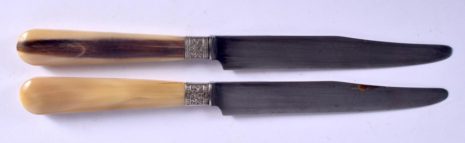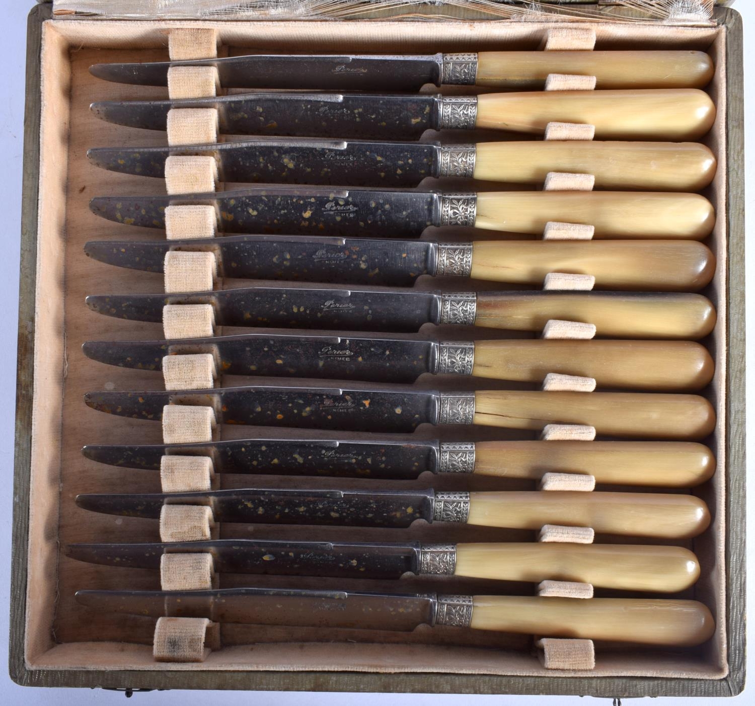 A SET OF TWELVE 19TH CENTURY FRENCH BLONDE RHINOCEROS HORN KNIVES with embossed banding. 22 cm long. (12)