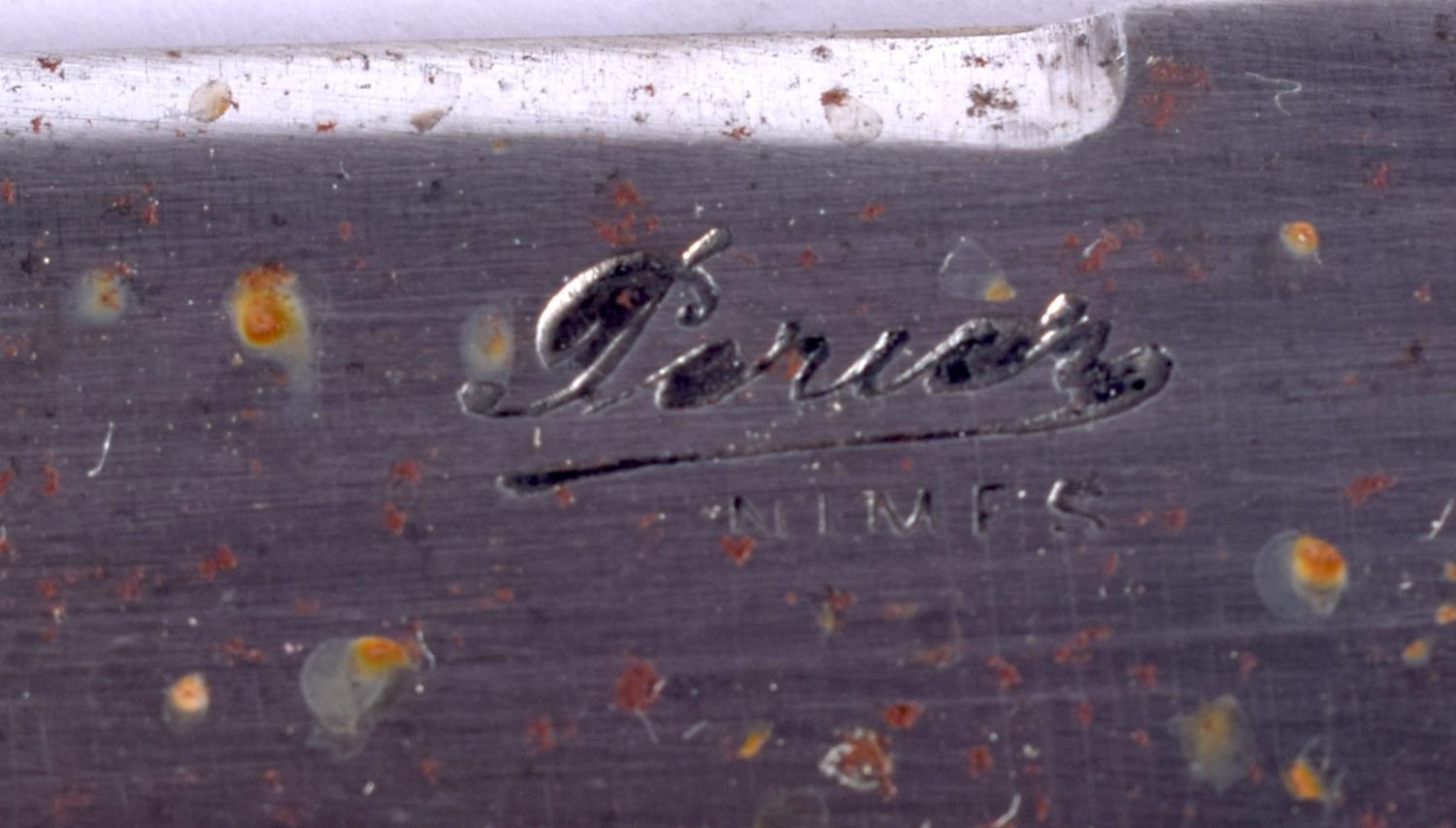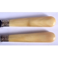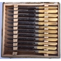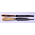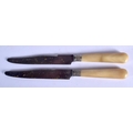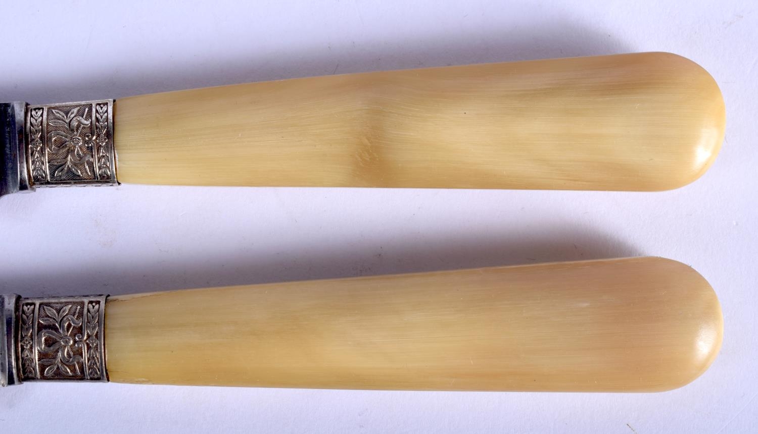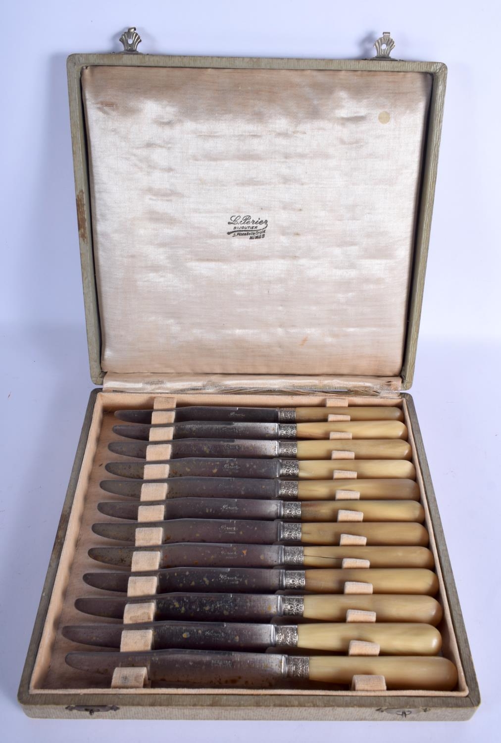 A SET OF TWELVE 19TH CENTURY FRENCH BLONDE RHINOCEROS HORN KNIVES with embossed banding. 22 cm long. (12)