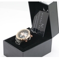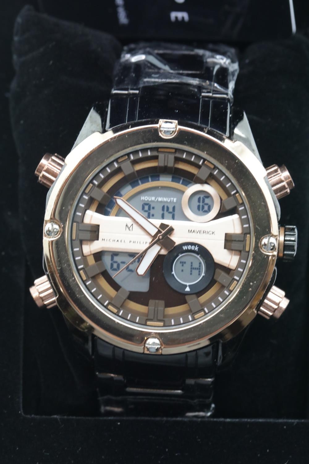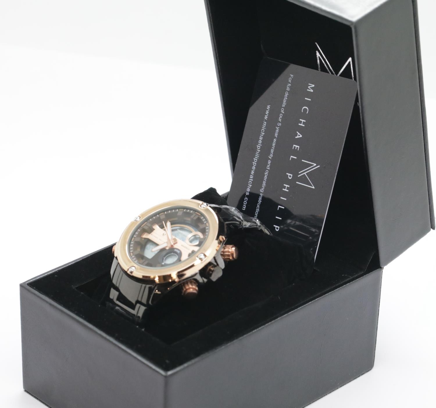 New boxed Michael Philippe gents wristwatch with rose gold dial on a black rubber strap. P&P Group 1 (£14+VAT for the first lot and £1+VAT for subsequent lots)