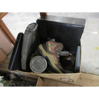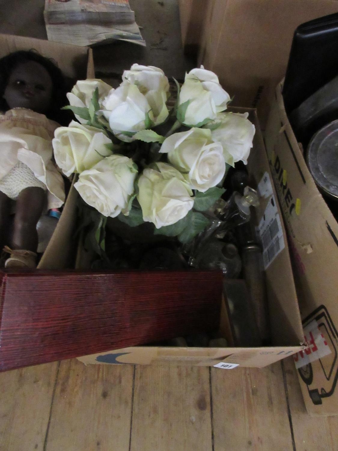 BOX OF MISCELLANEOUS ITEMS INCLUDING GLASS PERFUME BOTTLES ETC