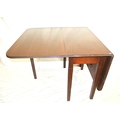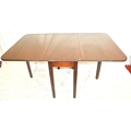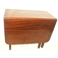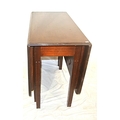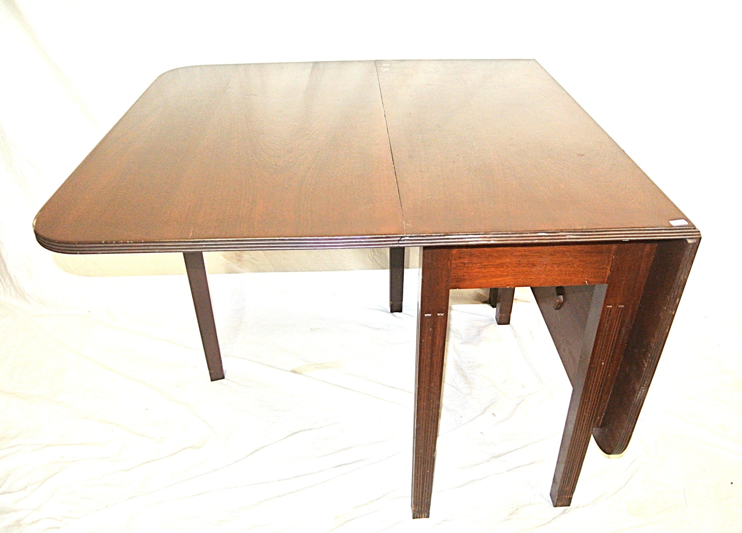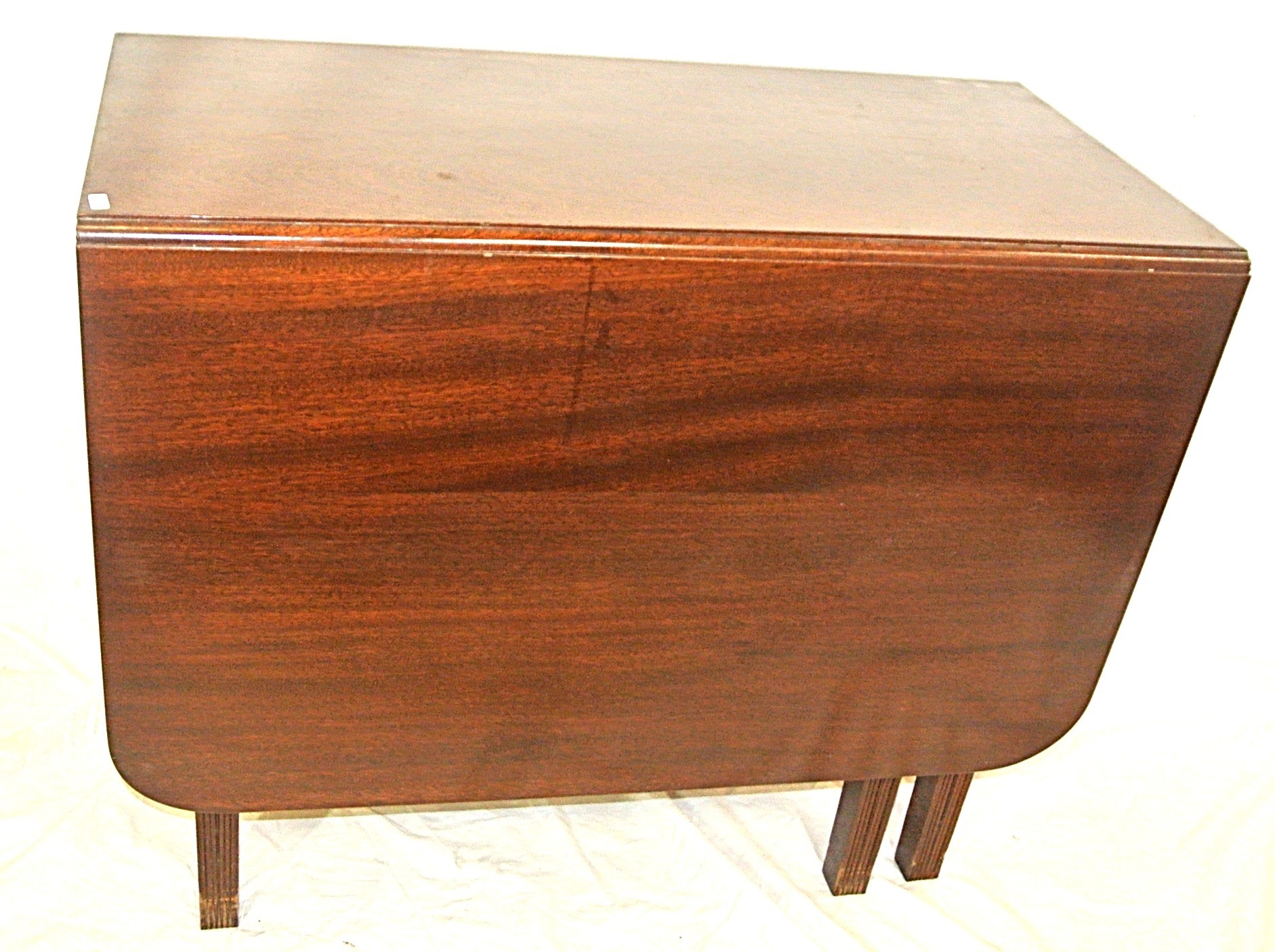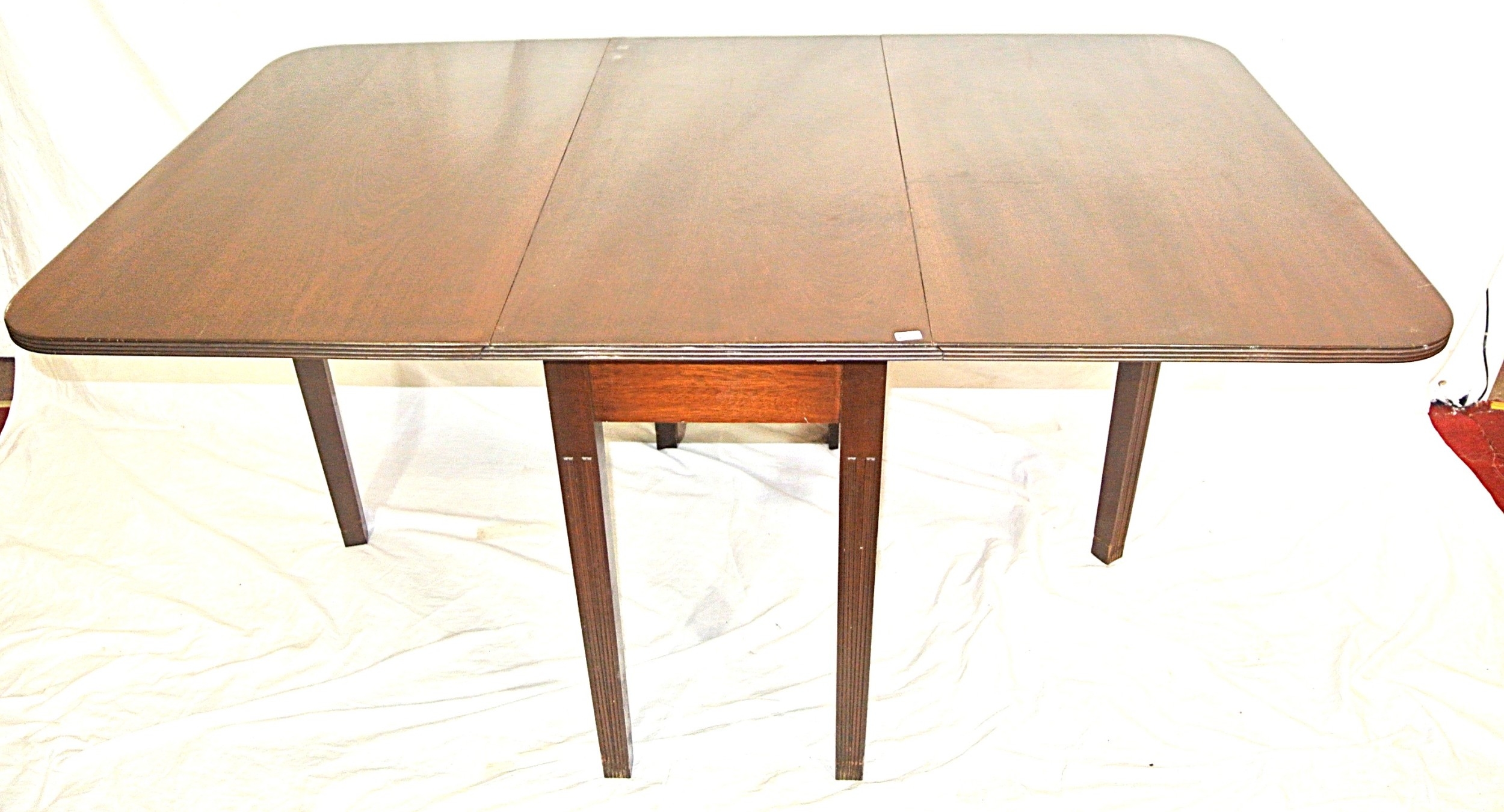 Edwardian mahogany dining table with drop leaves, rounded corners, reeded borders, gateleg support, on square tapering legs