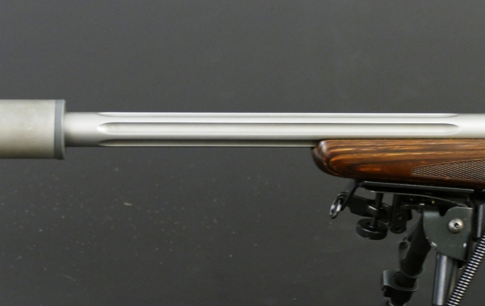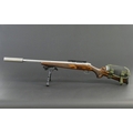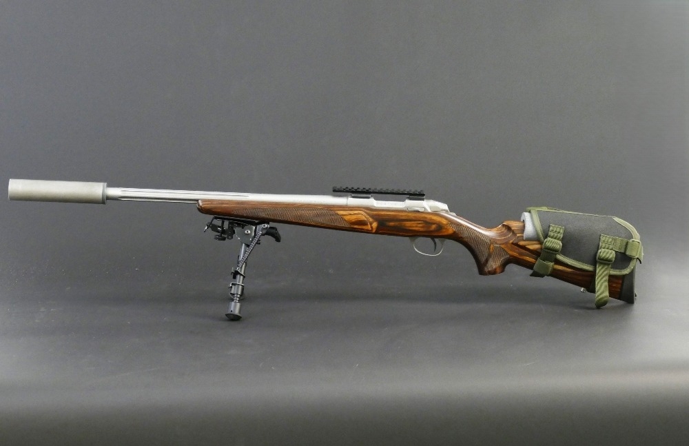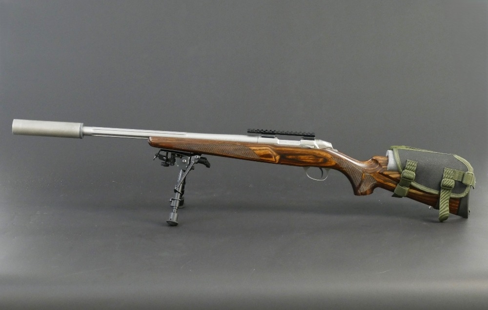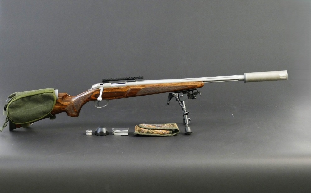 Sako 85 XS cal 223 Remington bolt action rifle, with stainless action and fluted stainless barrel, fitted with a sound moderator, bipod etc. Serial No. F73831. Sound moderator no serial number. FIREARMS CERTIFICATE REQUIRED X 2.