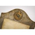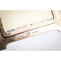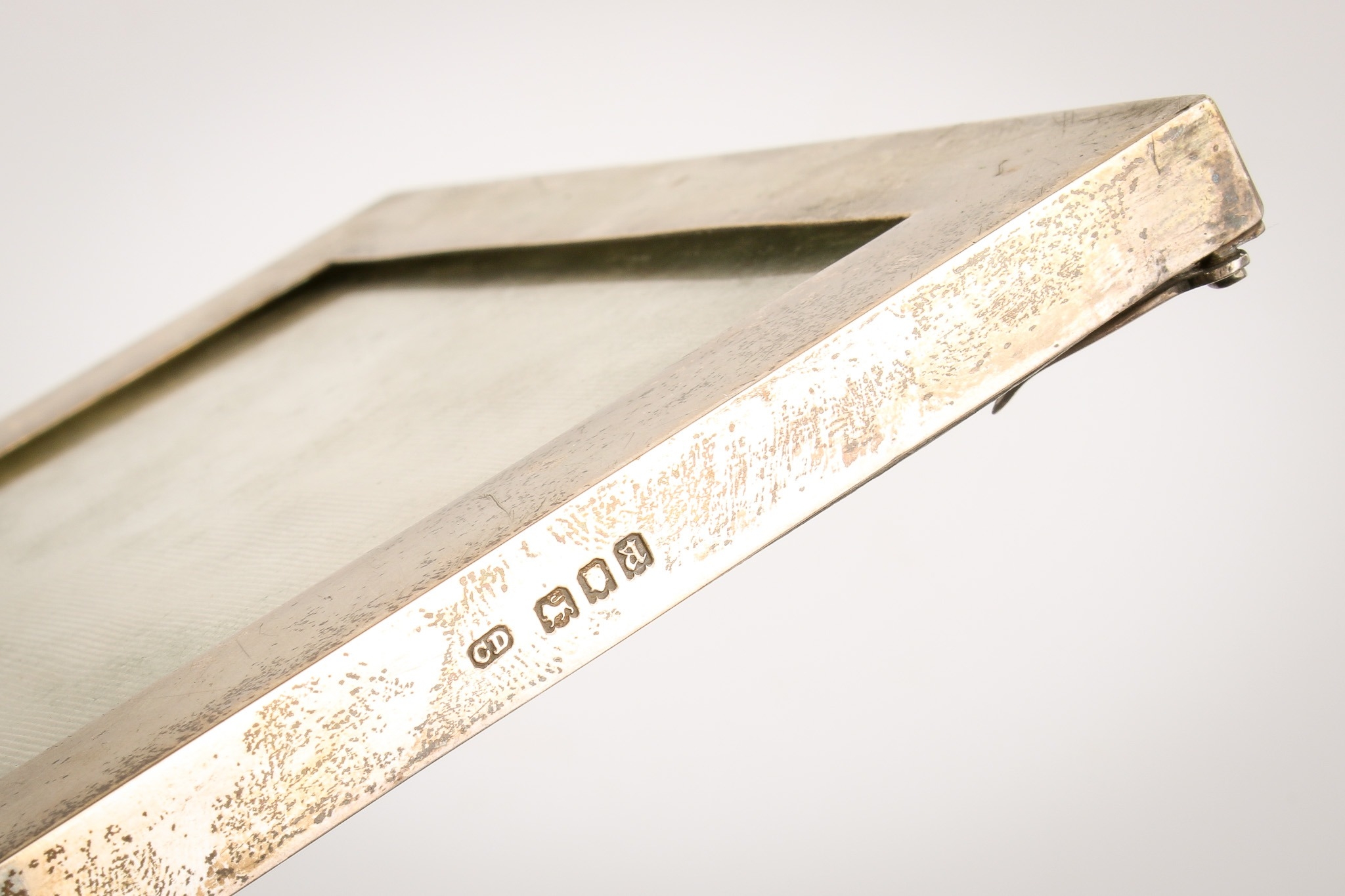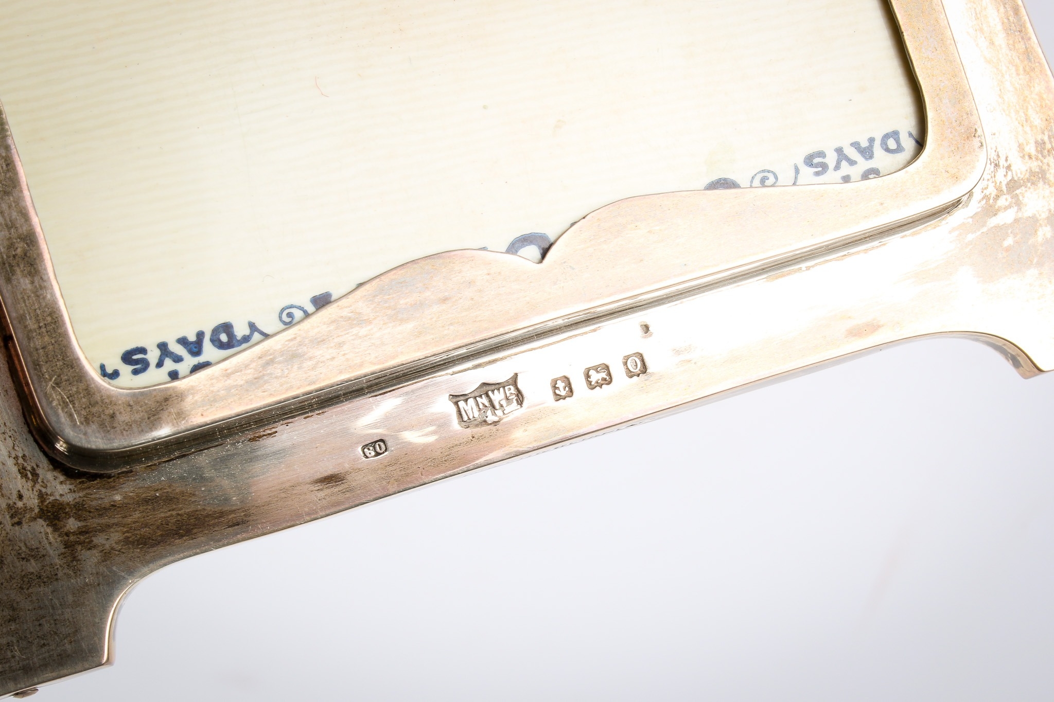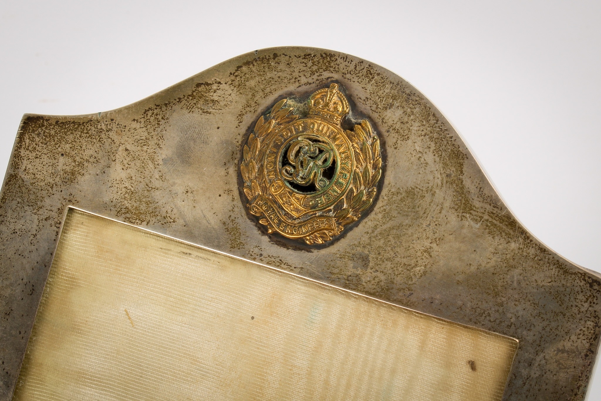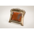A silver desk calendar and a silver photograph frame. The calendar of Art Nouveau style with loose month cards, some blank, the frame hallmarked Mappin & Webb, Birmingham, H10.5cm x W12cm; the photograph frame with applied gilt Royal Engineers crest, hallmarked London 1916, H19.5cm.