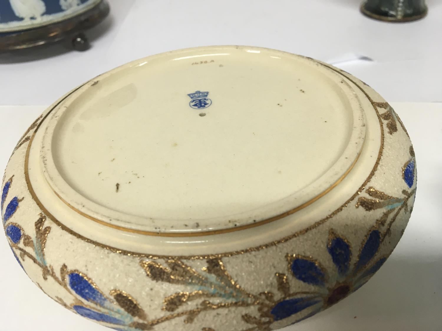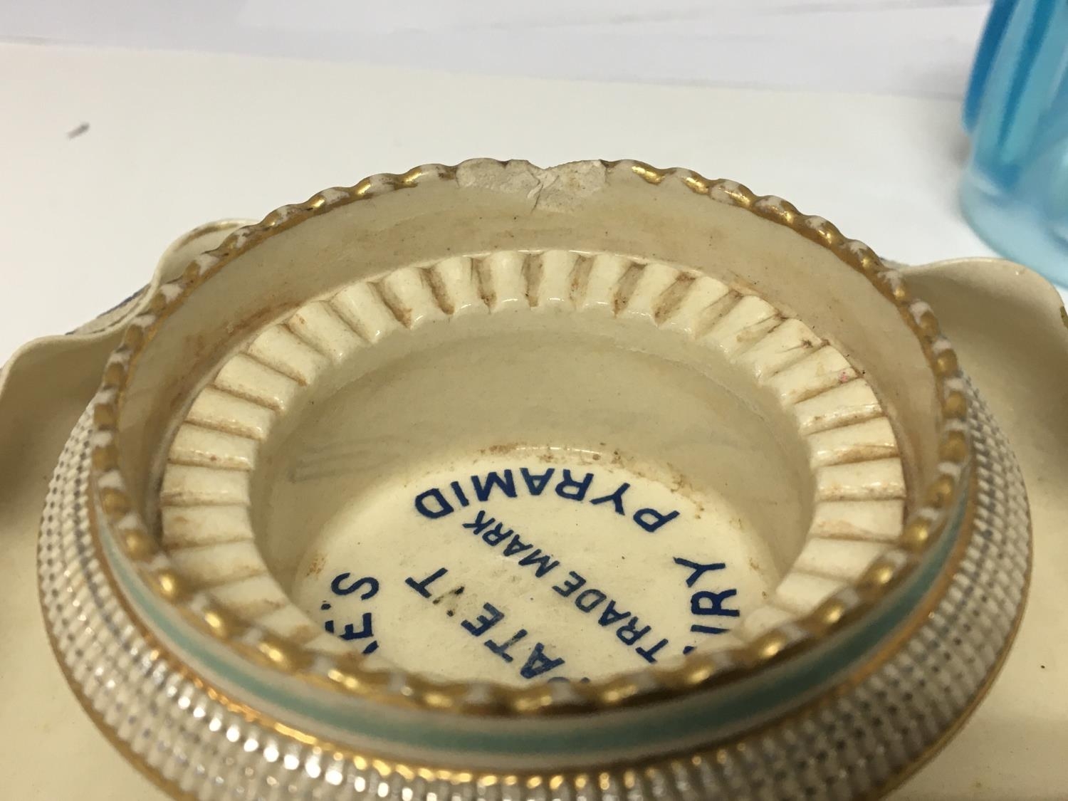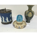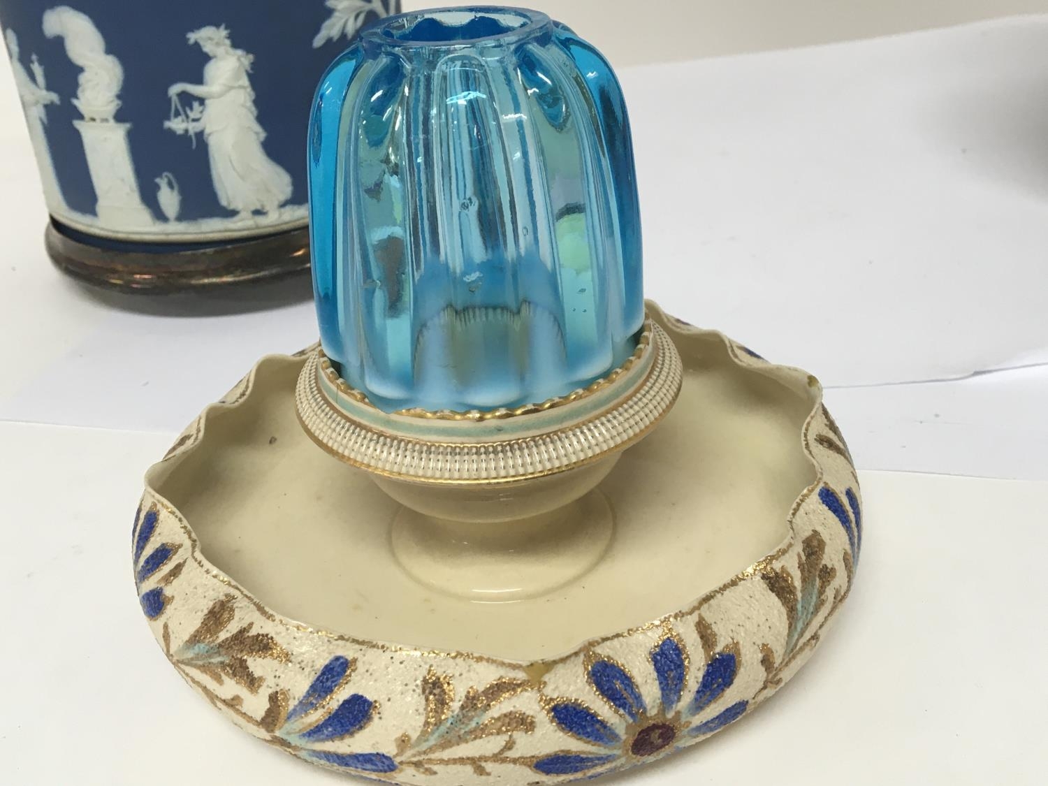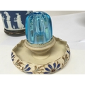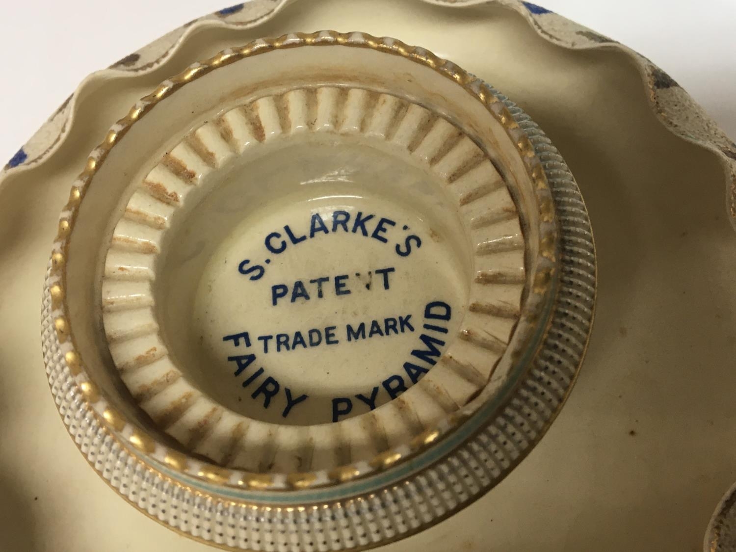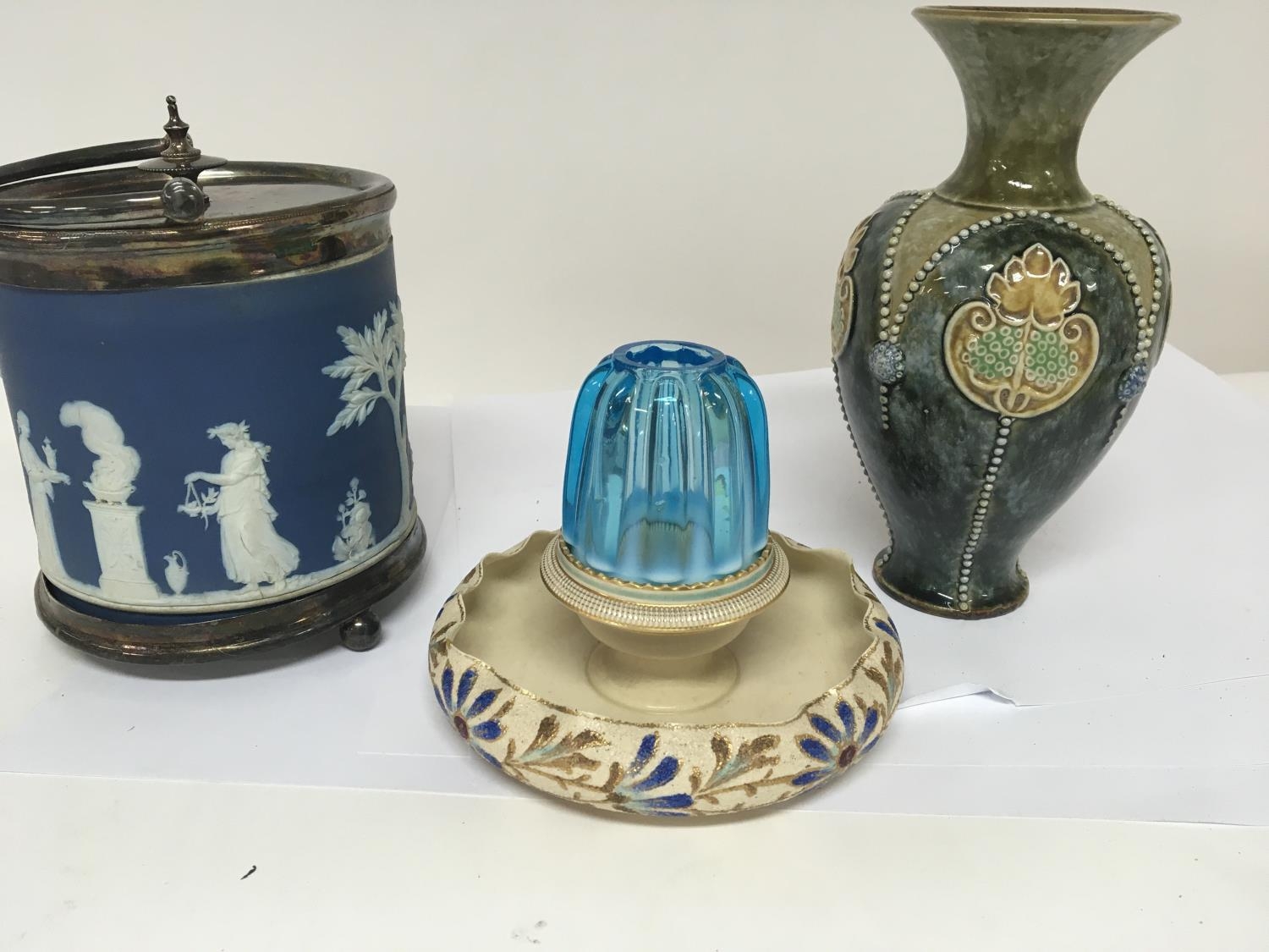 An unusual late Victorian ceramic and glass candle holder S Clarkes Patent Fairy Pyramid. Made by Macintyre.Chip on the rim see image. A Wedgwood biscuit barrel a d a Doulton stoneware vase (3)