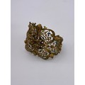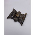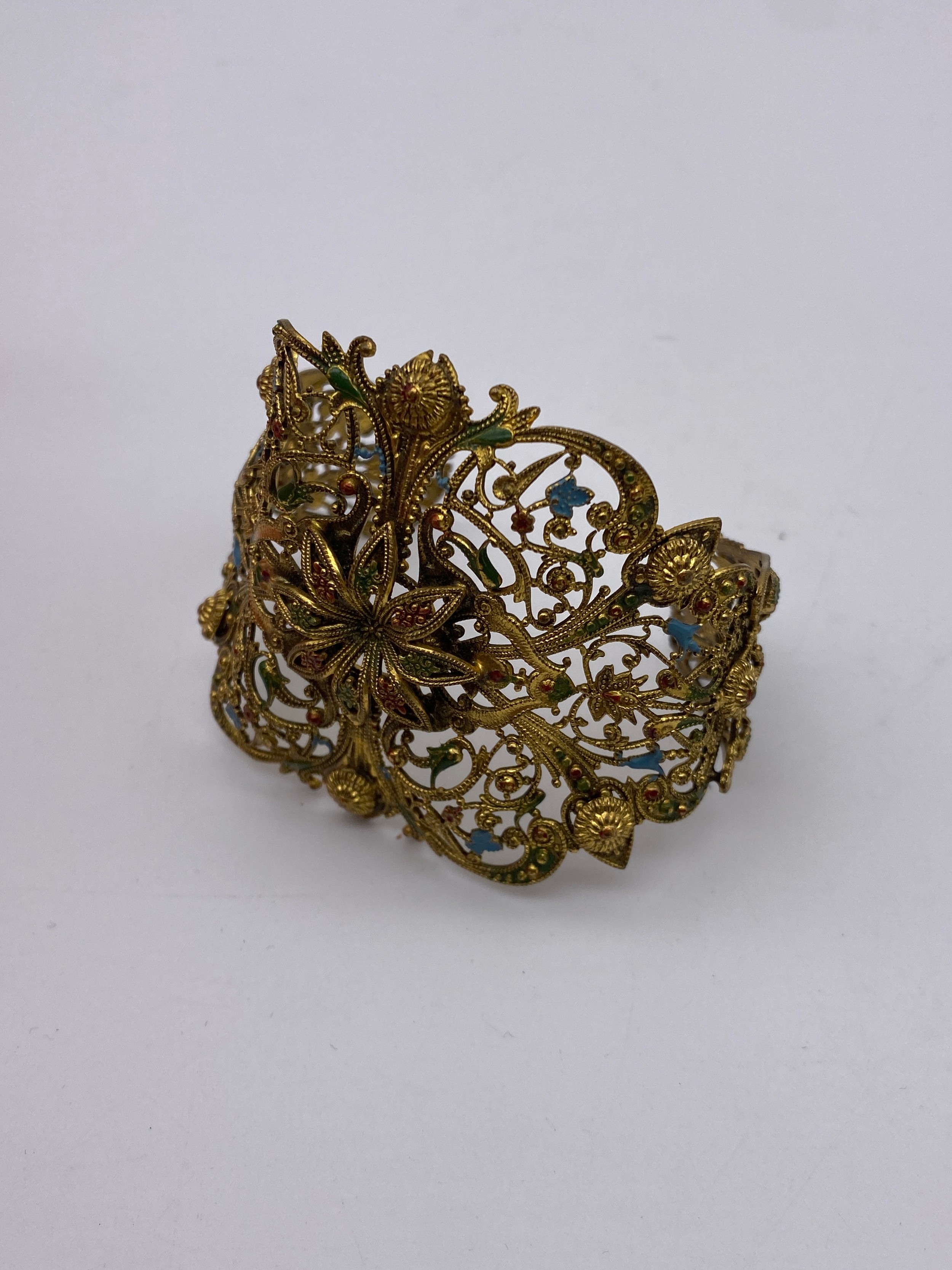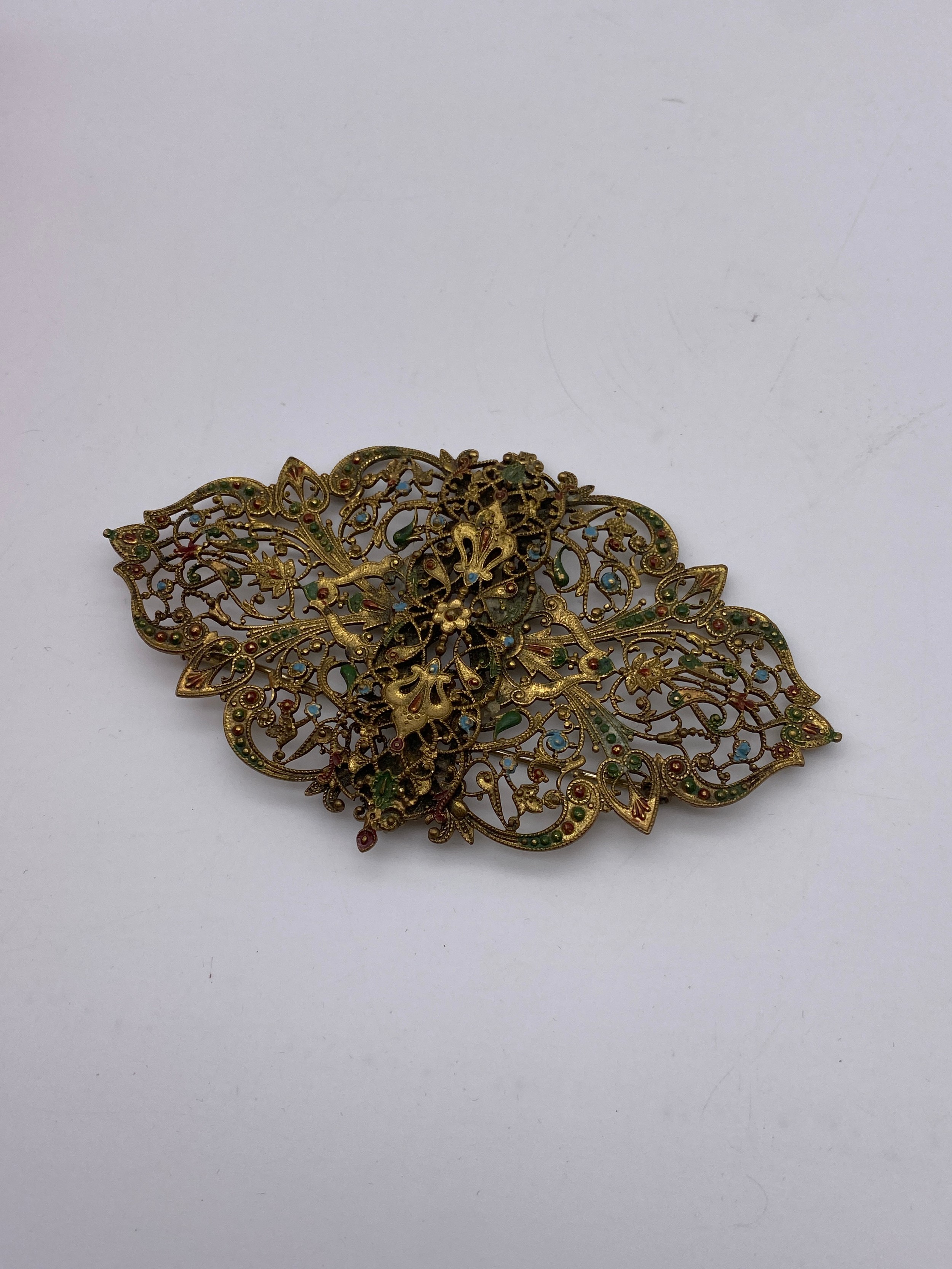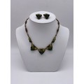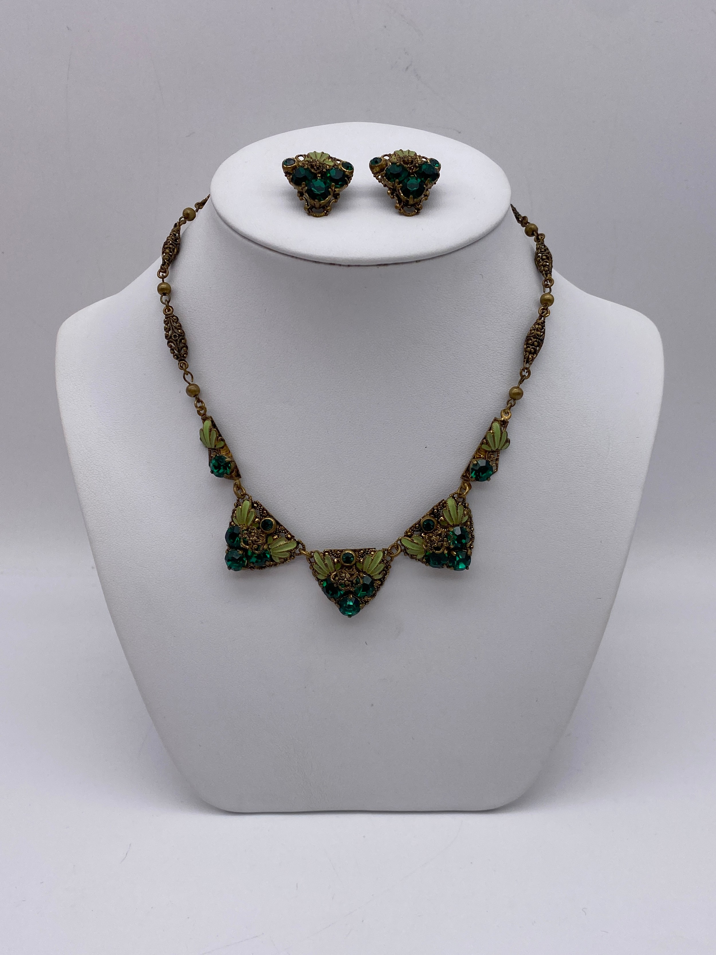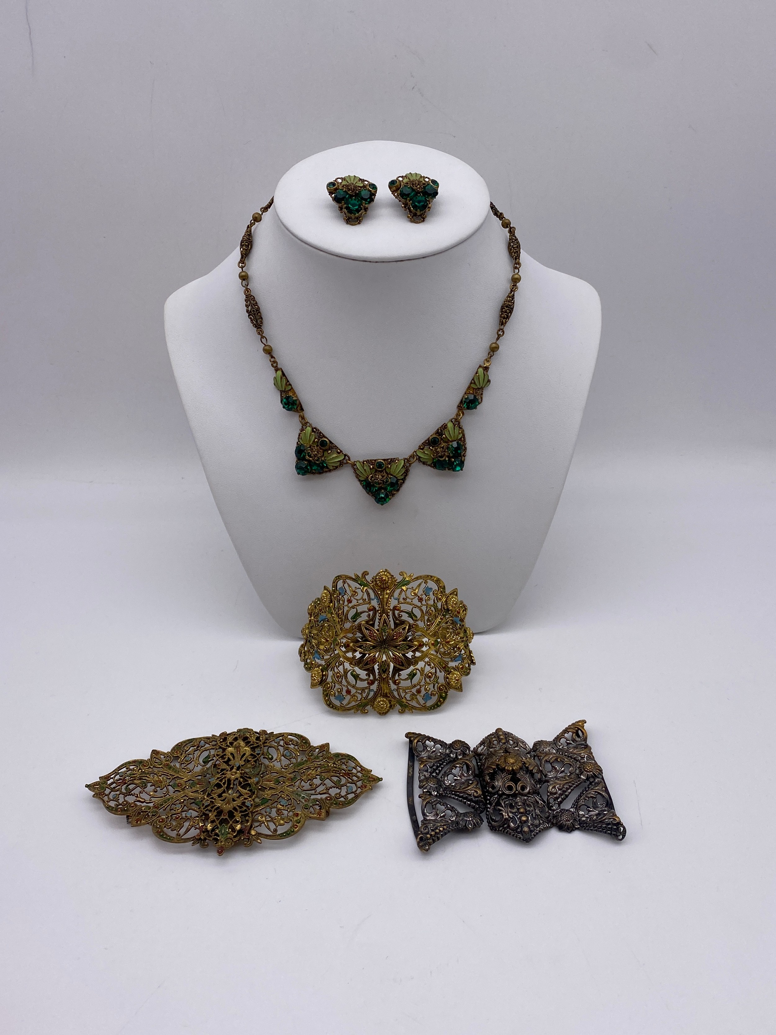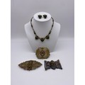METAL WORK FILIGREE BANGLE, BAR BROOCH, GREEN PASTE ENCRUSTED PENDANT NECK CHAIN AND CLIP ON EARRINGS