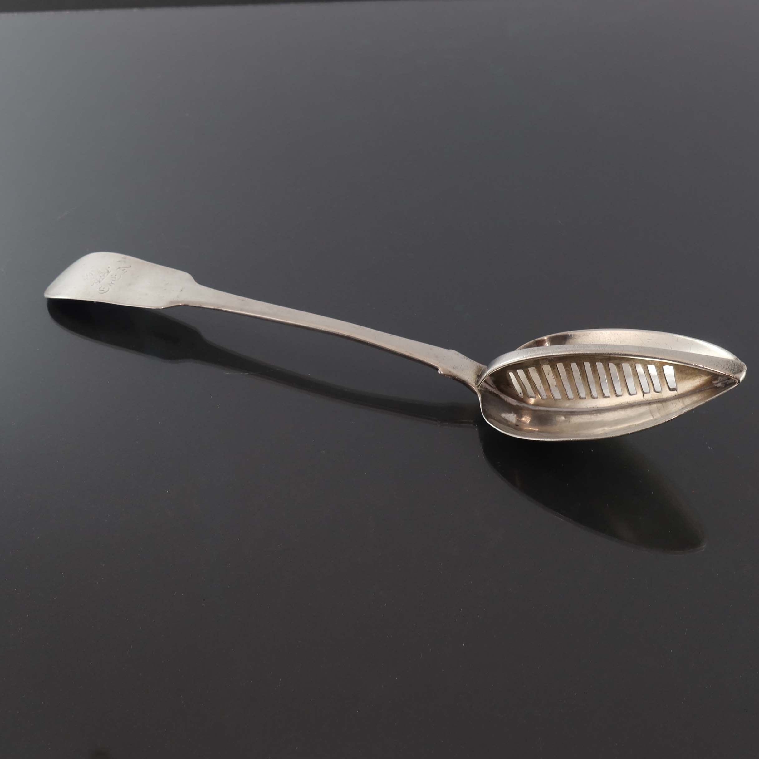 A George IV Irish silver strainer spoon, Smith and Gamble, Dublin 1826, Fiddle pattern with pierced divider to the bowl, 30cm long, 4.24ozt