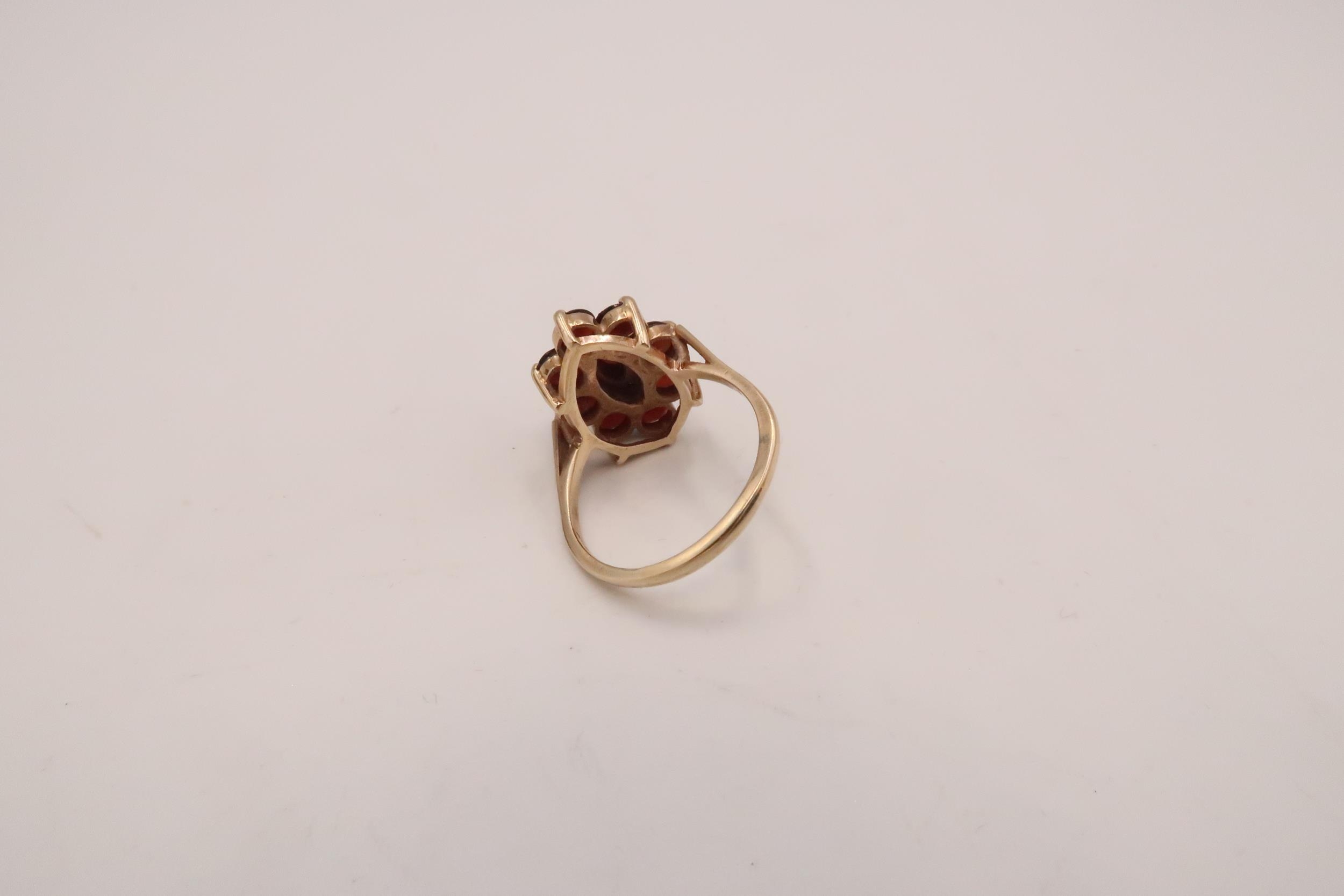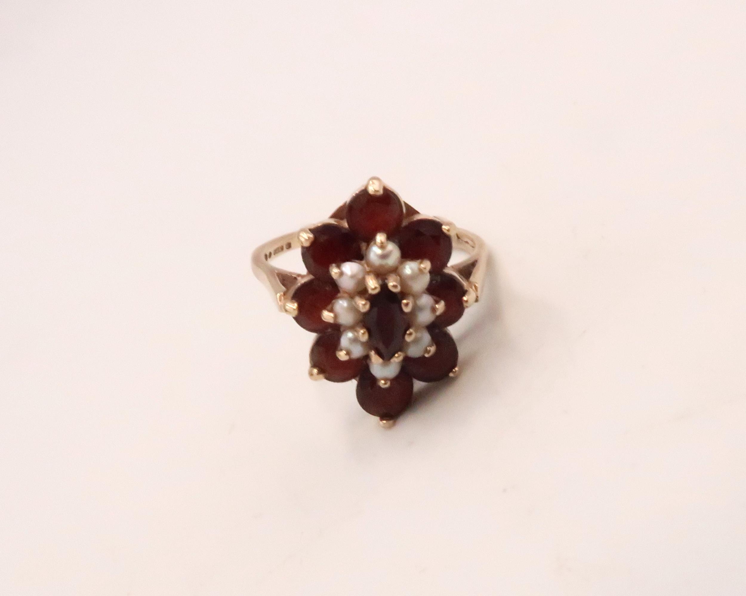 A 9ct gold, garnet and seed pearl dress ring of double flowerhead form, with central marquise cut garnet, surrounded by eight seed pearls with a further eight garnets to the outside, ring size P/Q, fully hallmarked inside shank, 4.9g.