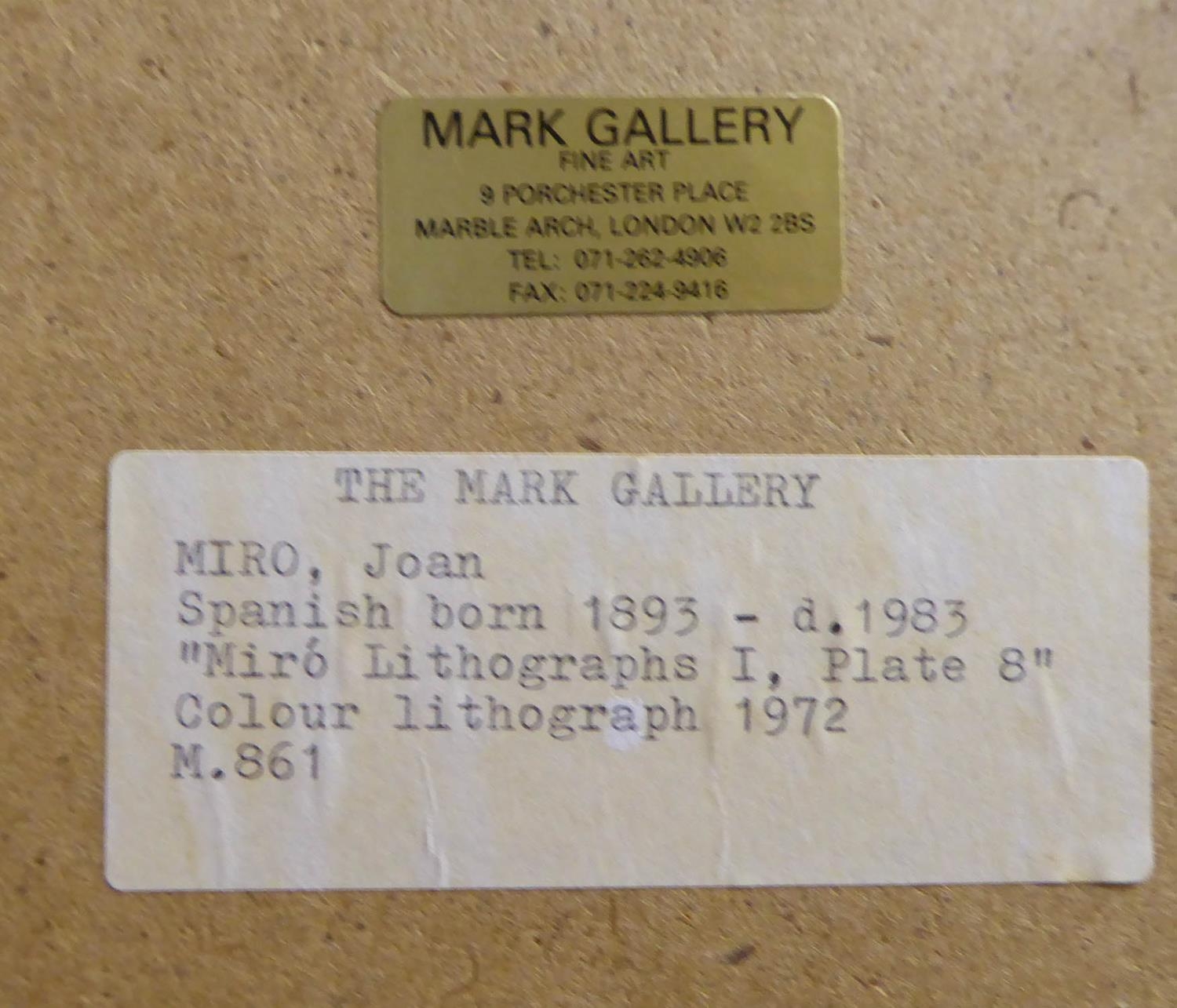 JOAN MIRO 'Miro lithographs plate 8', 1972, lithograph, with the Mark Gallery label verso, 33cm x 25cm, framed and glazed.