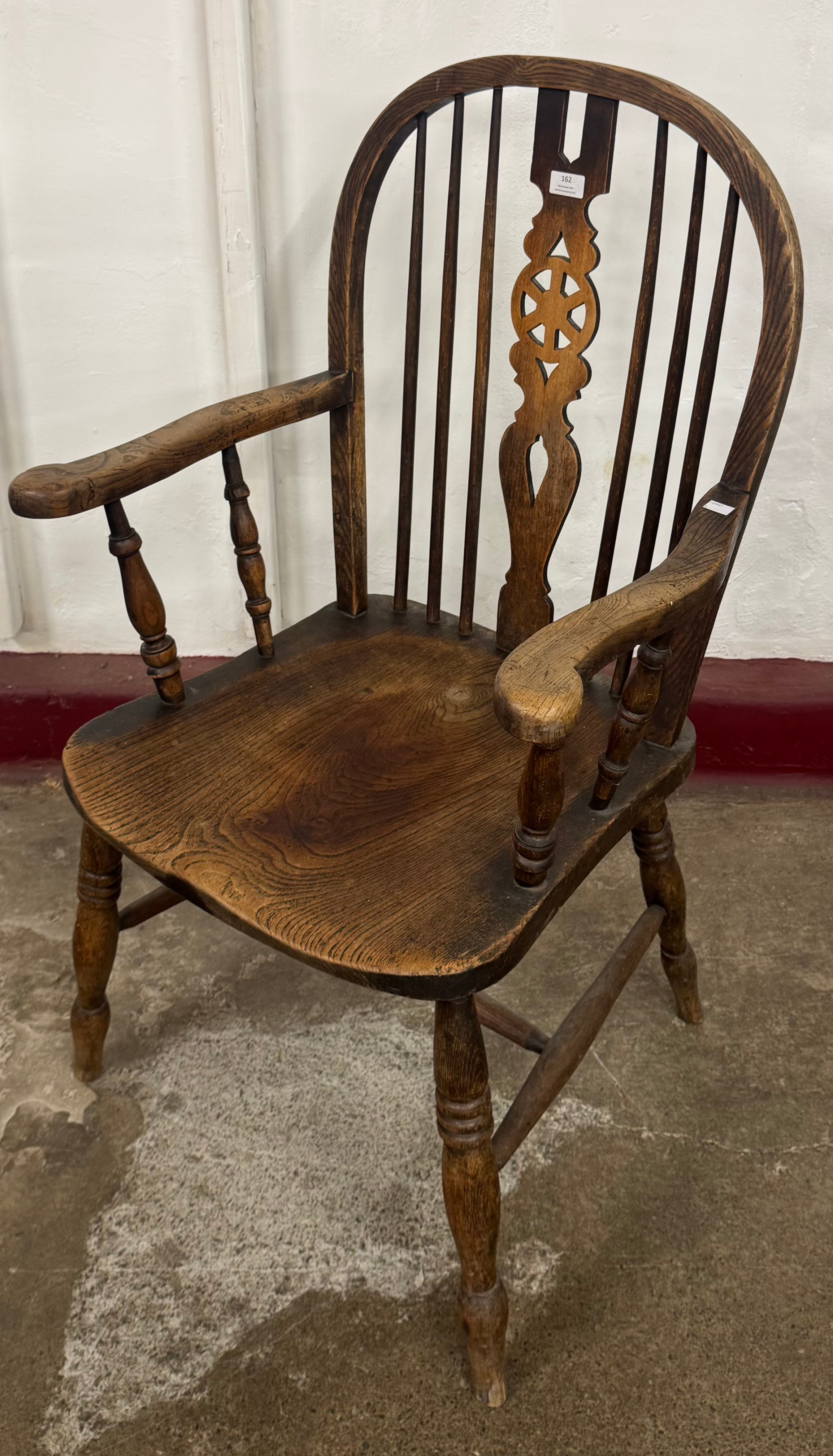 A Victorian elm and beech wheelback Windsor elbow chair