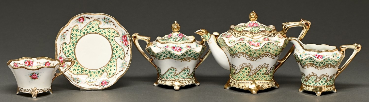 A Noritake porcelain tea service, c1950, painted with roses, teapot and cover 15cm h, printed mark (5)