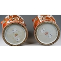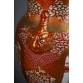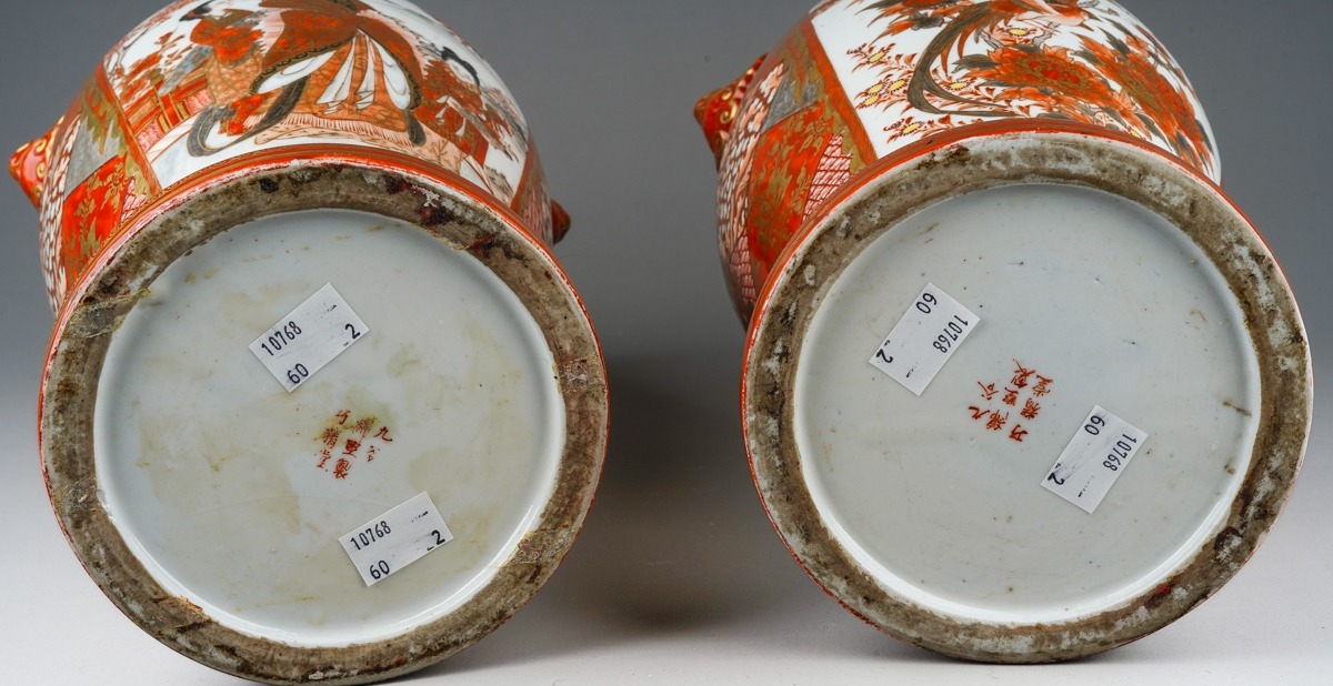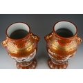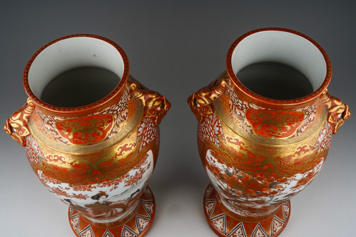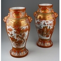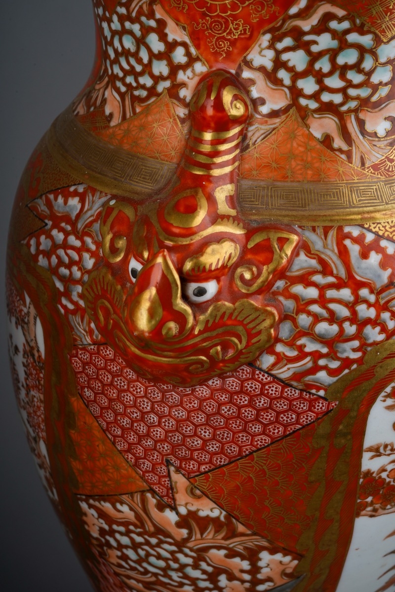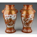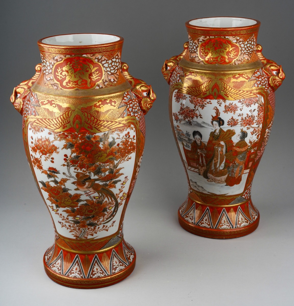 A pair of late 19th century Japanese Kutani porcelain baluster vases, dragon mask twin handles and decorated with two rectangular panels, one of geisha in a garden, the other with birds amongst foliage, character marks to base, height 35.5cm (2)