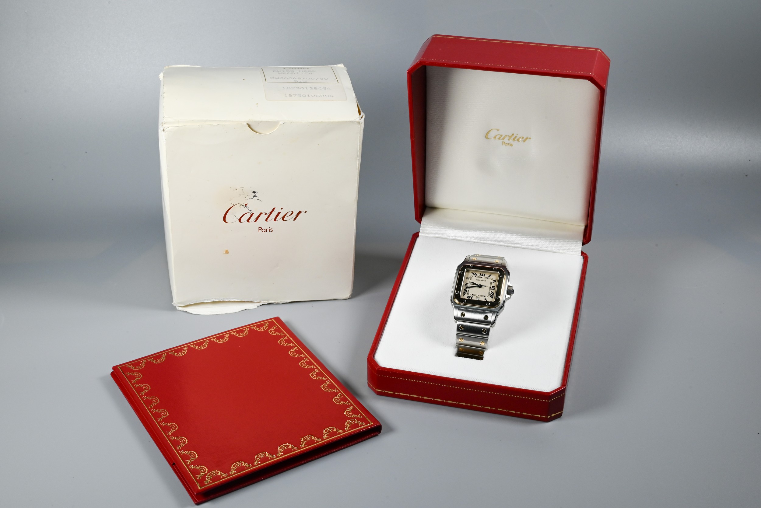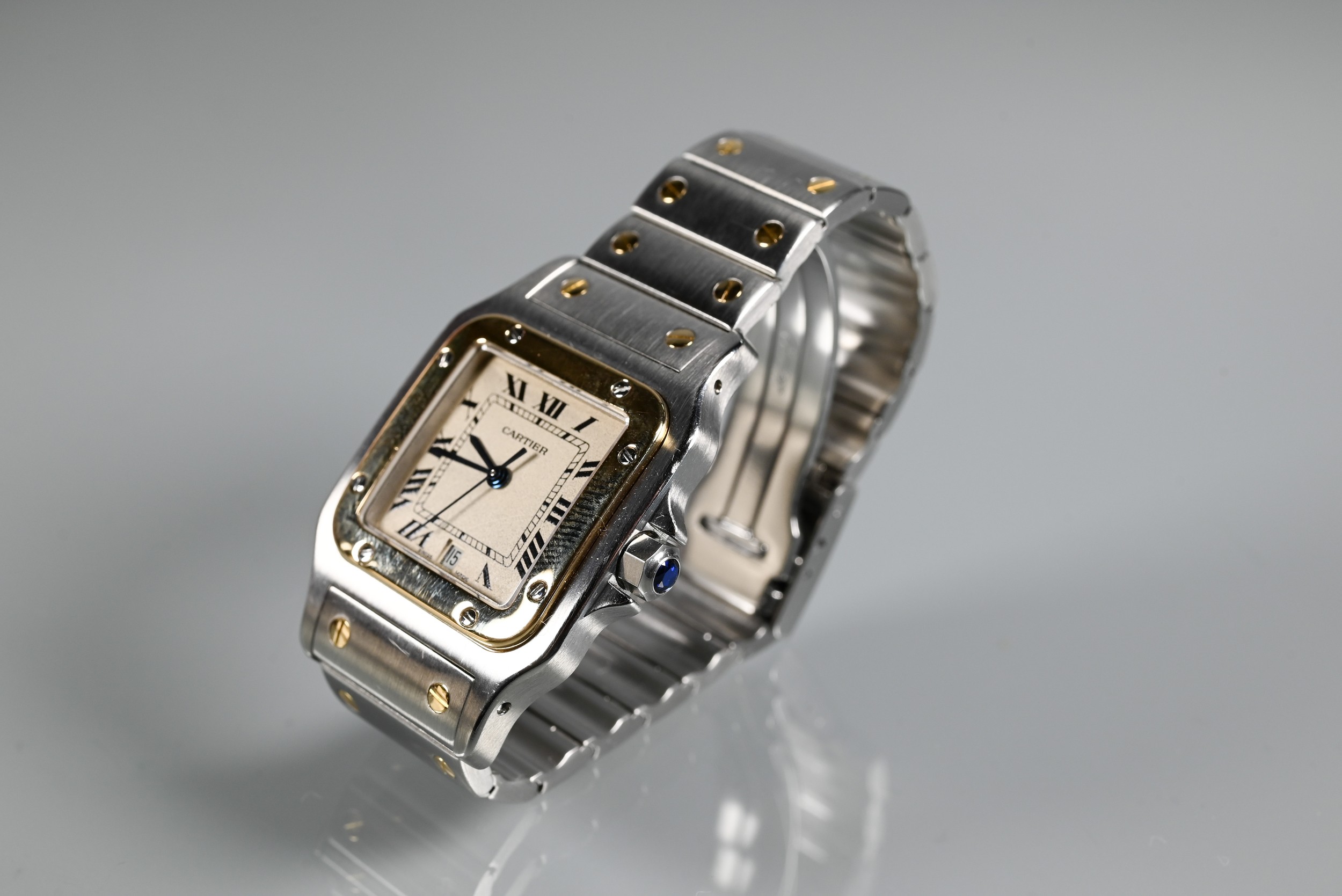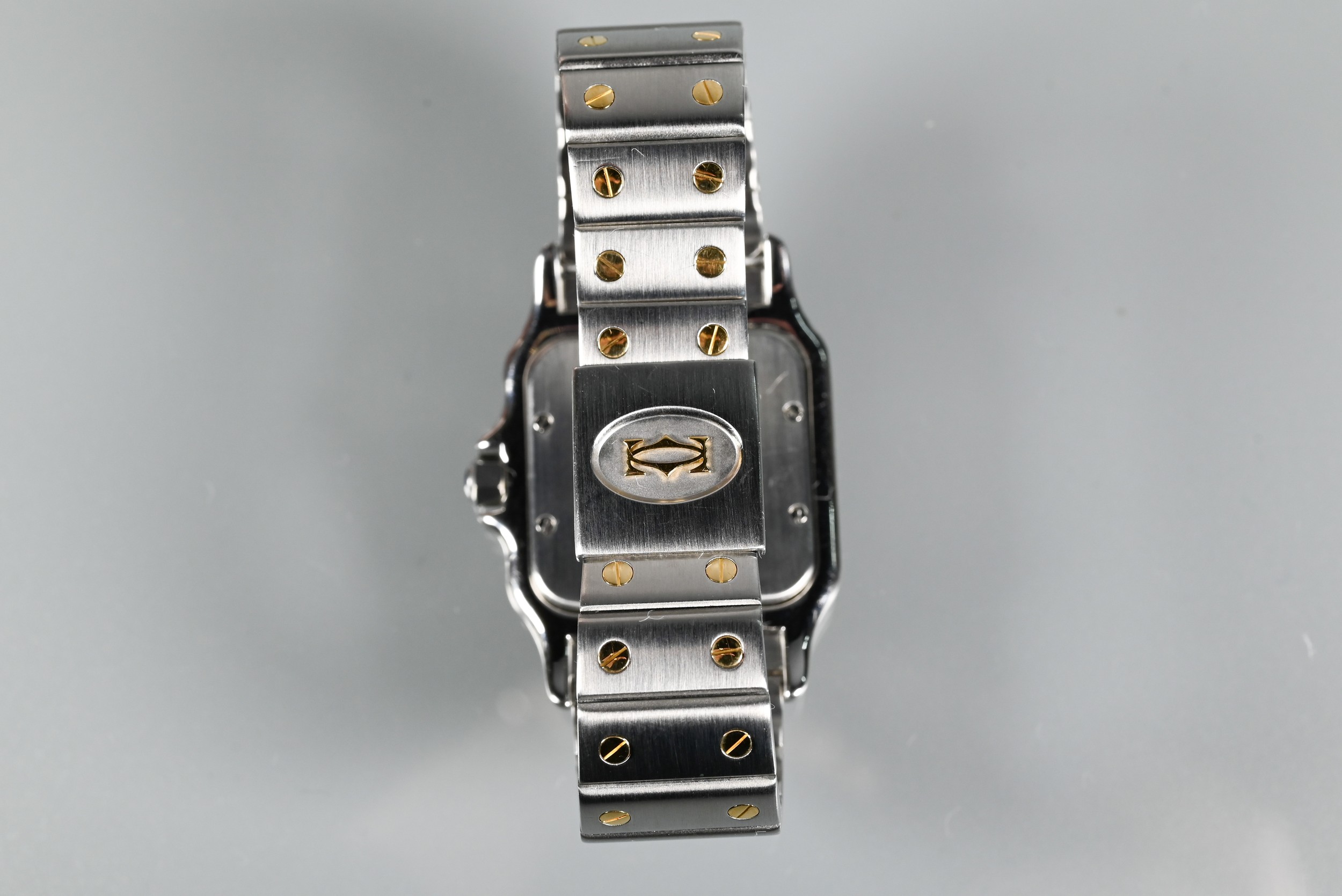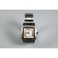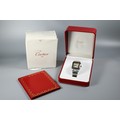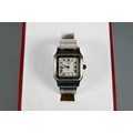 A Cartier Santos Carree gold and stainless steel square wristwatch, quartz movement with calendar aperture dial, deployment bracelet, the case back numbered 187901 / 26904, boxed with spare bracelet links and documents, running at time of inspection, appears unworn