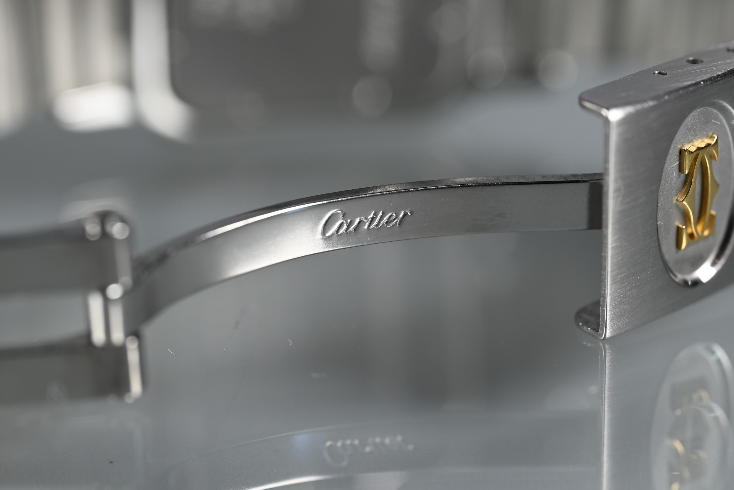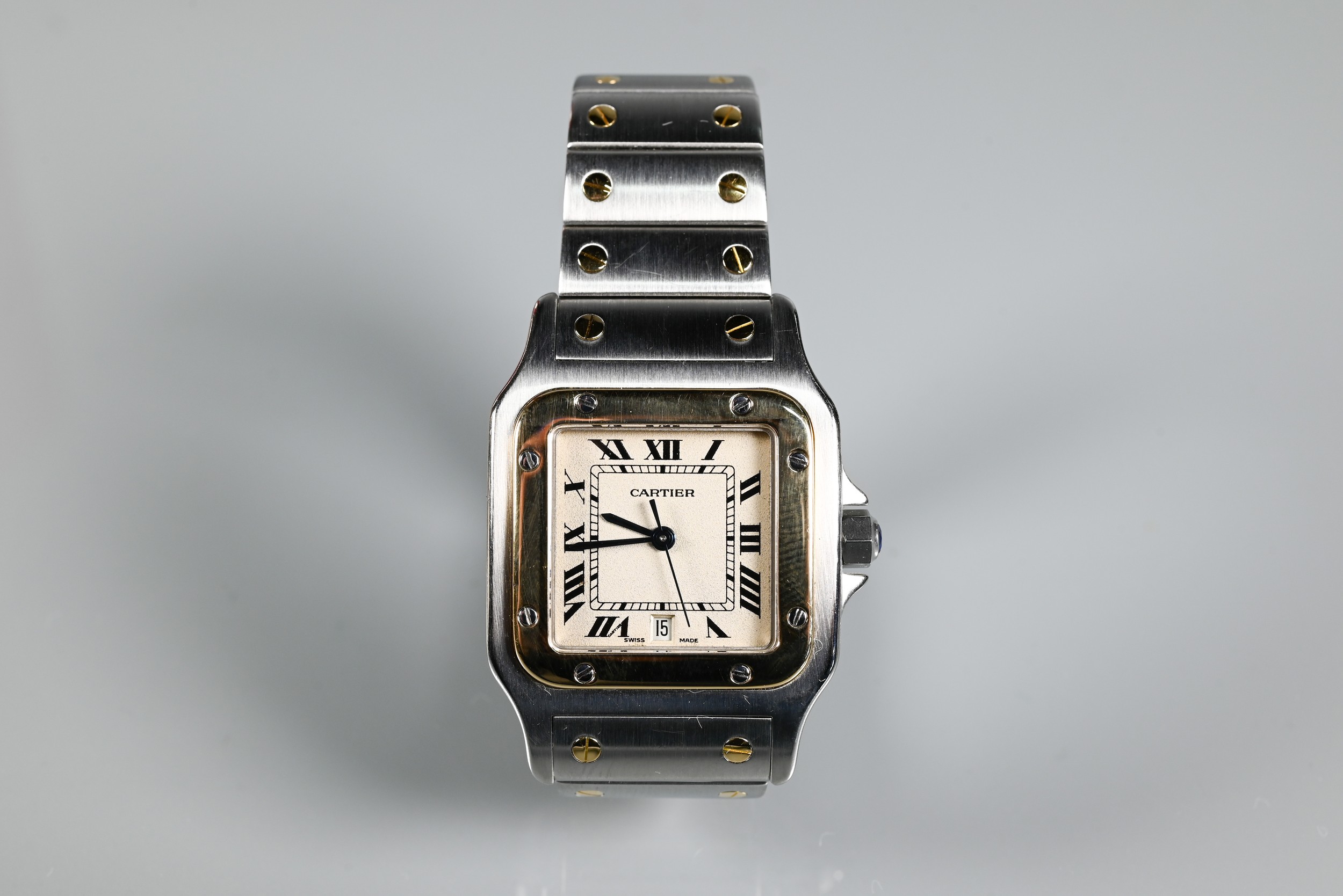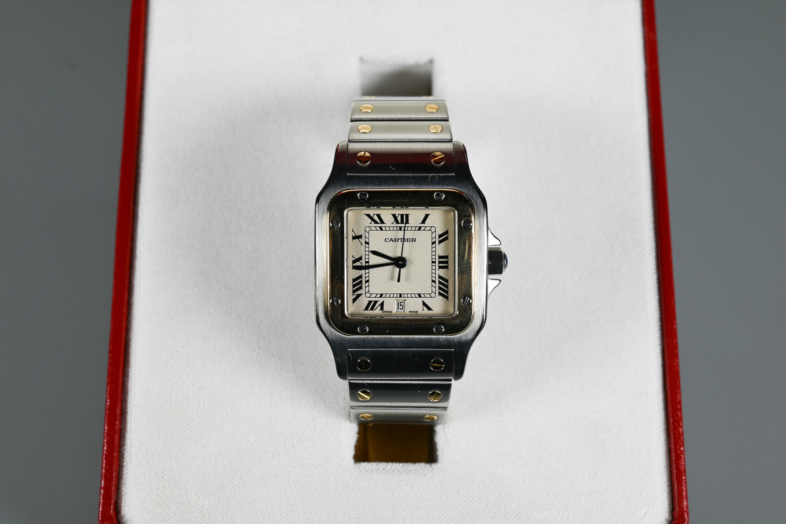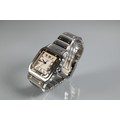 A Cartier Santos Carree gold and stainless steel square wristwatch, quartz movement with calendar aperture dial, deployment bracelet, the case back numbered 187901 / 26904, boxed with spare bracelet links and documents, running at time of inspection, appears unworn