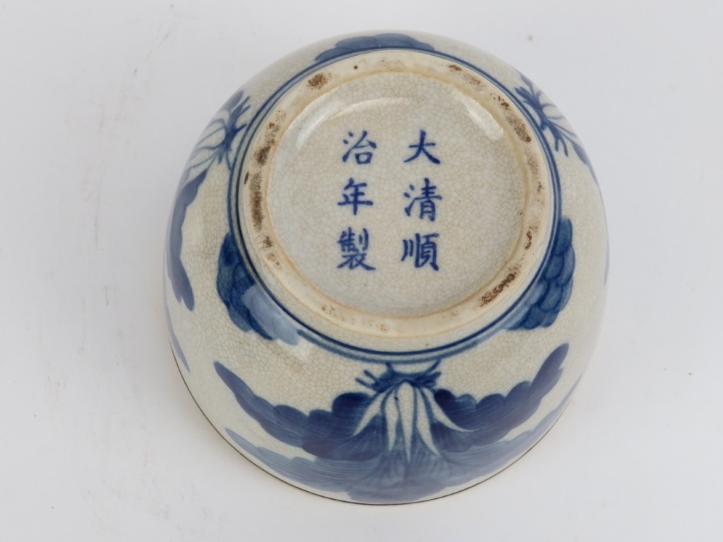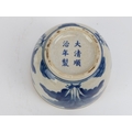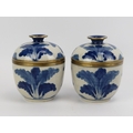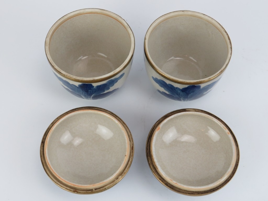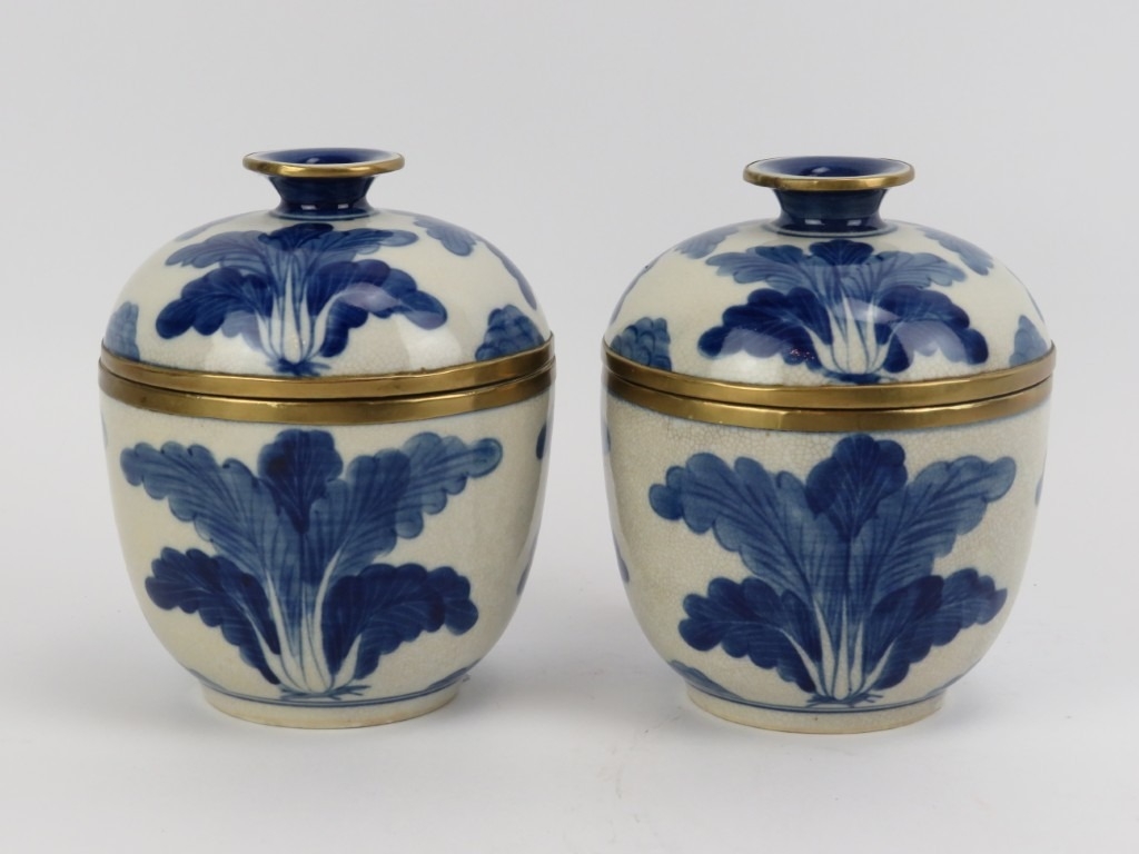 A pair of Chinese brass mounted blue and white crackled glazed jars with covers, 20th century. (2 items) 12.3 cm height.