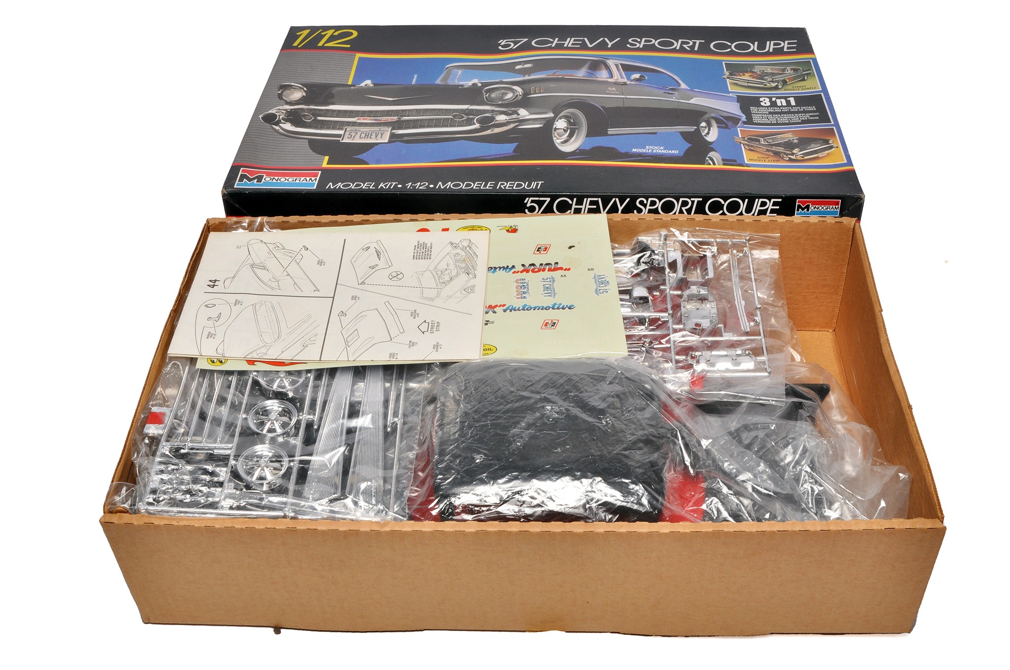 Monogram 1/12 plastic model vehicle kit comprising 1957 Chevrolet Sport Coupe - 3 in 1. Complete, unstarted.