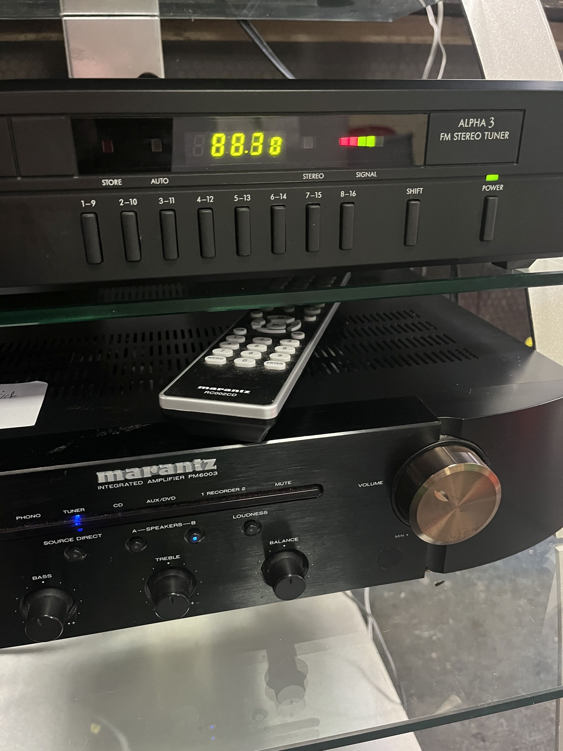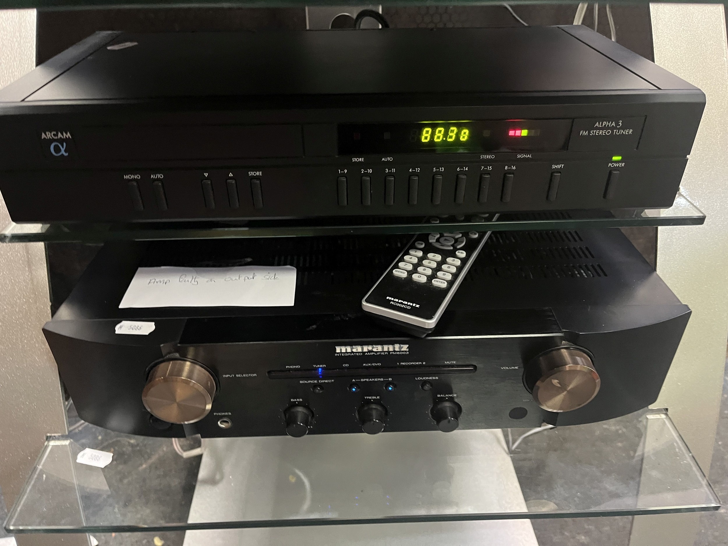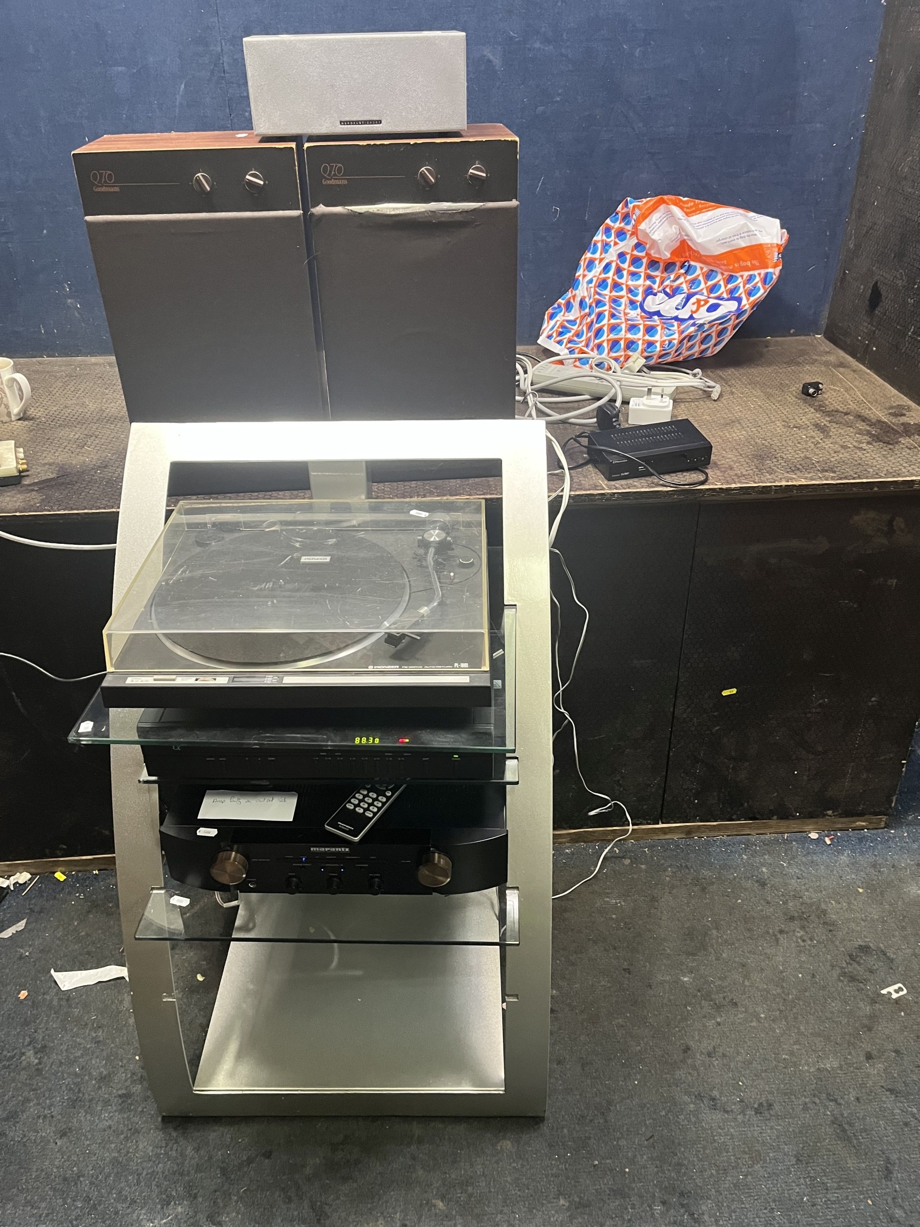A MARANTZ, PIONEER AND ARCAM COMPONENT HI FI, including an PM6003 amplifier, a PL-100X turntable, an Alpha 3 tuner, a hi fi stand, a pair of Goodmans Q70 speakers, a Mordaunt Short MS304 (all PAT pass and working), a EMtronics DVB receiver and cables (untested)