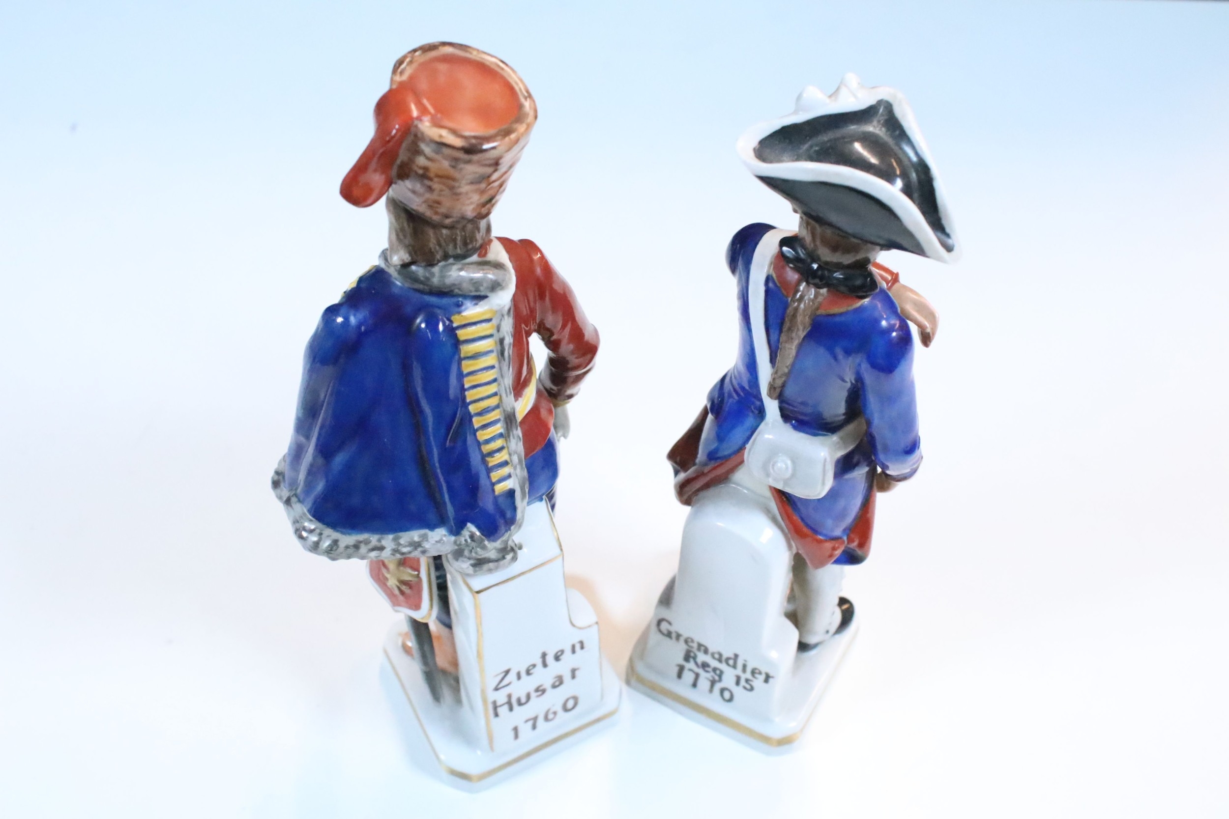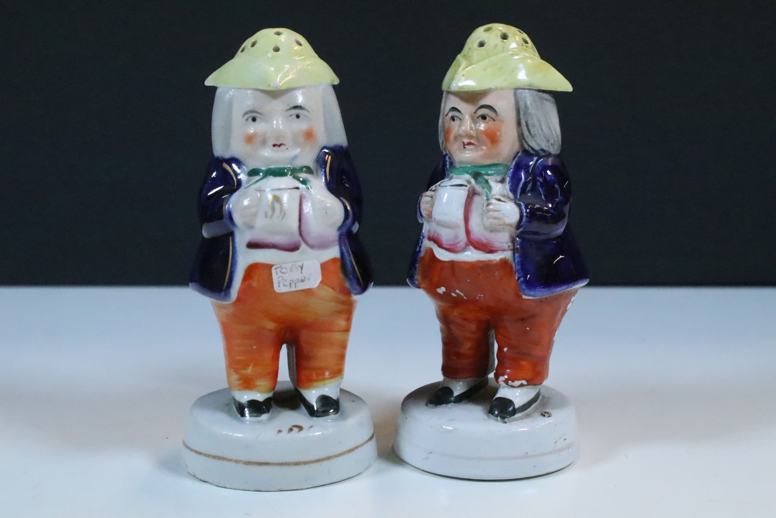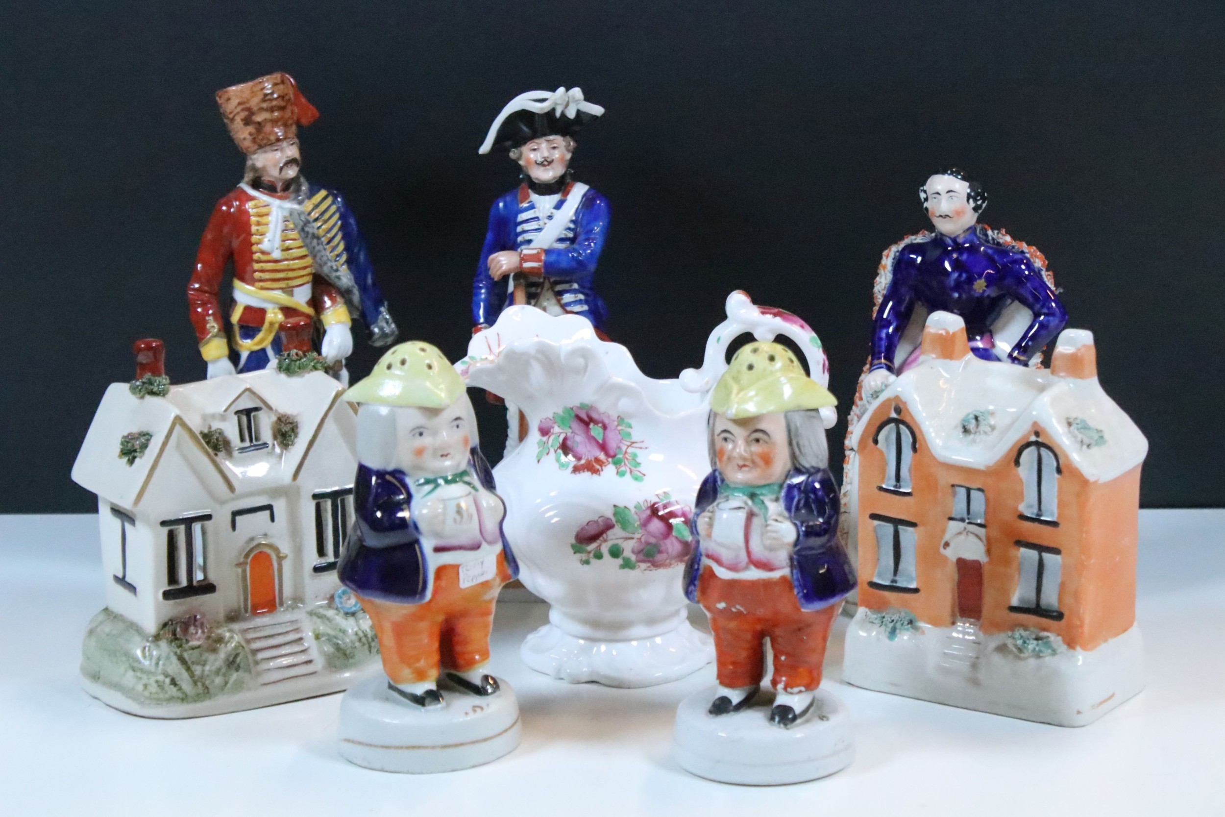 Group of 19th century and later figurines and models to include Toby cruet set, Sitzendorf Grenadier and Zieten Husar together with a Staffordshire flatback Prince Albert and a floral jug, etc (8)