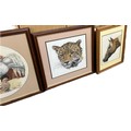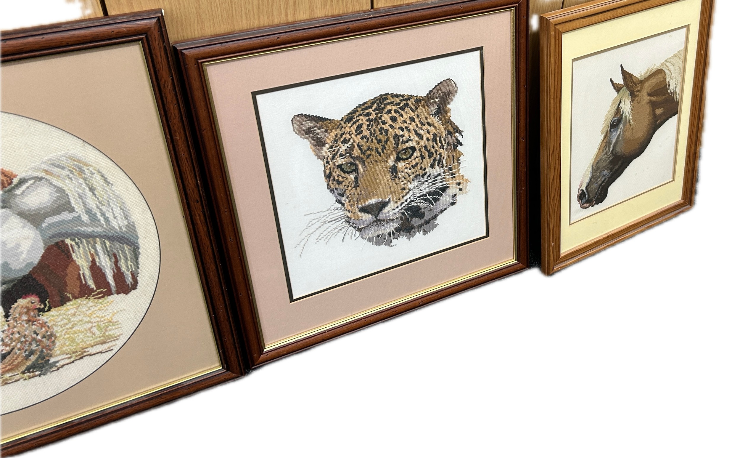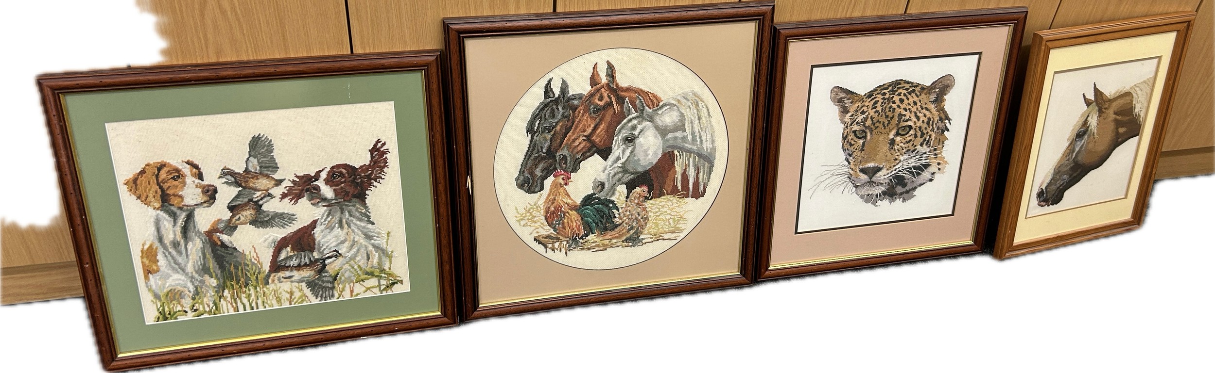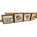 Four framed tapestries depicting animals, dogs, horses, etc largest measures approximately 21 inches tall x 21 wide