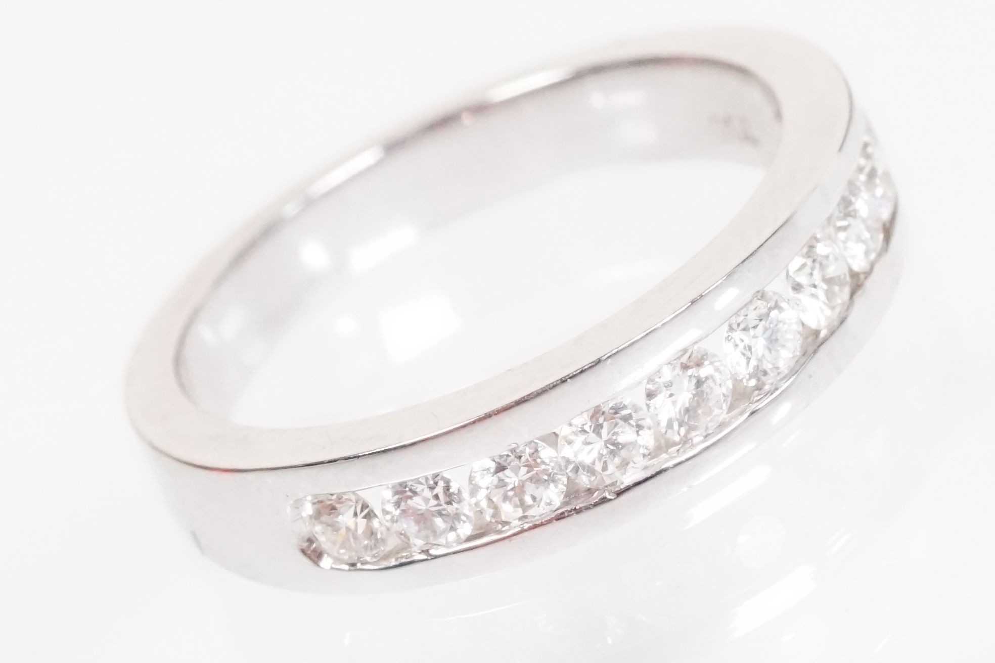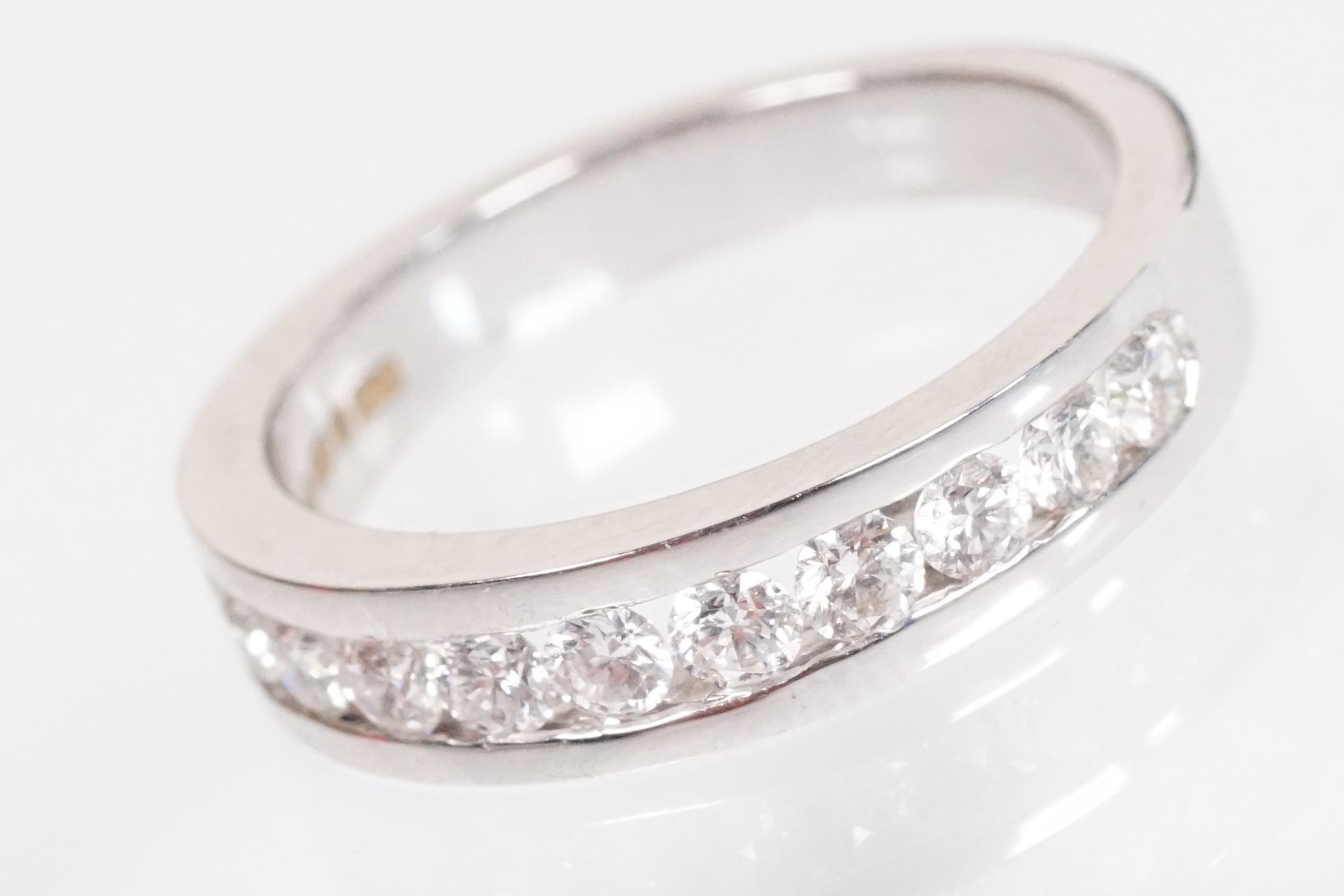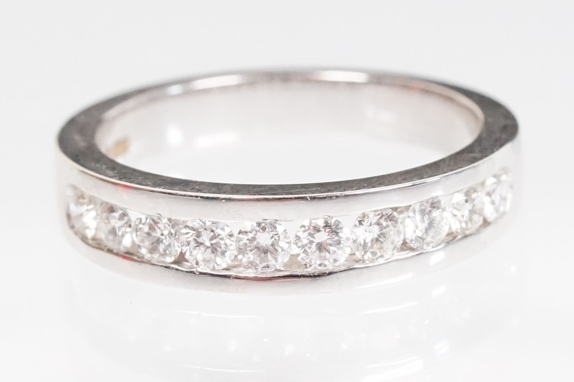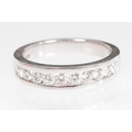 18ct white gold and diamond half eternity ring. The ring being set with ten round brilliant cut diamonds in channel settings. Hallmarked London 2015. Size K.