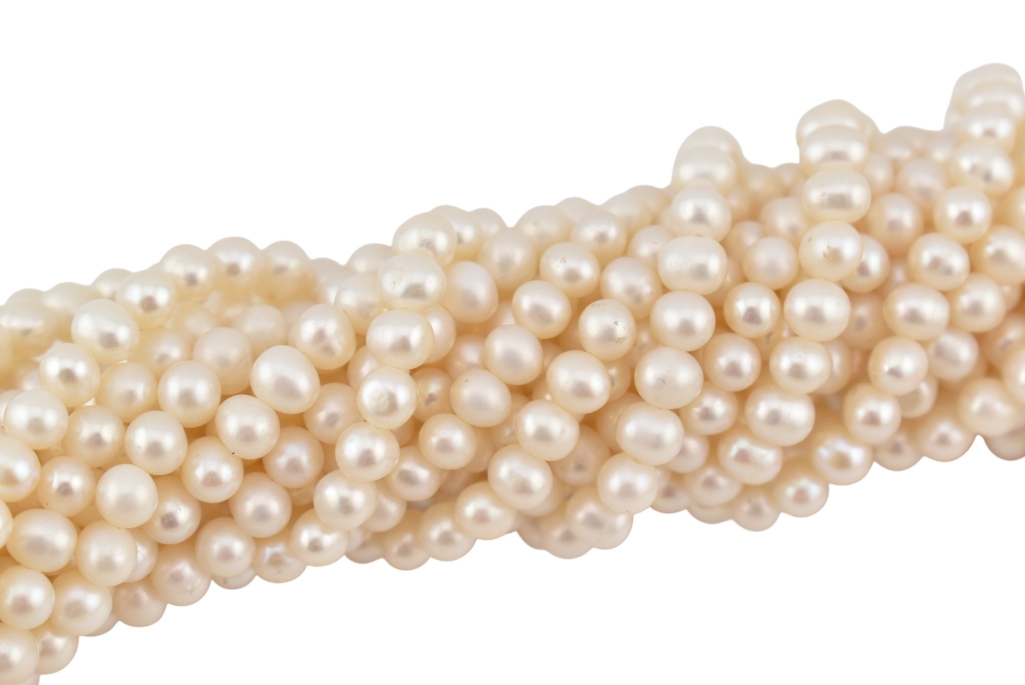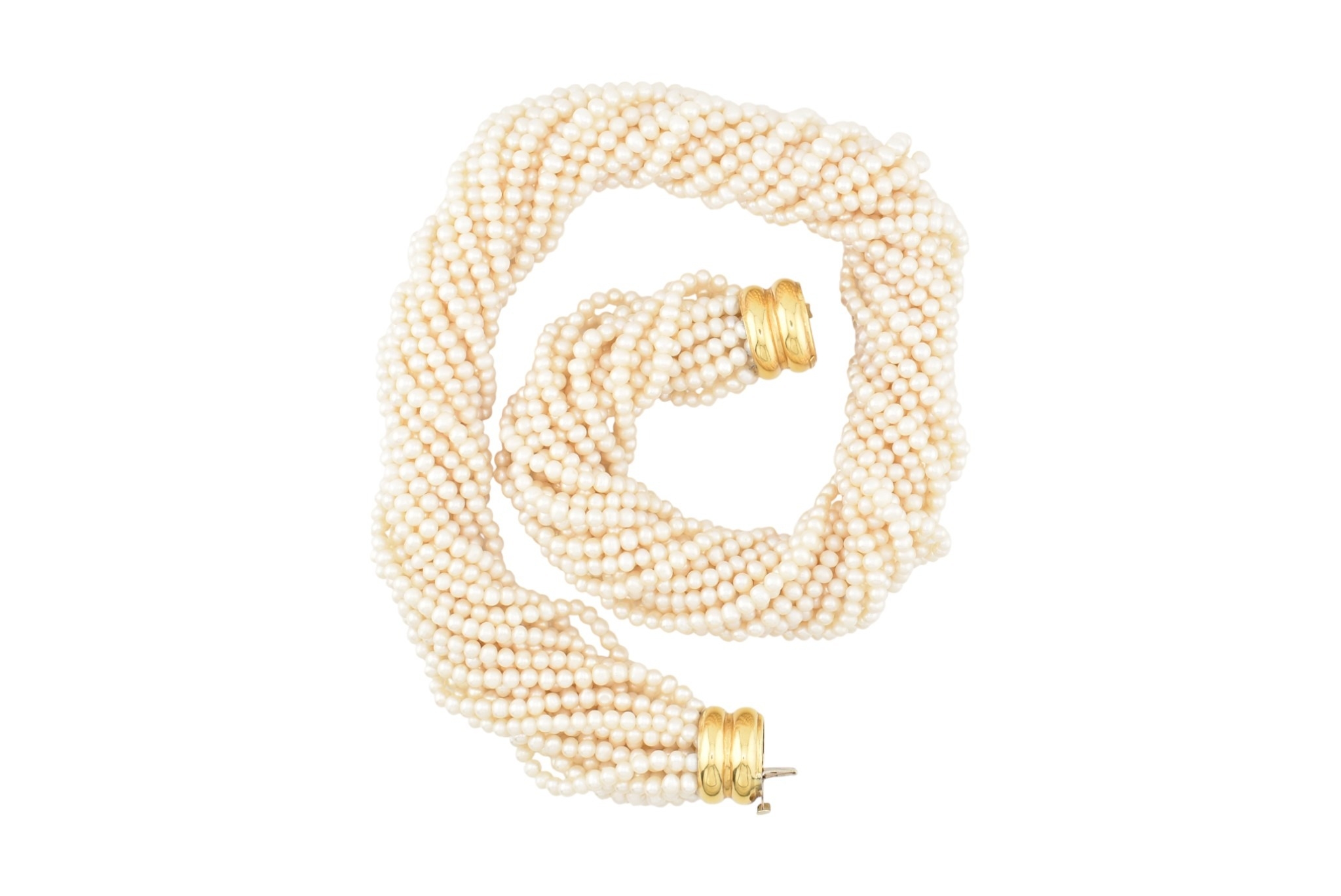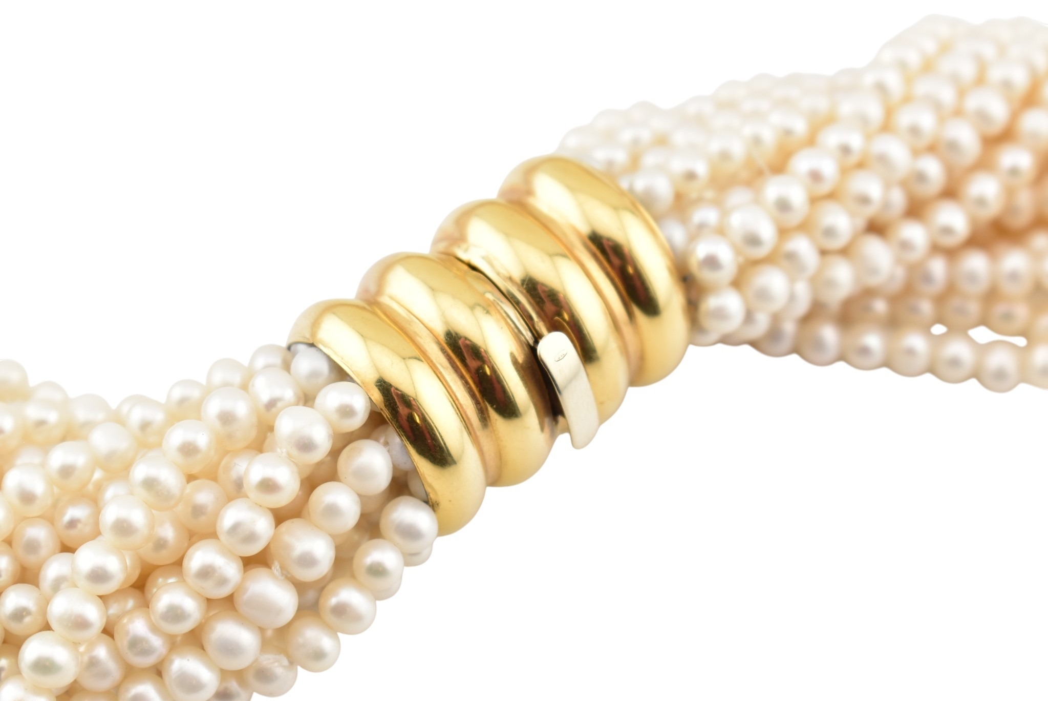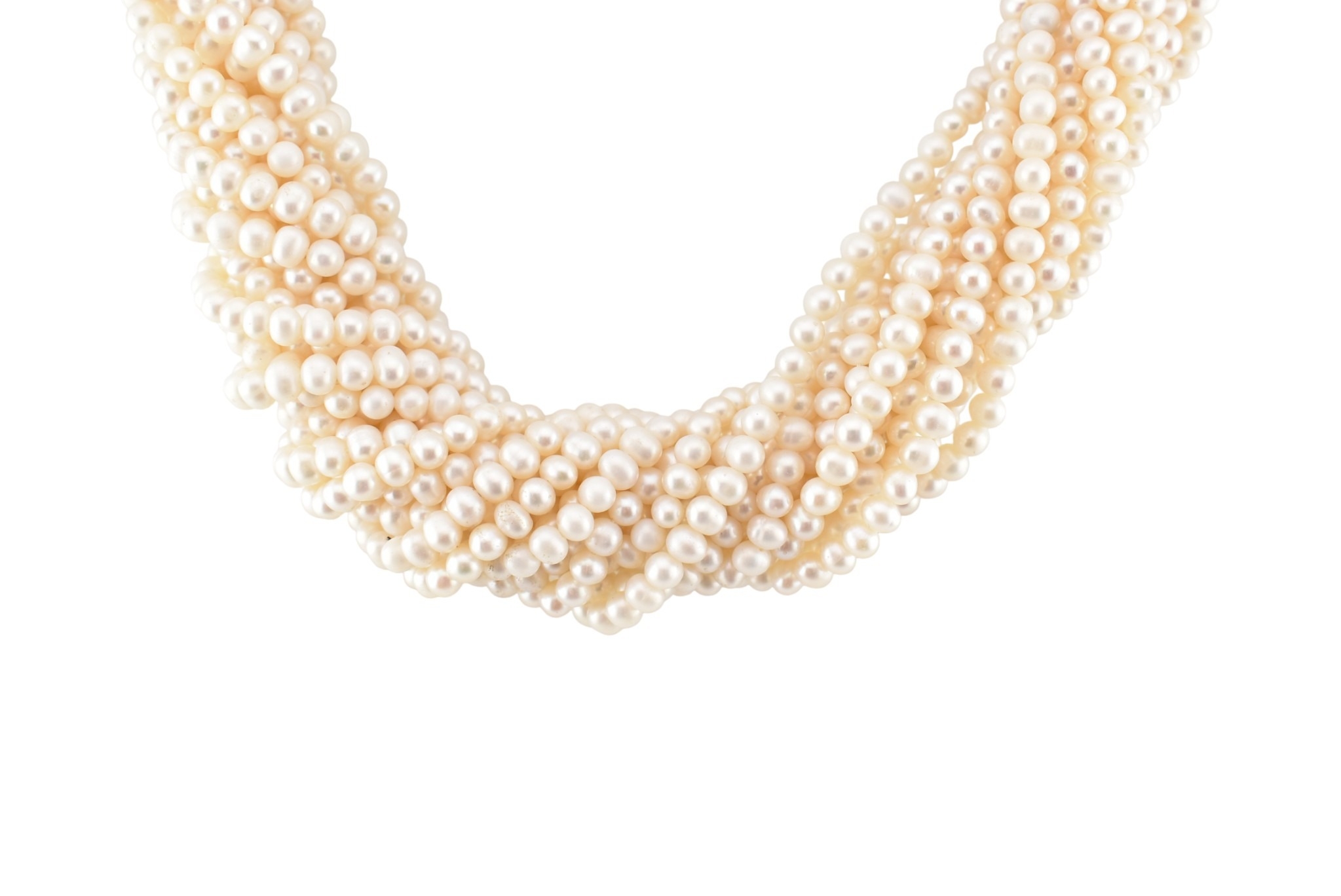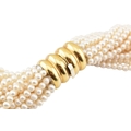 A multistrand pearl necklace with an oversized box clasp. The necklace strung with 18 strands of cultured pearls sizes 3-5mm. Total weight 440g. Measures 65cm long.