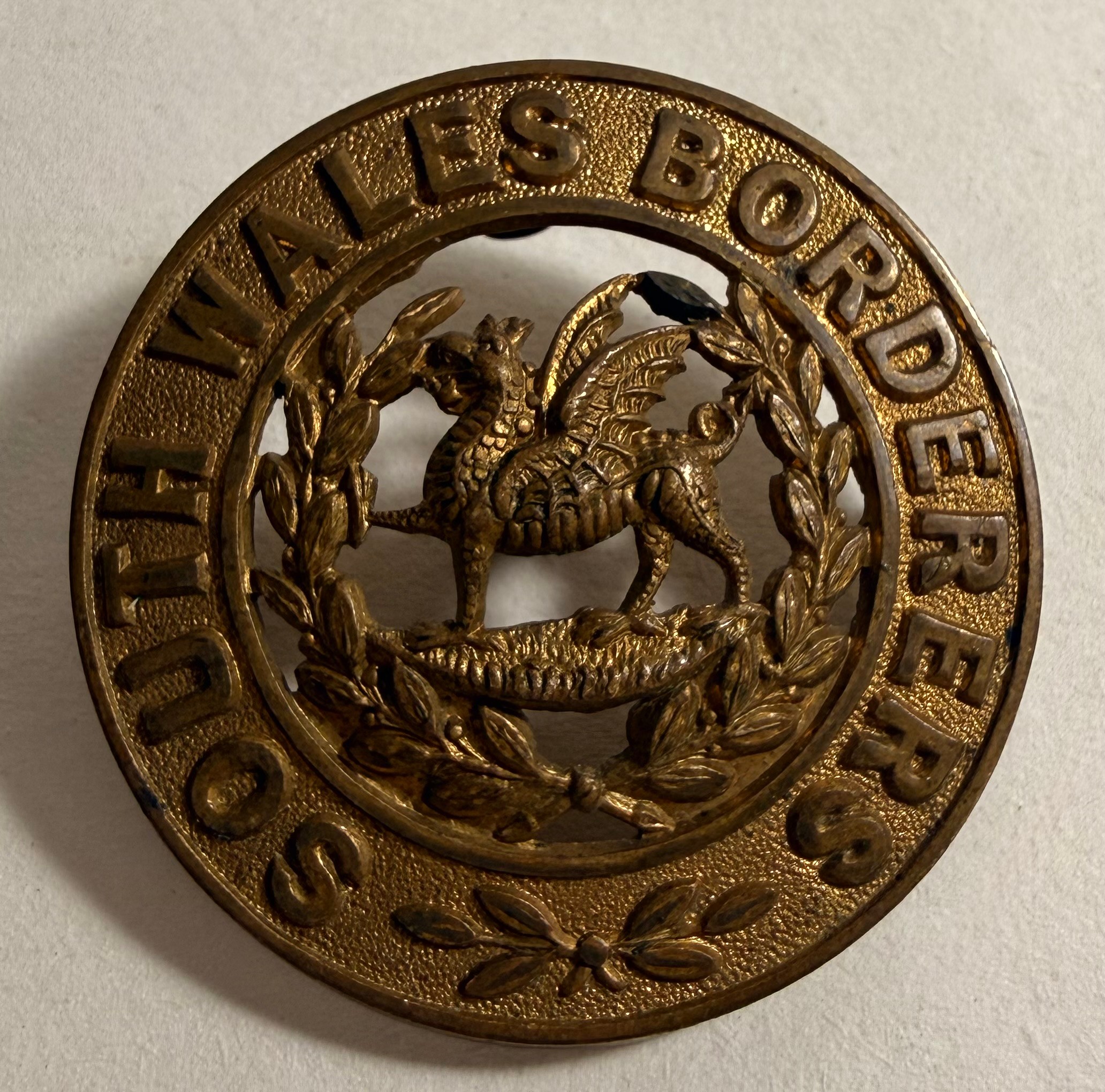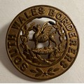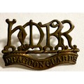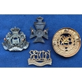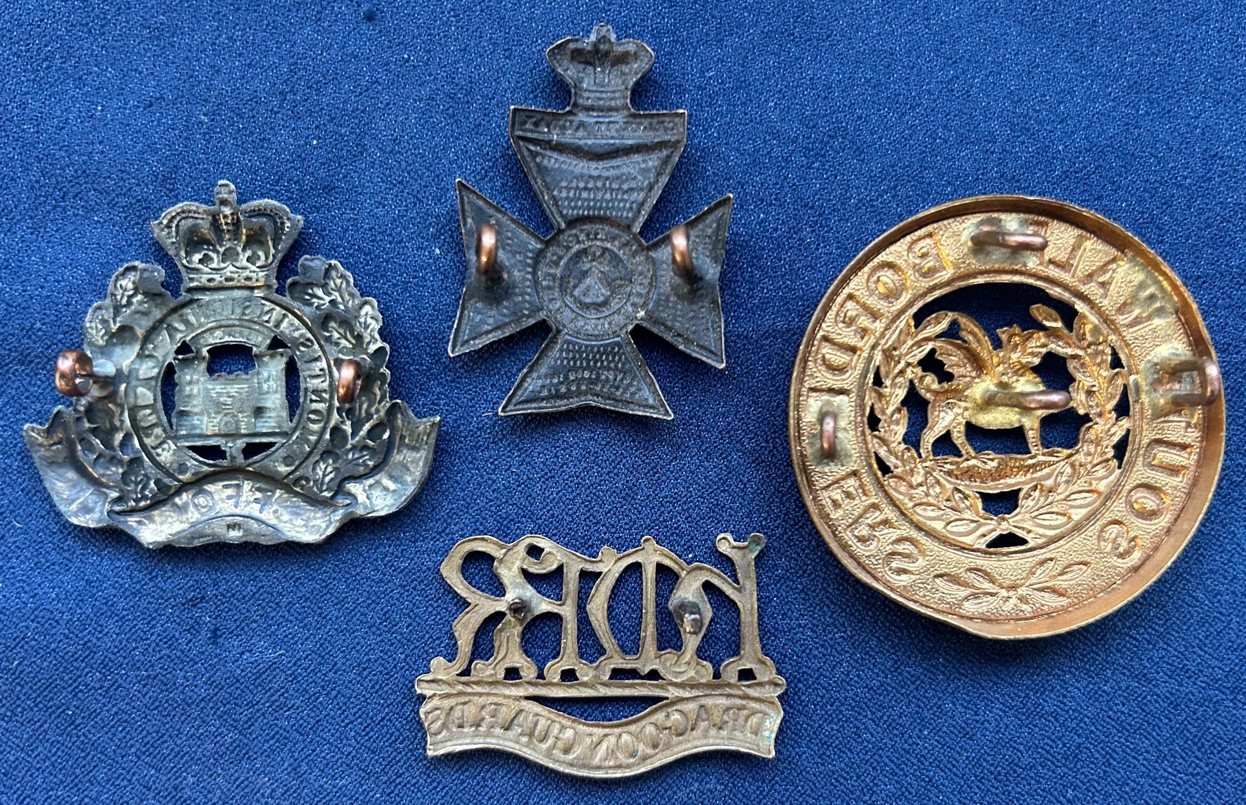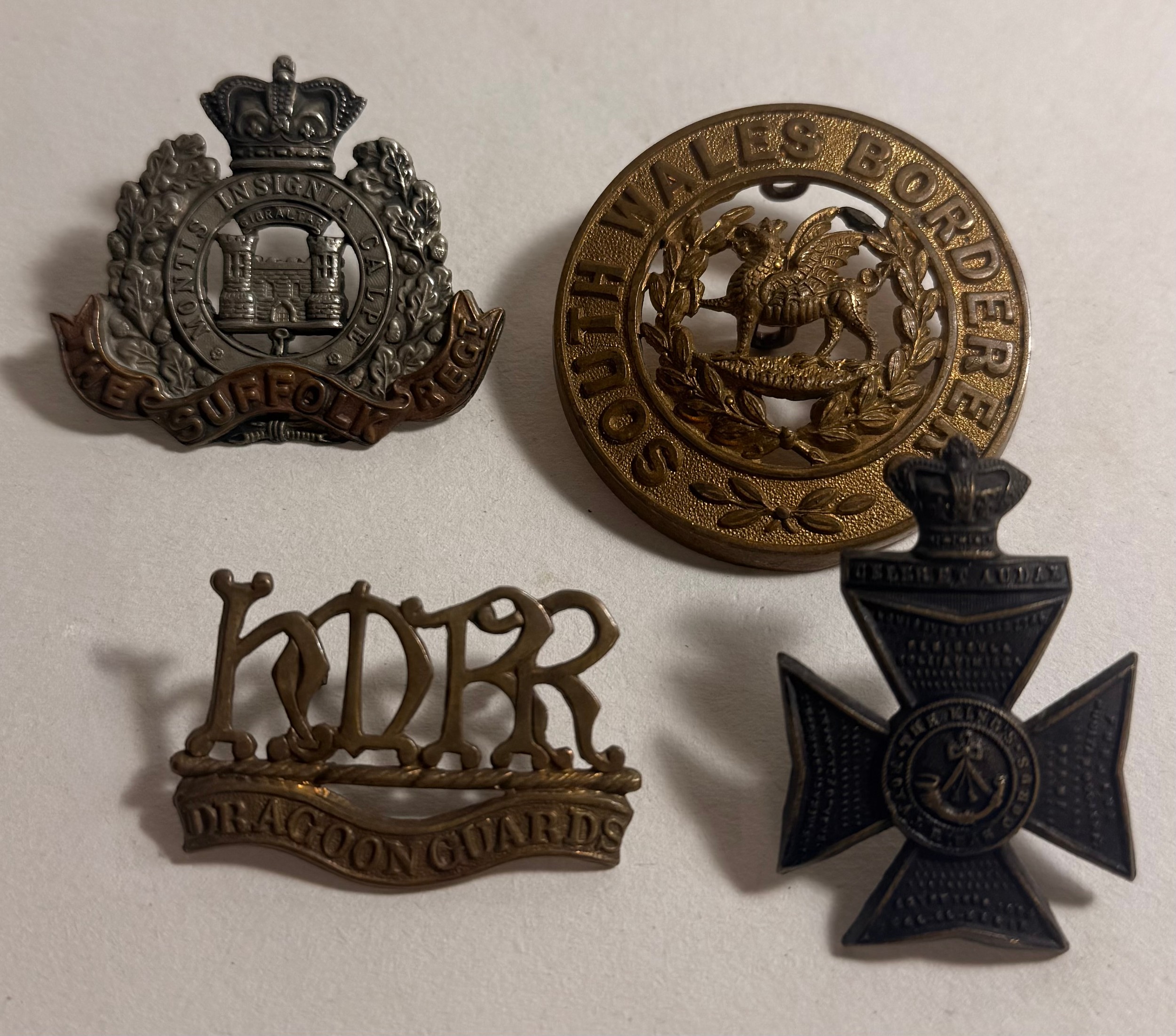 Victorian cap badge of the Suffolk Regiment; collar badge of H.M.R.R. Dragoon Guards (lugs af); small Victorian cap badge of the K.R.R.C.; and HPC of the South Wales Borderers. GC (4)
