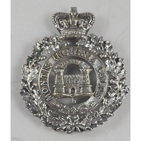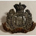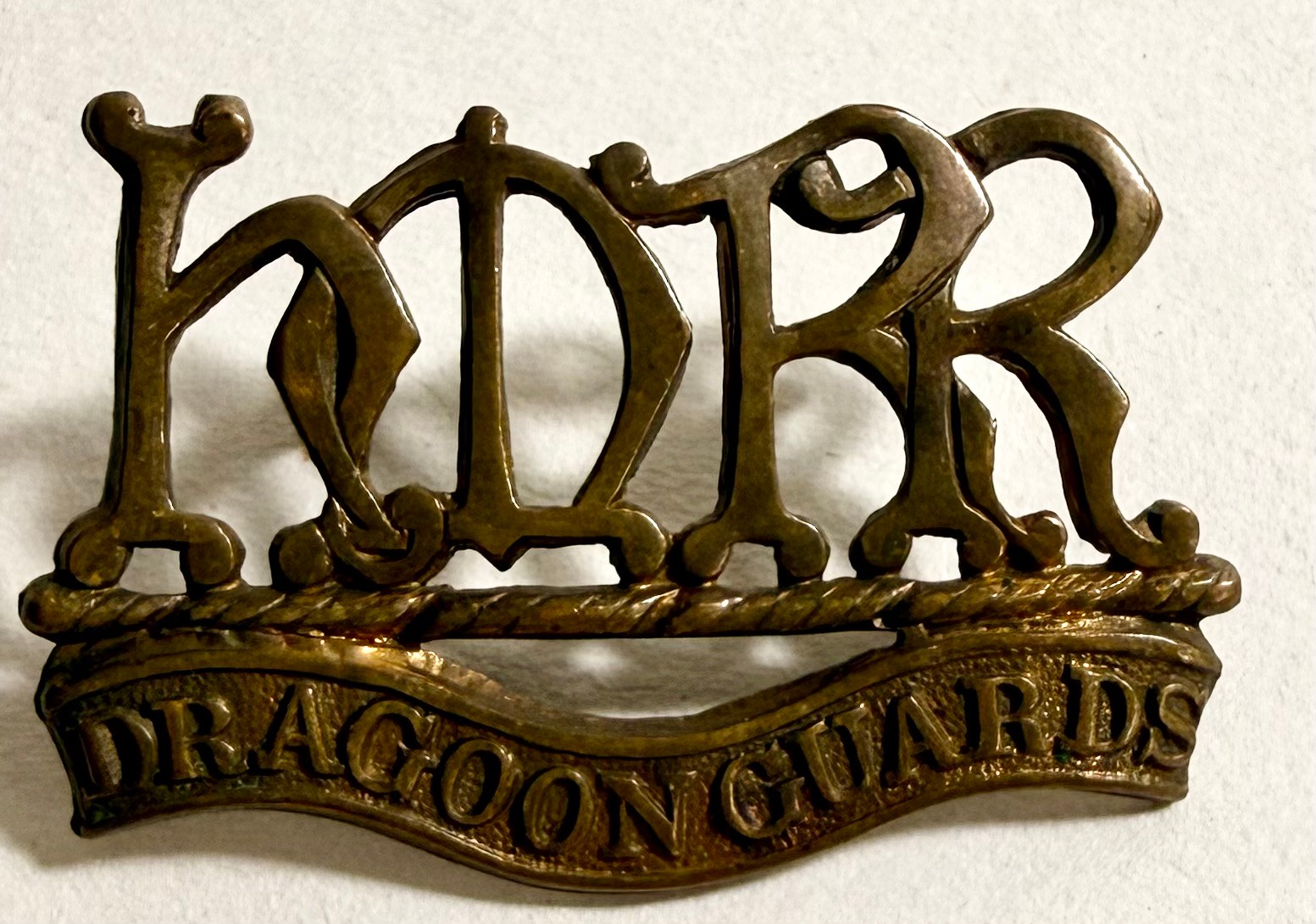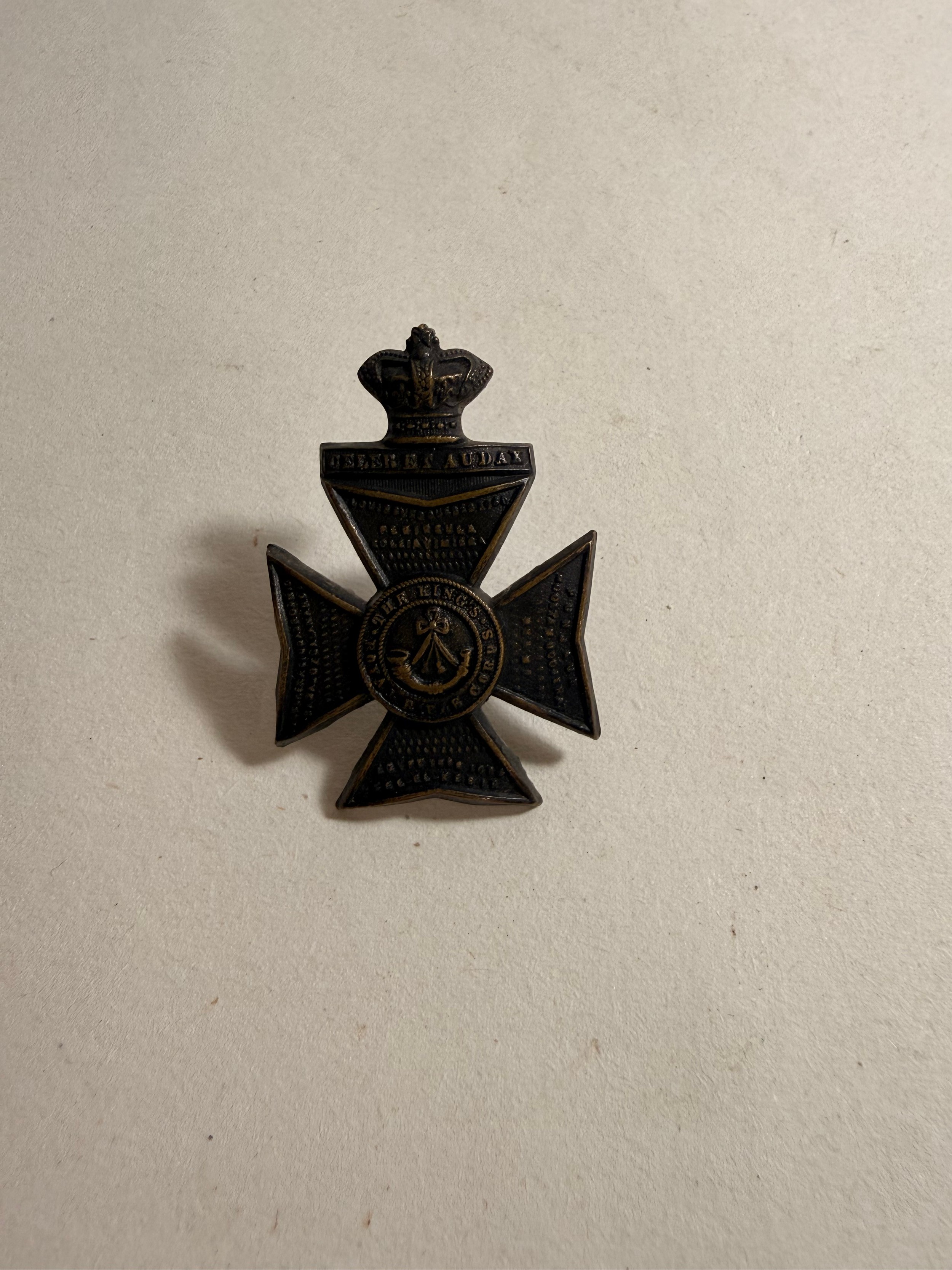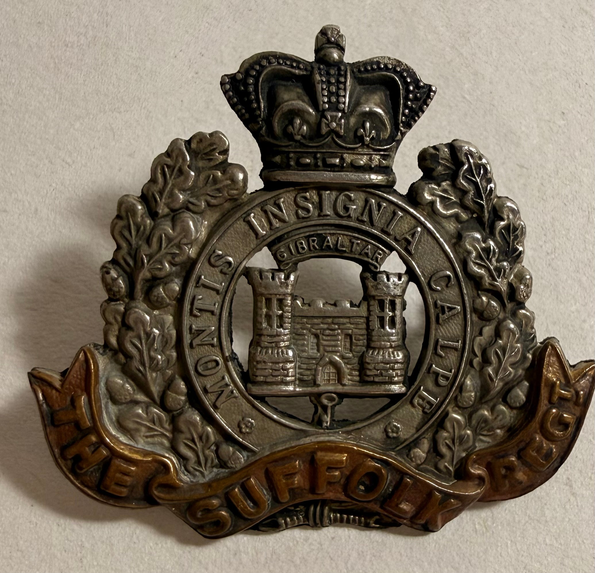 Victorian cap badge of the Suffolk Regiment; collar badge of H.M.R.R. Dragoon Guards (lugs af); small Victorian cap badge of the K.R.R.C.; and HPC of the South Wales Borderers. GC (4)