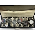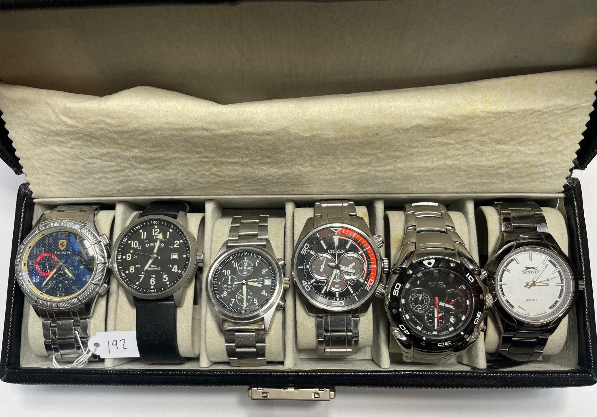 Collection of 6 Gent's watches, all in working order. Including Ferrari, Orvis, Pulsar, Citizen Eco-drive, One and Slazenger. All presented in a black watch case.