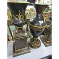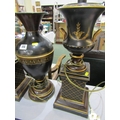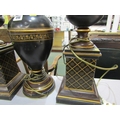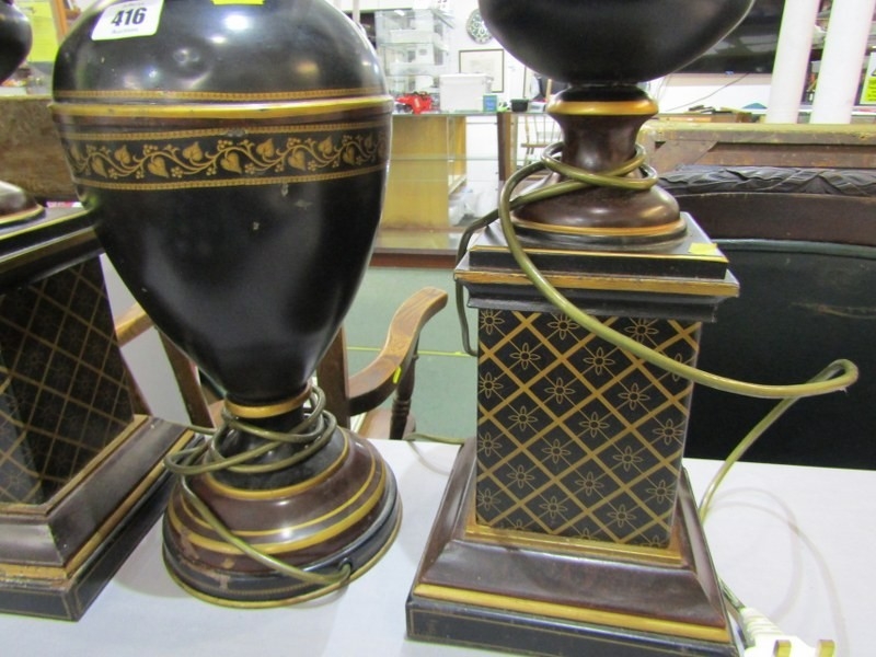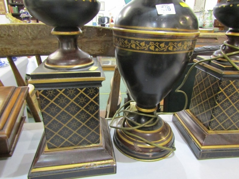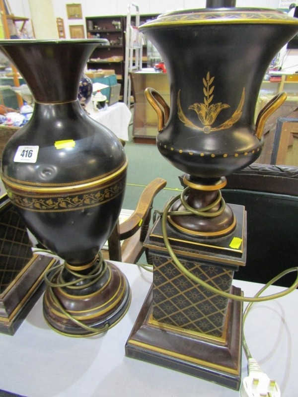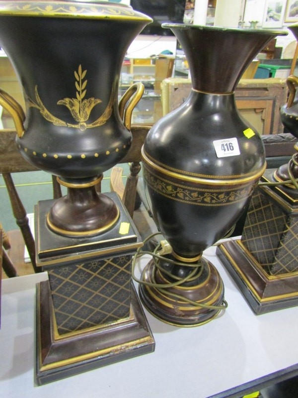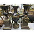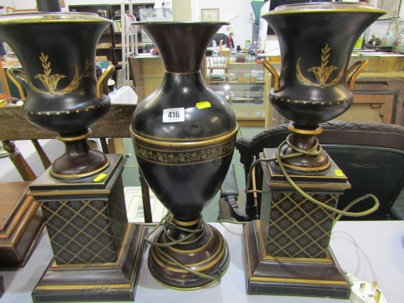 TABLE LAMPS, a pair of metal table lamps depicting urns on pedestal bases with floral decoration and a similar lamp in the form of a classical vase. Height of pair, 64cm