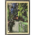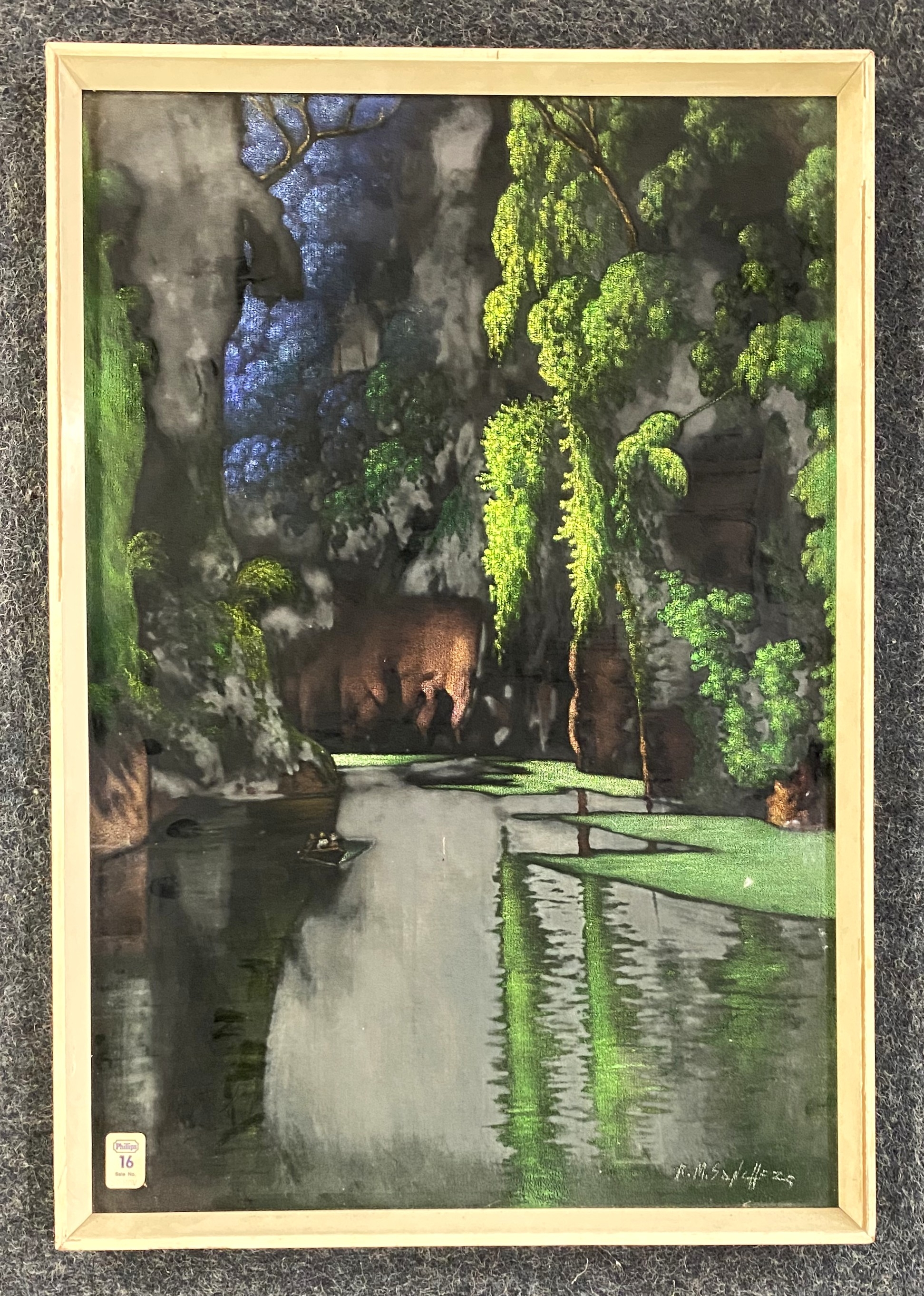 Benny Hill : Mexican School (mid 20th century), a landscape scene with lake and trees, oil on silk velvet type fabric, signed lower right 'R. M Sanchez', bearing Rowley Gallery label verso, framed, with Phillips lot label attached, 64.5cm x 43.5cm