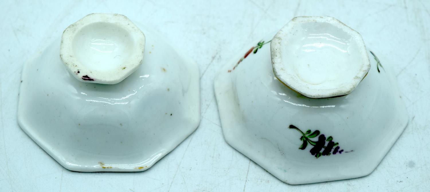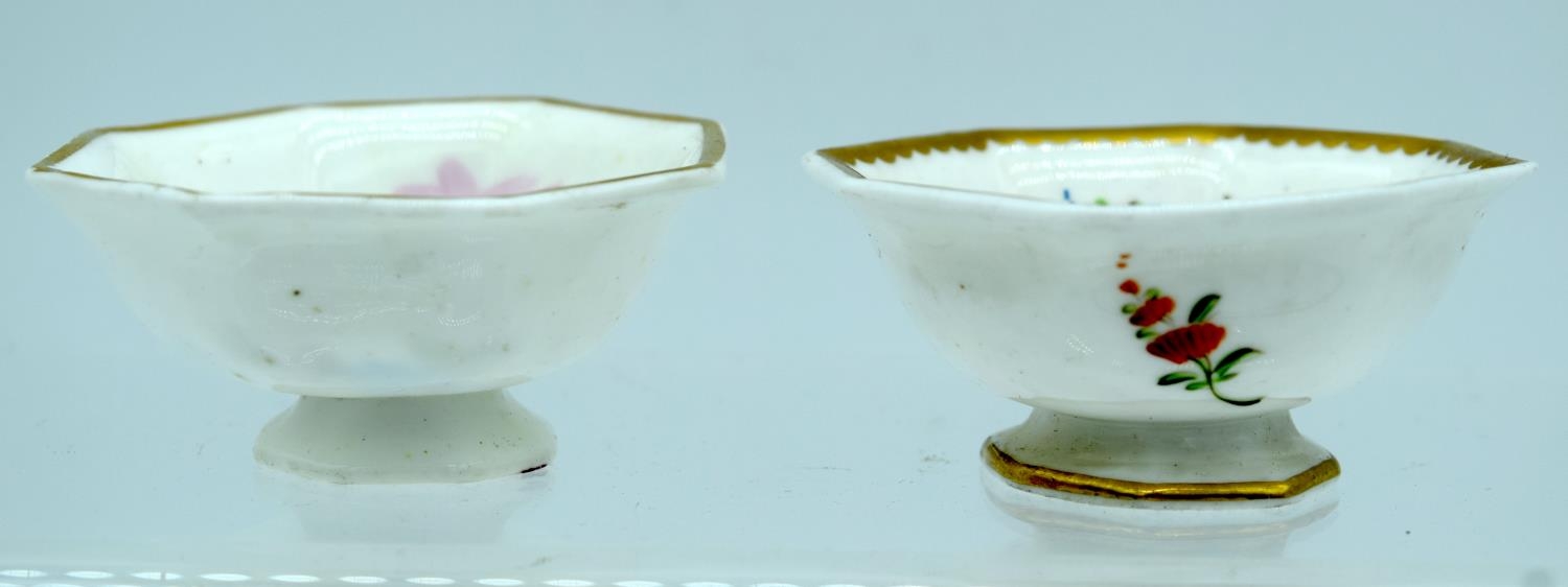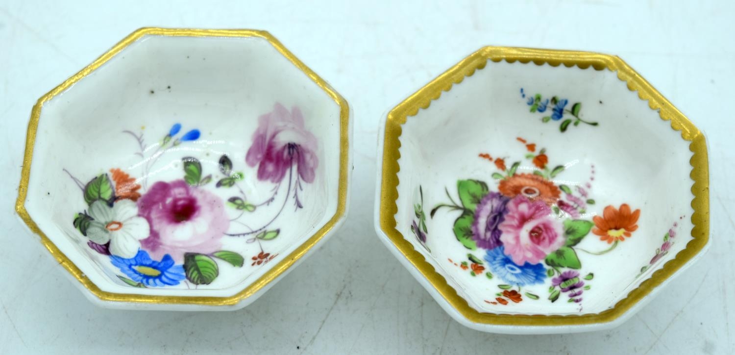 A PAIR OF EARLY 19TH CENTURY ENGLISH PORCELAIN SALTS painted with floral sprays. 6.5 cm wide.