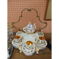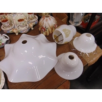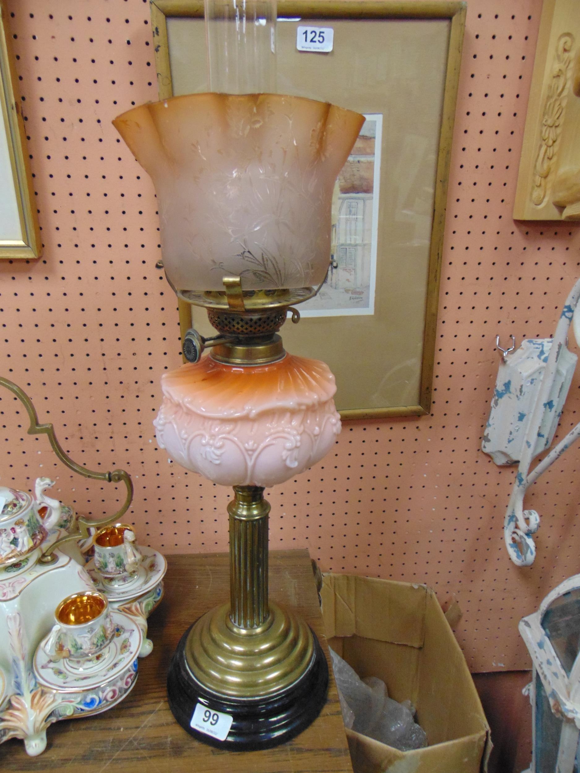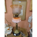 Victorian oil lamp with brass column, moulded glass reservoir and etched glass shade.