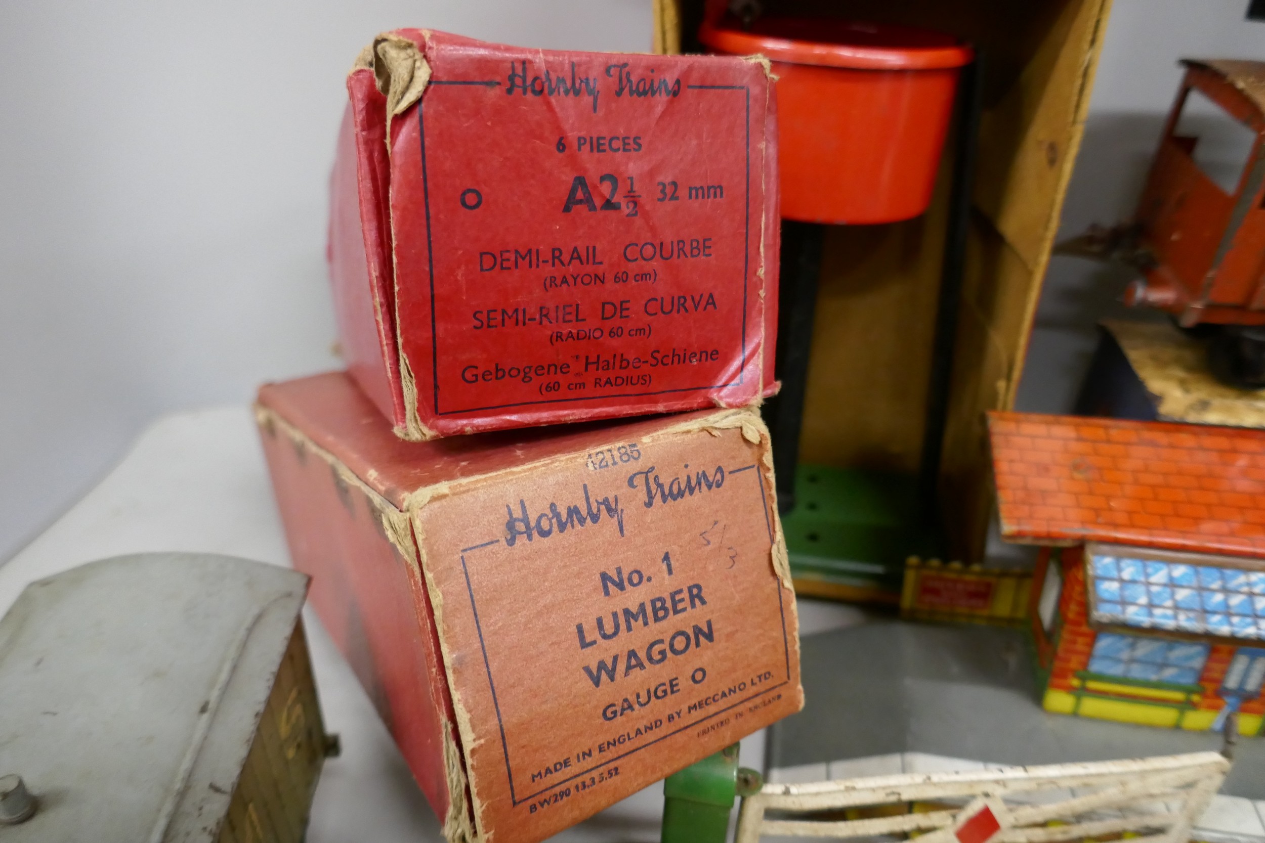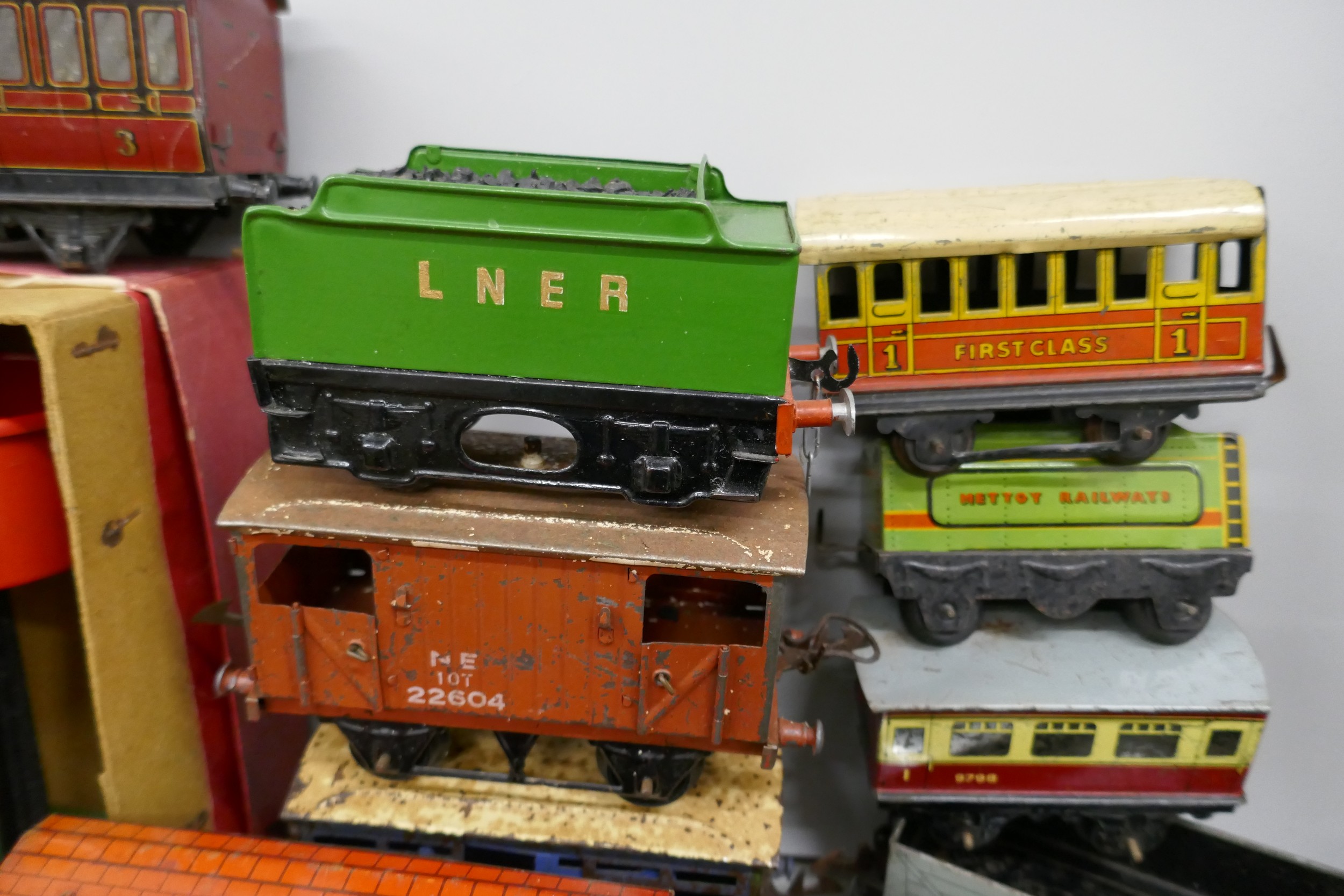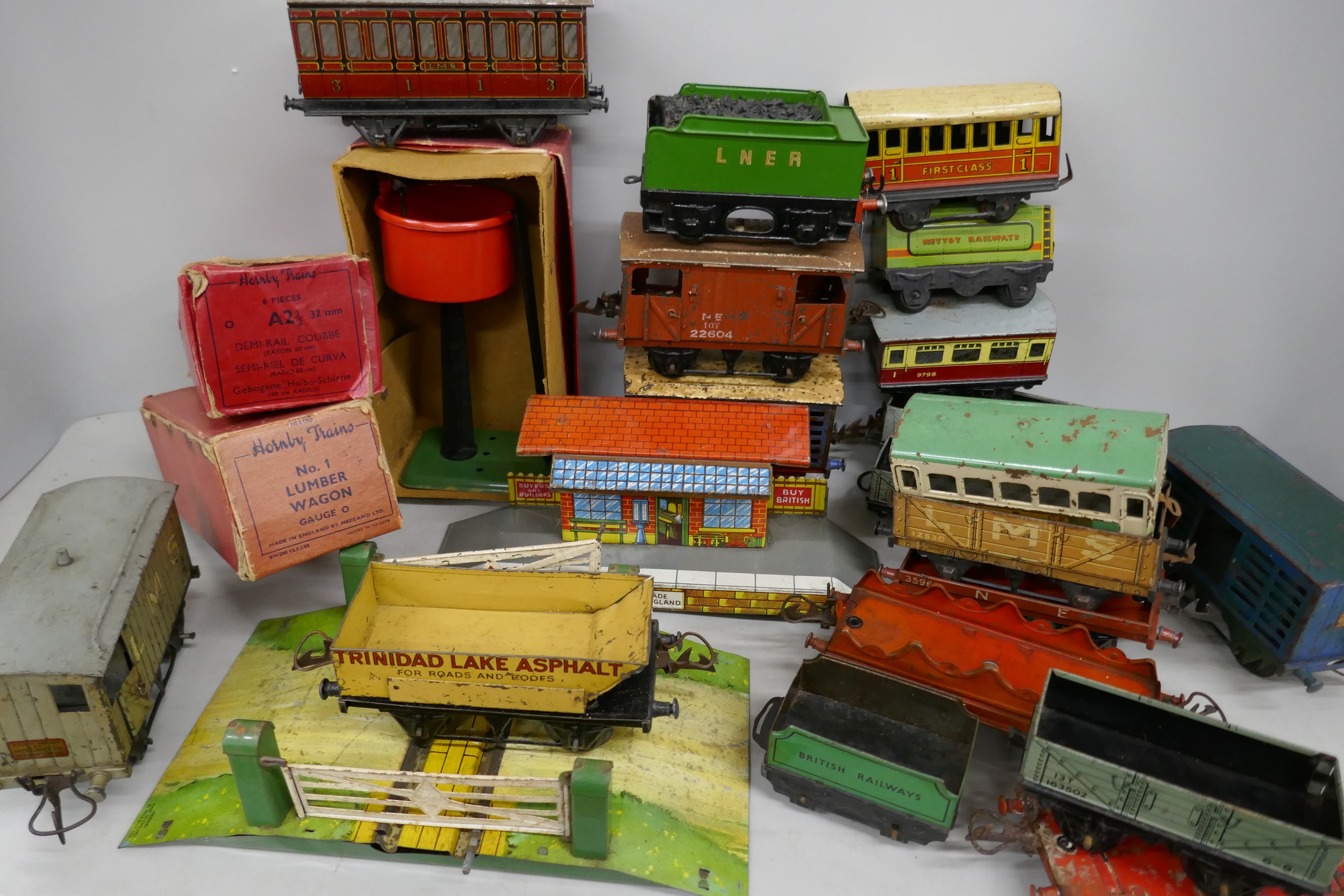 A collection of Hornby 0 gauge model railway, to include, wagons, coaches, etc., some boxed
