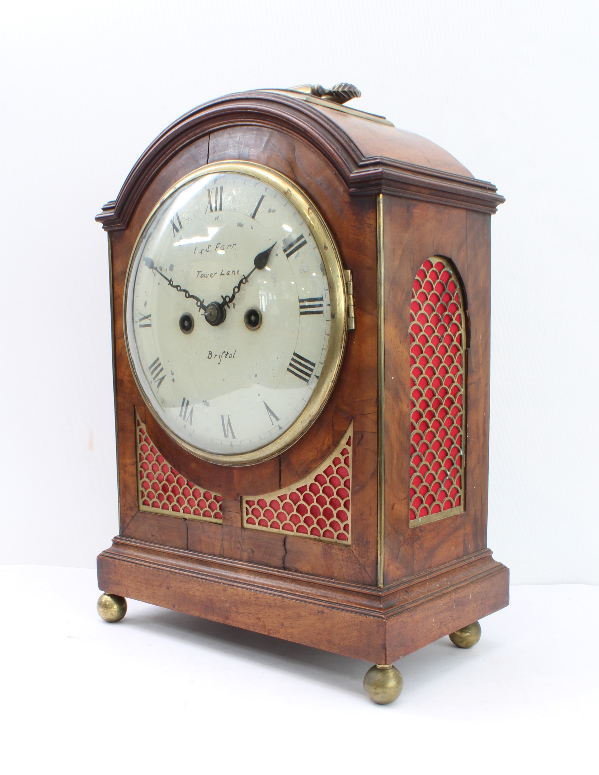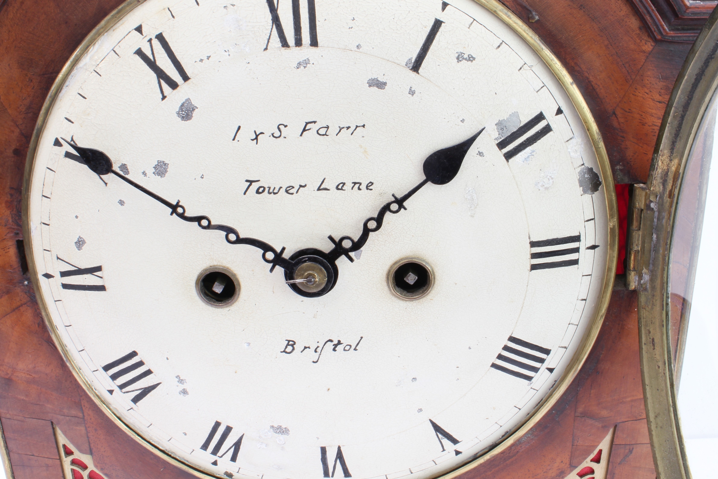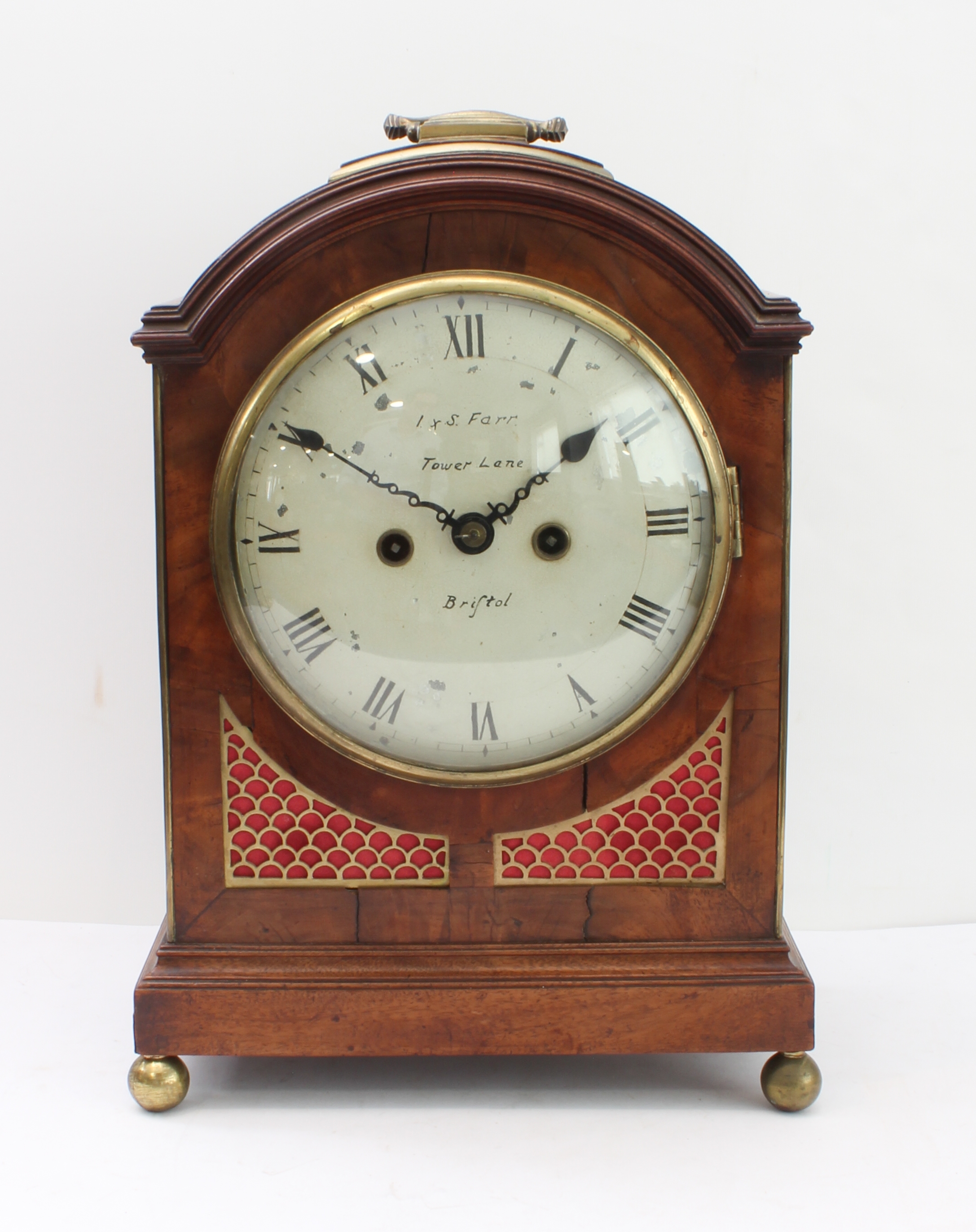 An early 19th century mahogany-cased eight-day bracket clock; the repainted cream enamel dial signed 'I. x S. Farr, Tallow Lane, Bristol' and with Roman numerals; twin fusee movement behind an engraved brass backplate with replaced bell and adapted hammer-strike; arch-topped case with brass carrying-handle; fish-scale pierced brass sound-holes; four gilded spherical feet; with pendulum. (43.5 high x 28 cm wide)