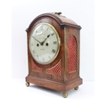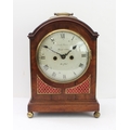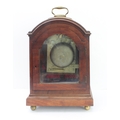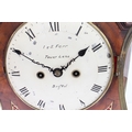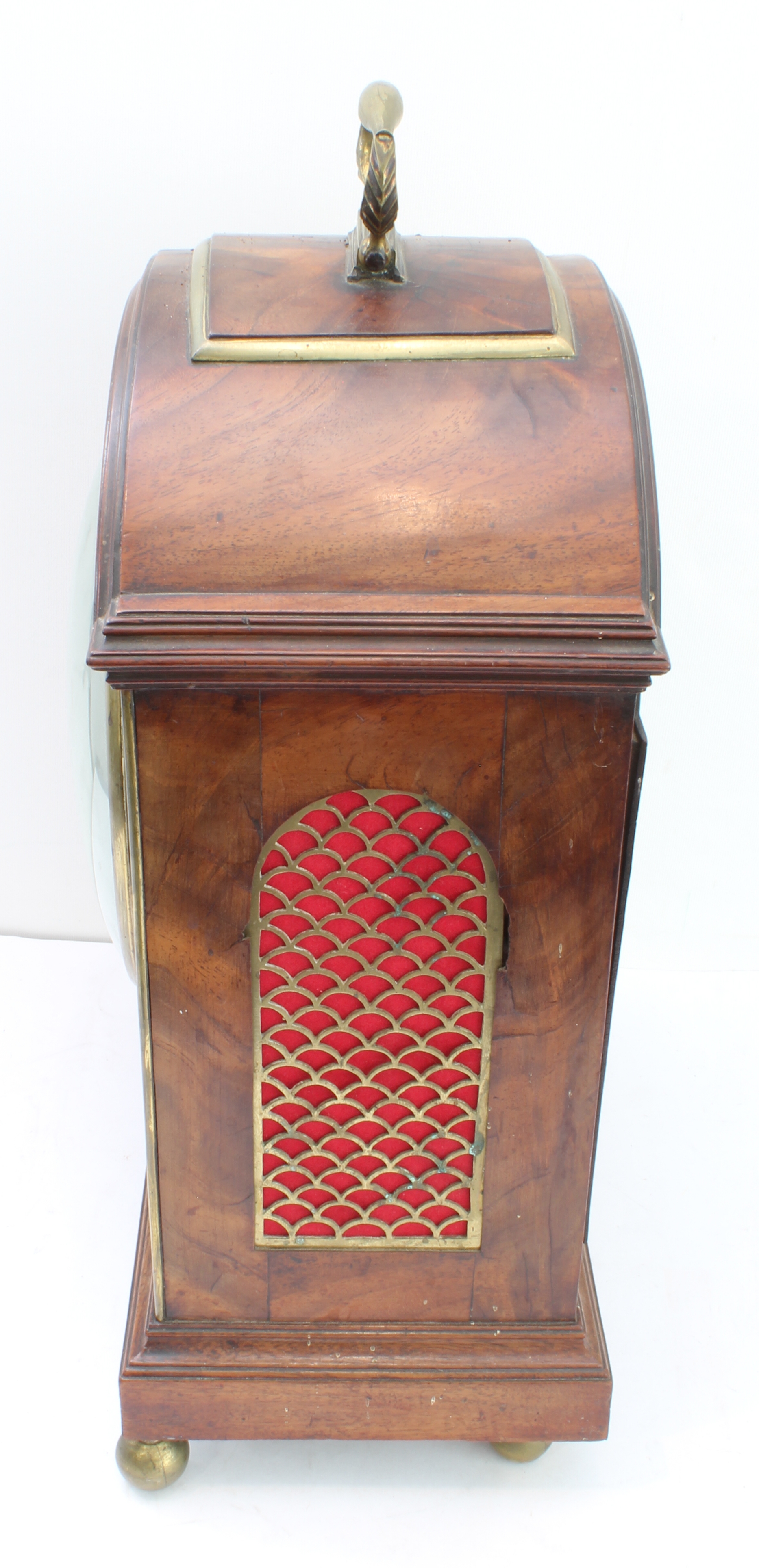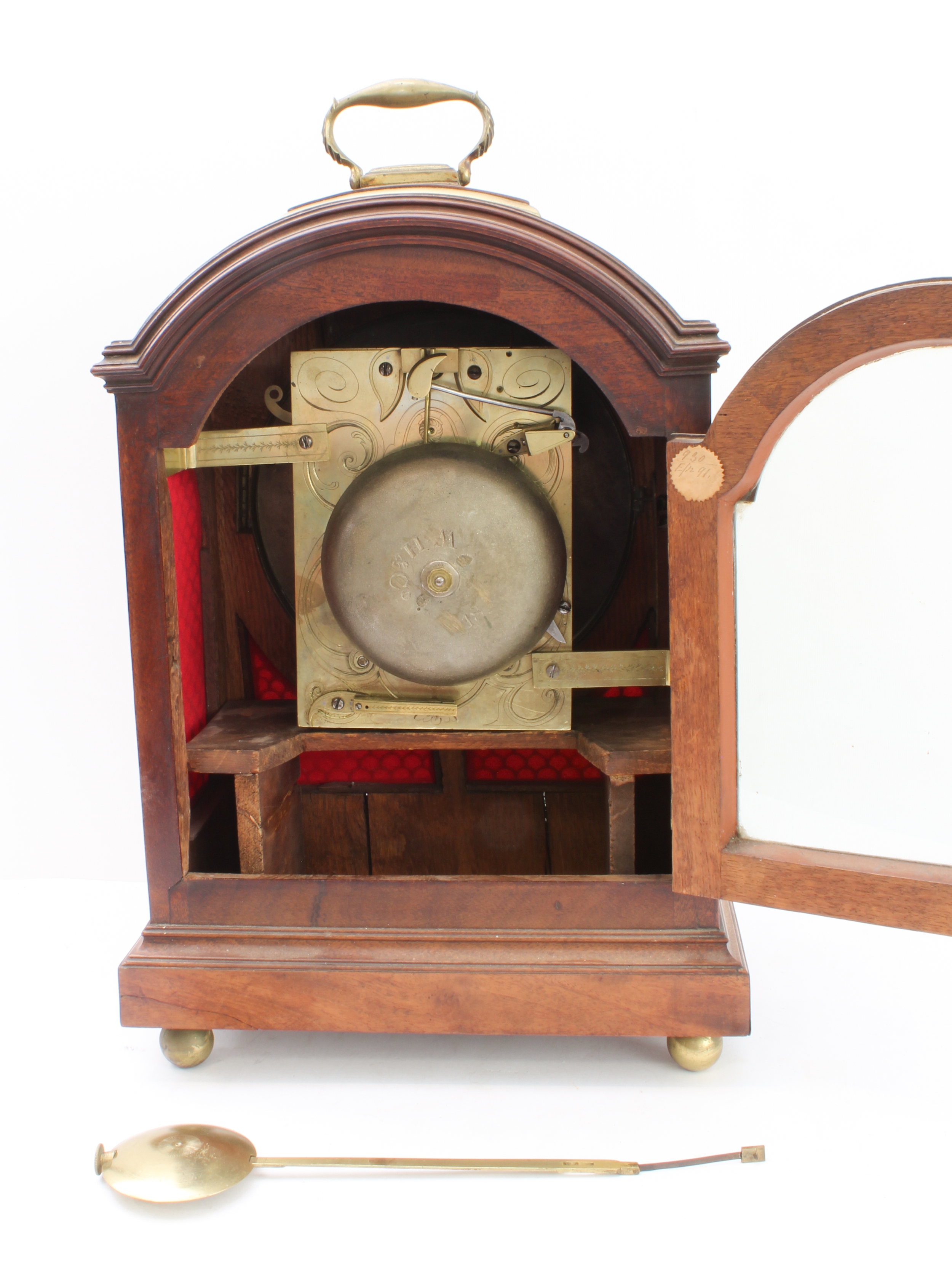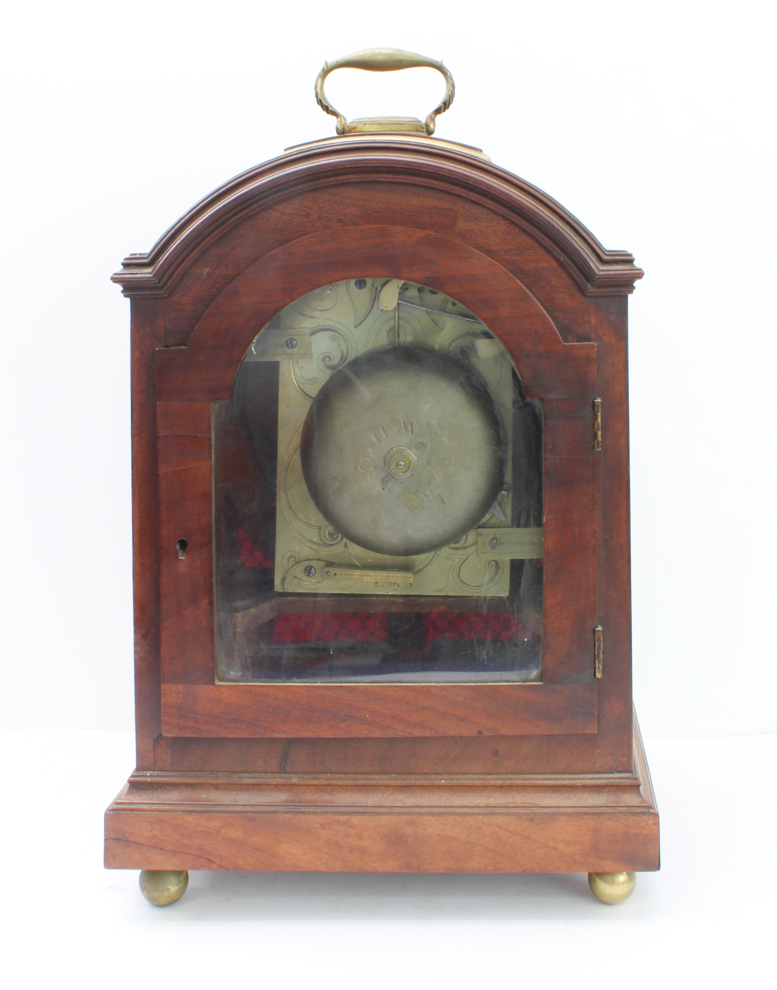 An early 19th century mahogany-cased eight-day bracket clock; the repainted cream enamel dial signed 'I. x S. Farr, Tallow Lane, Bristol' and with Roman numerals; twin fusee movement behind an engraved brass backplate with replaced bell and adapted hammer-strike; arch-topped case with brass carrying-handle; fish-scale pierced brass sound-holes; four gilded spherical feet; with pendulum. (43.5 high x 28 cm wide)