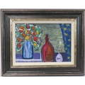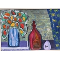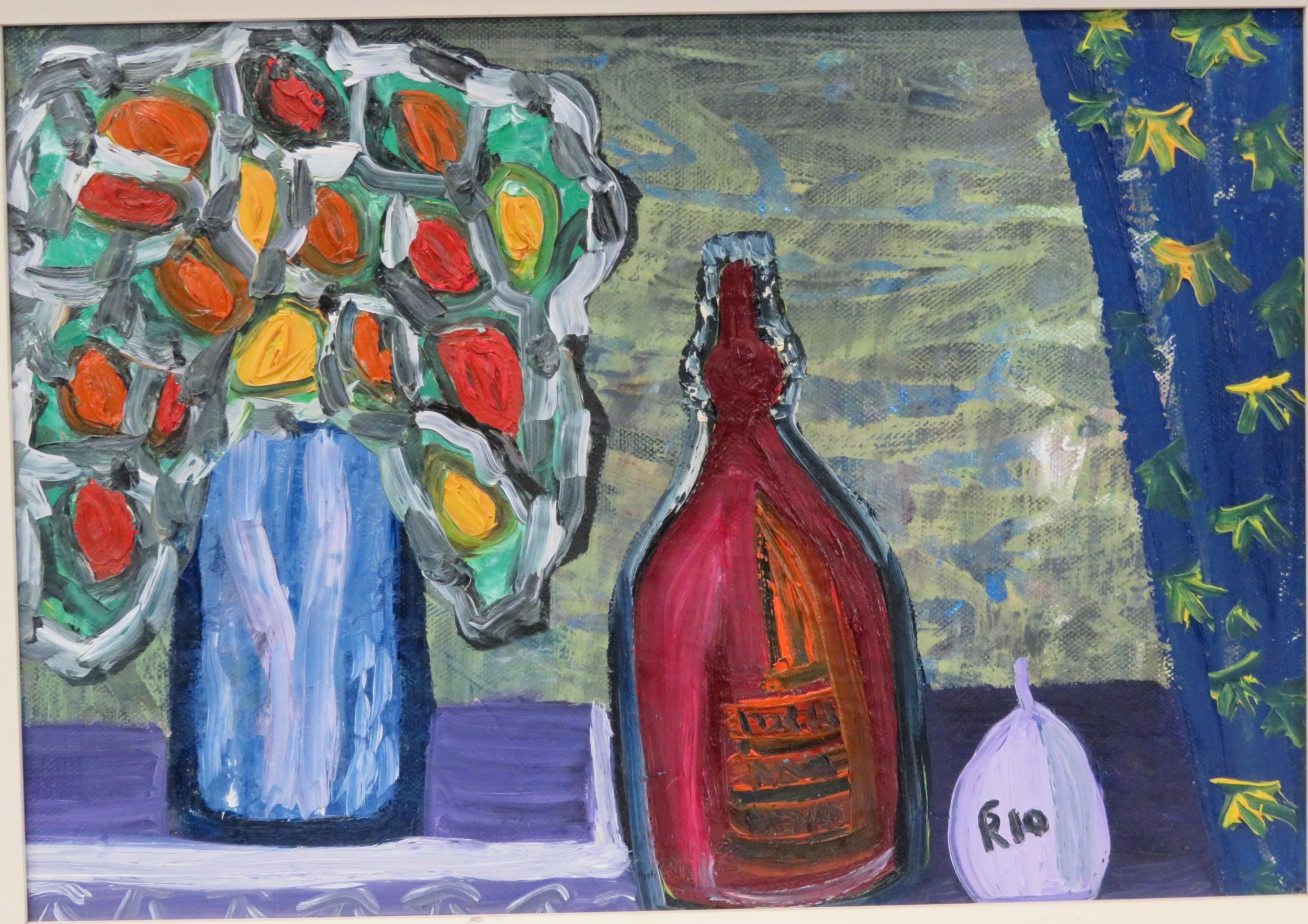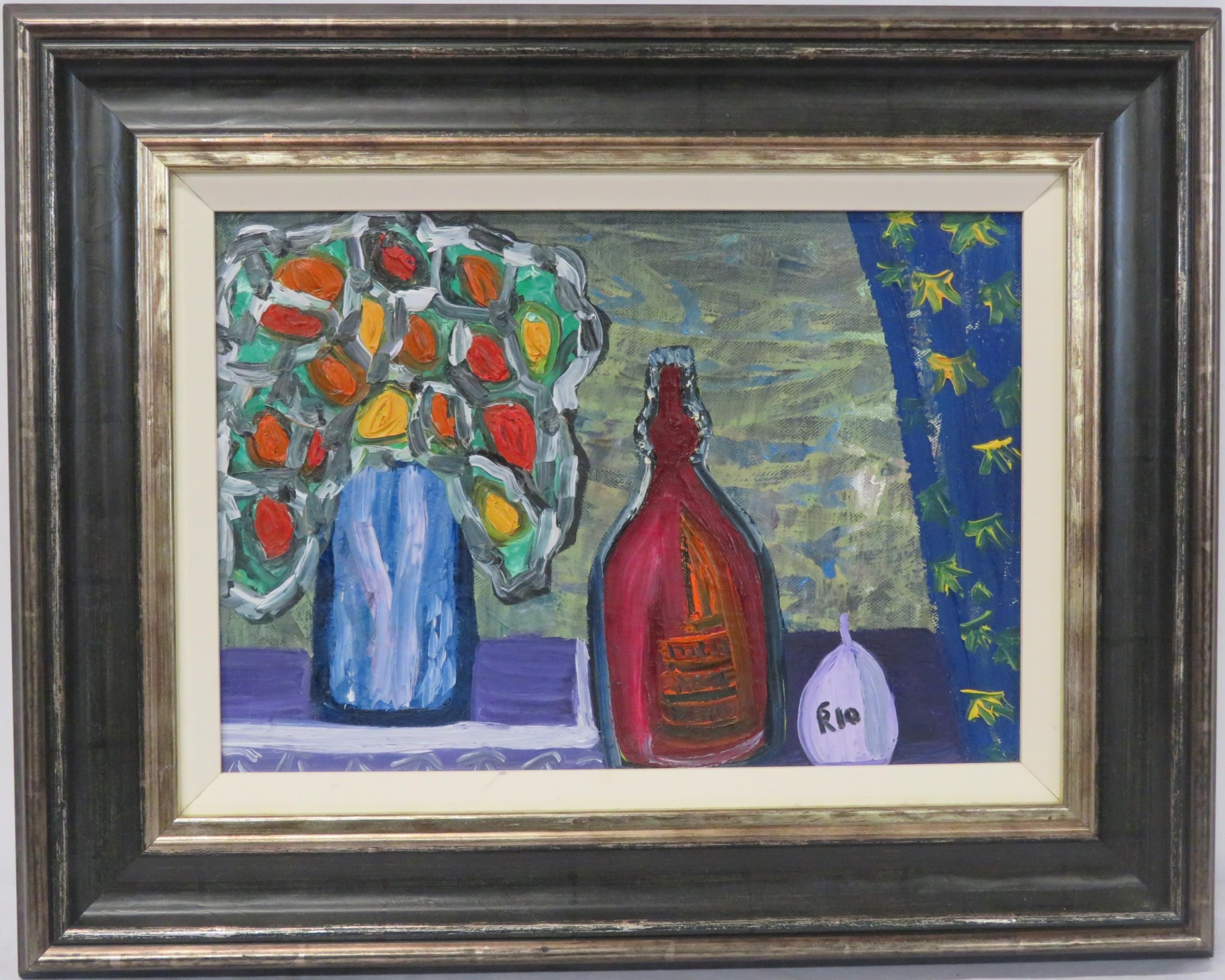 Rio 'Still life study of flowers and a bottle' oil on board 25x35cm signed