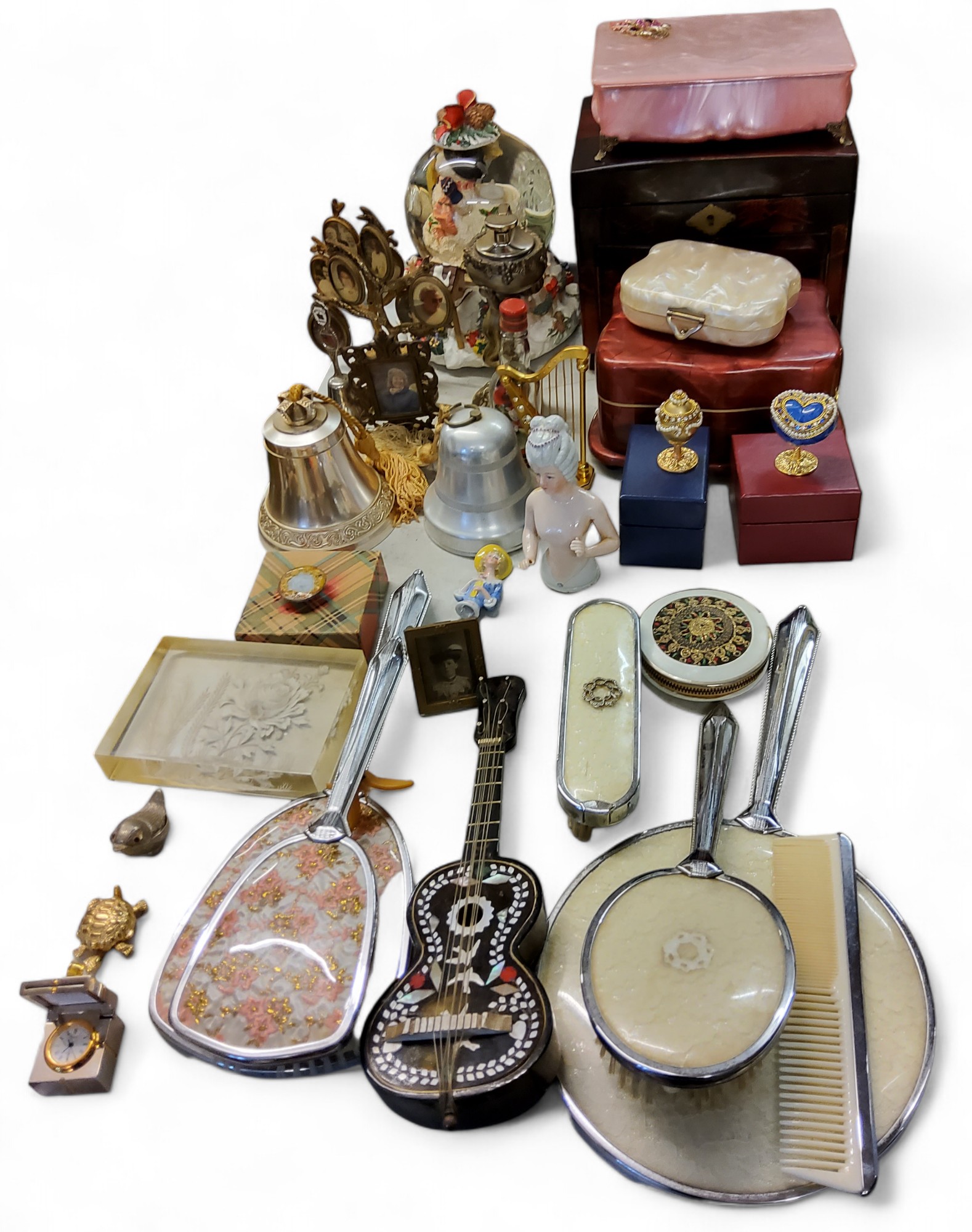 An early 20th century German half-doll; another; dressing table sets; faux tortoiseshell musical guitar; jewellery boxes; etc