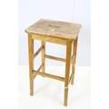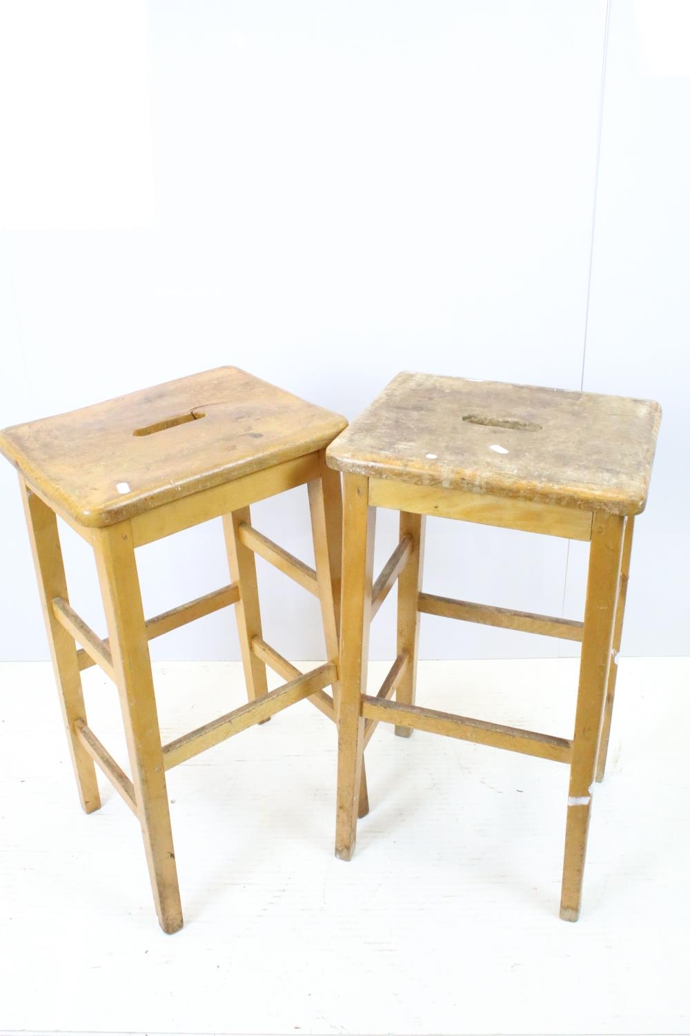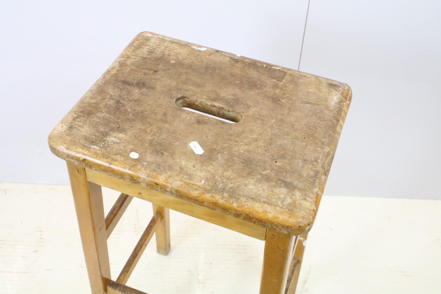 Set of six mid Century vintage wooden lab stools stamped Gomm Bros Ltd to underside of seats.