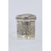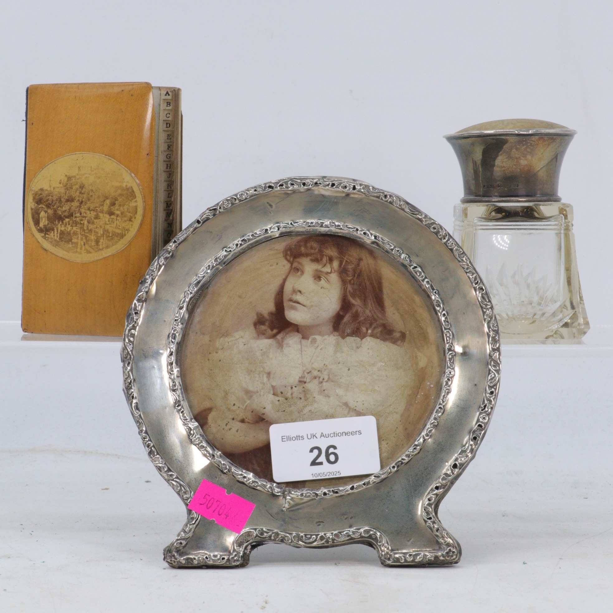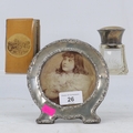 Silver topped scent bottle together with a silver fronted photoframe and a mauchline ware address book