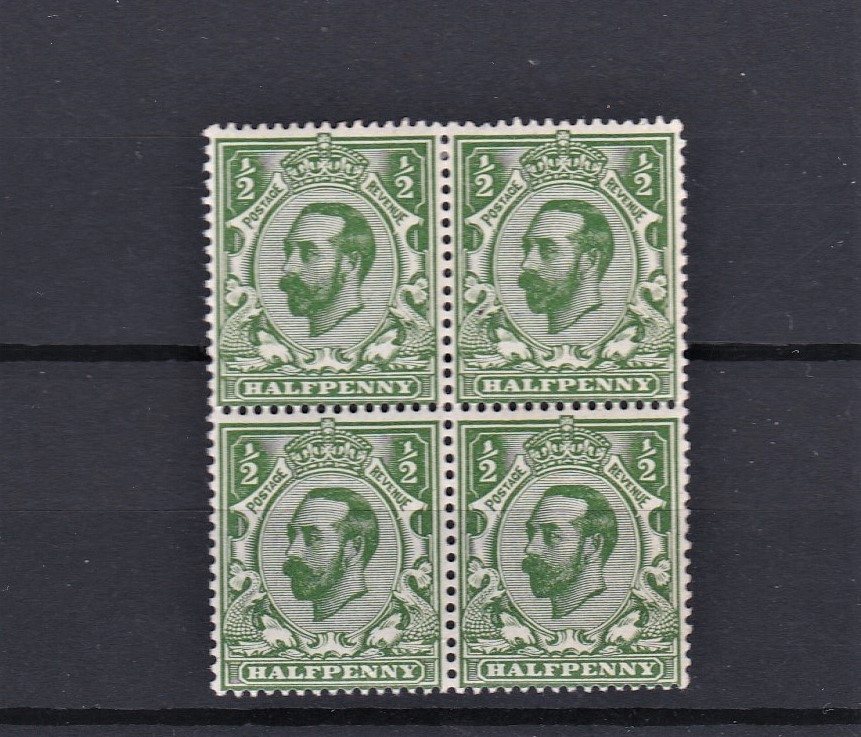 Great Britain 1911 Downey Head 1/2d, deep green, SG N1(3) fresh mint block of four, one very lightly mounted, three u/m. Light gum bands. Cat £200+