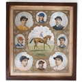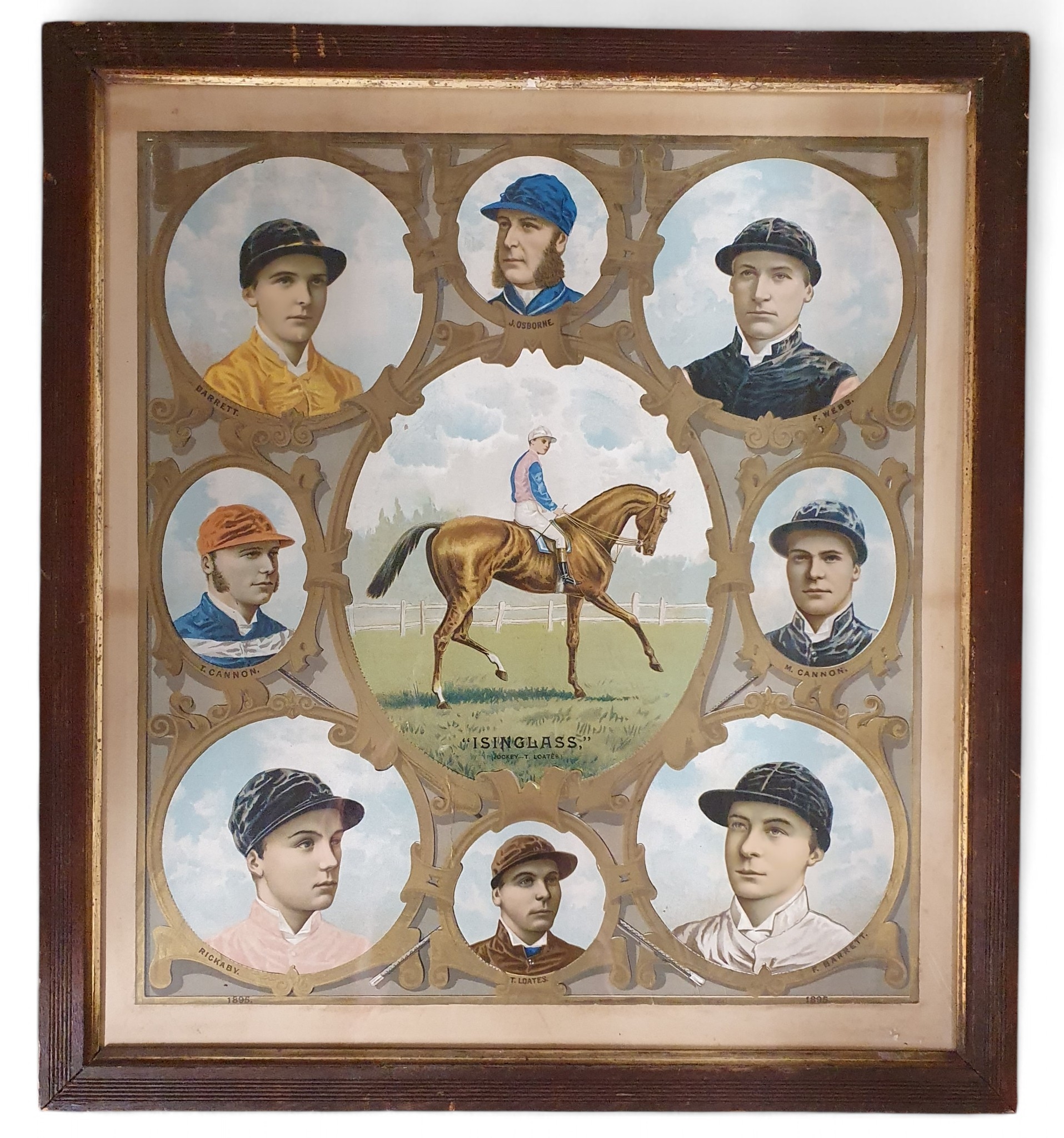 A good late 19th Century coloured collage Print of Isinglass with jockey T Loates and other jockeys, dated 1895. 63 x 57 cm approx.
