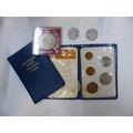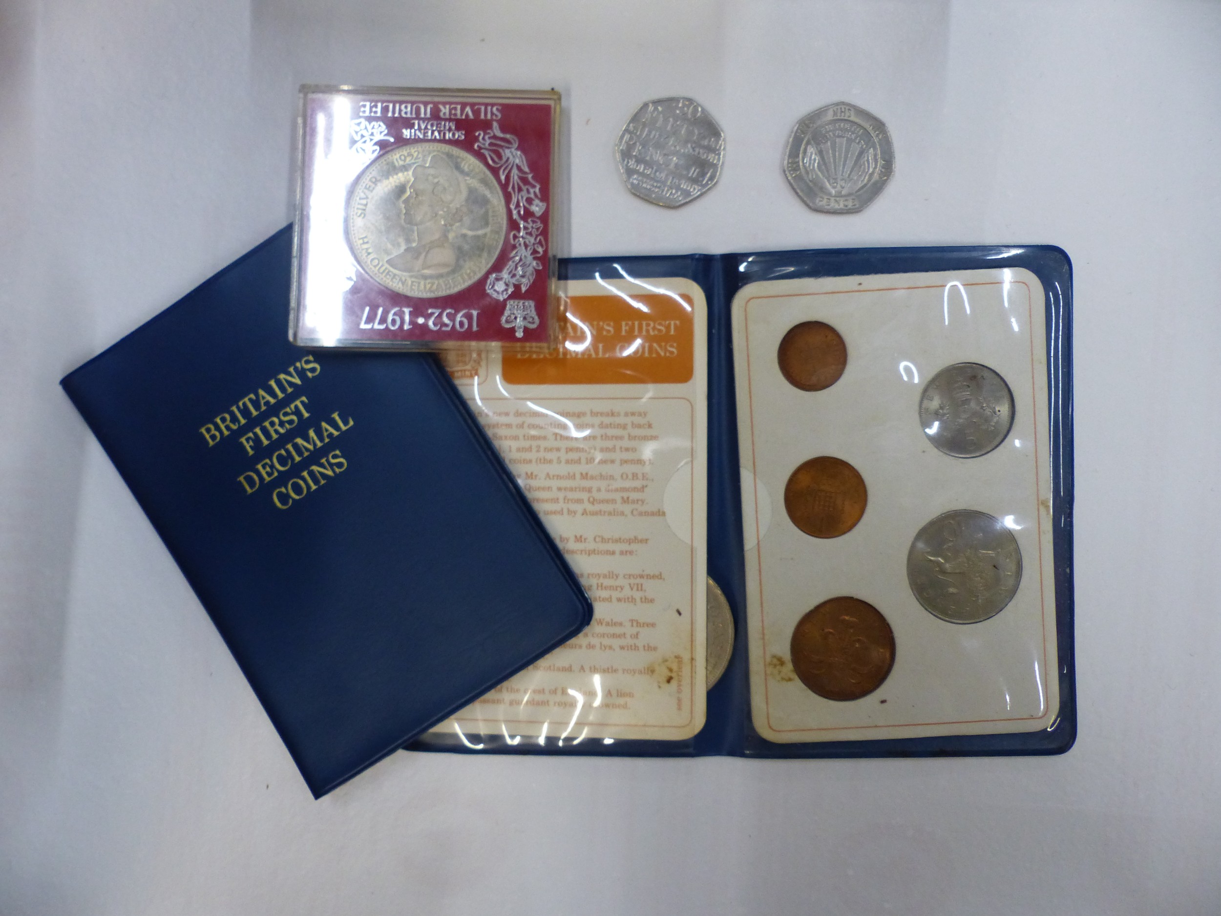Two 'Britain's First Decimal Coins' folder sets, together with 2 collectable 50 pence pieces and a Silver Jubilee Souvenir Medal.