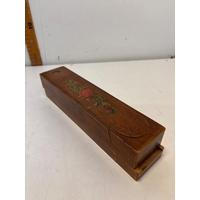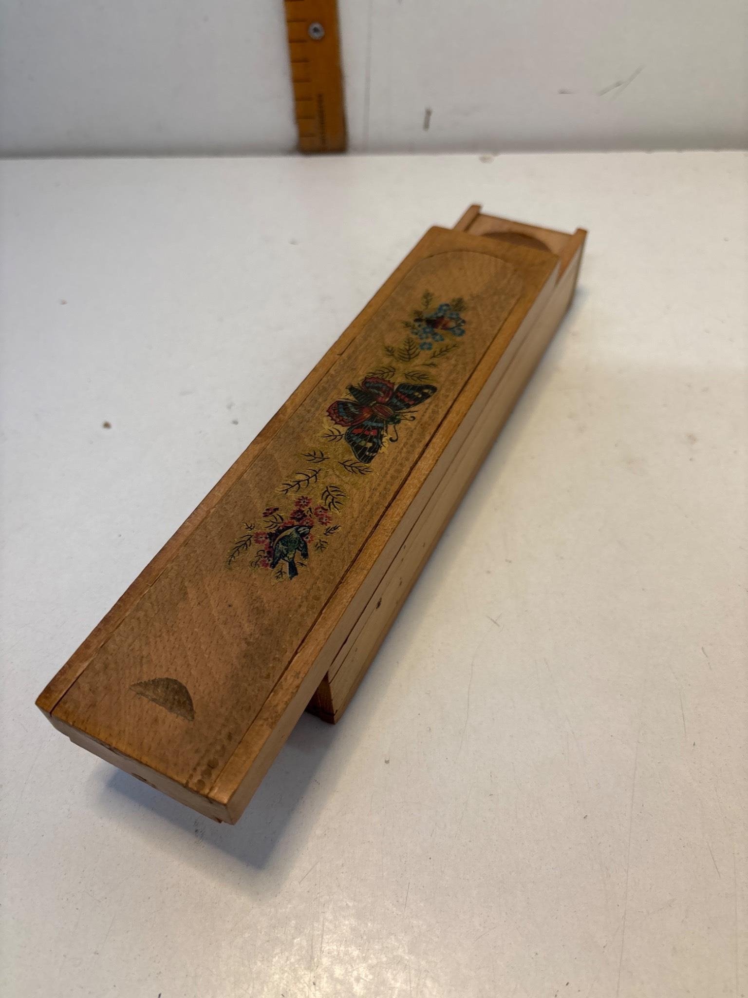 Wooden sliding-lid pencil case with floral and butterfly motif.